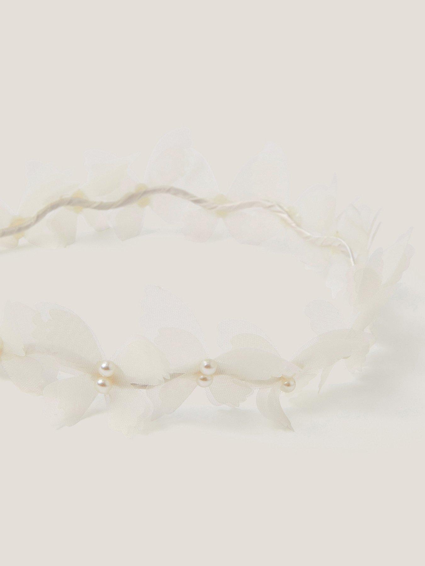 Monsoon Girls Flutter Butterfly Garland - Light CreamPrincess vibes. Move aside tiara, the flower crown is having its moment. Designed with a wiggly metal frame, it's decorated with fluttery fabric butterflies and pearl beads with a ribbon bow fastening at the back. Warning! Choking Hazard - Small parts. Not suitable for children under 3 years old.