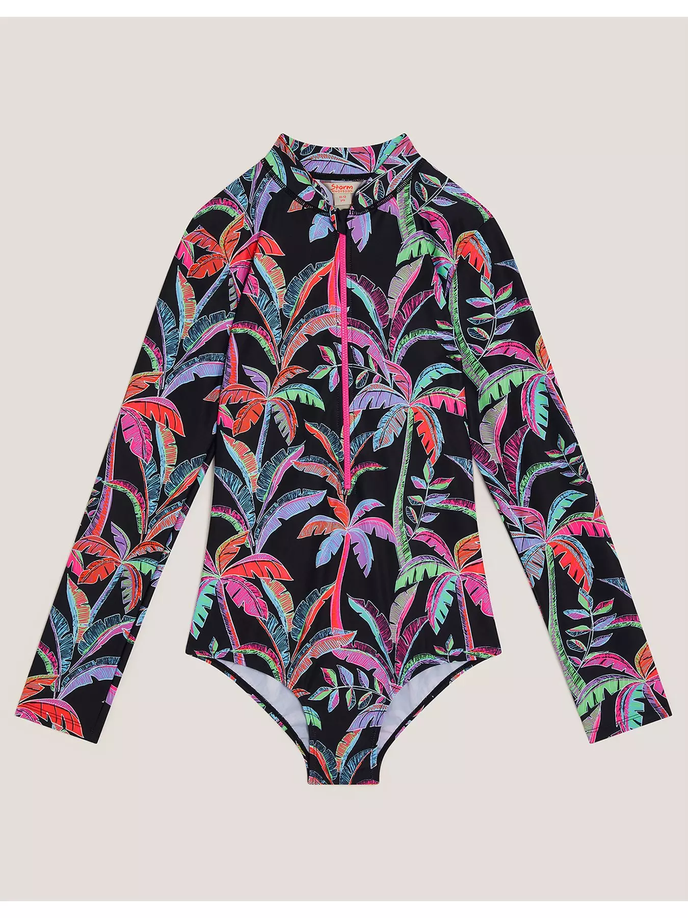 Wanna hit the waves? Whether they're diving to the bottom of the sea to find seashells or paddling out for a surf, this swimsuit works for all their water adventures. It's designed with long sleeves, a front zip closure and palm tree patterns in neon colours. This piece uses UPF50+ fabric that helps to provide protection against ultraviolet solar radiation.Please note that this product can only be returned with the hygiene seal still in place. Black- Material Content: Outer: Elastane 15%, Polyester 2 85%, Lining: Elastane 8%, Polyester 92%