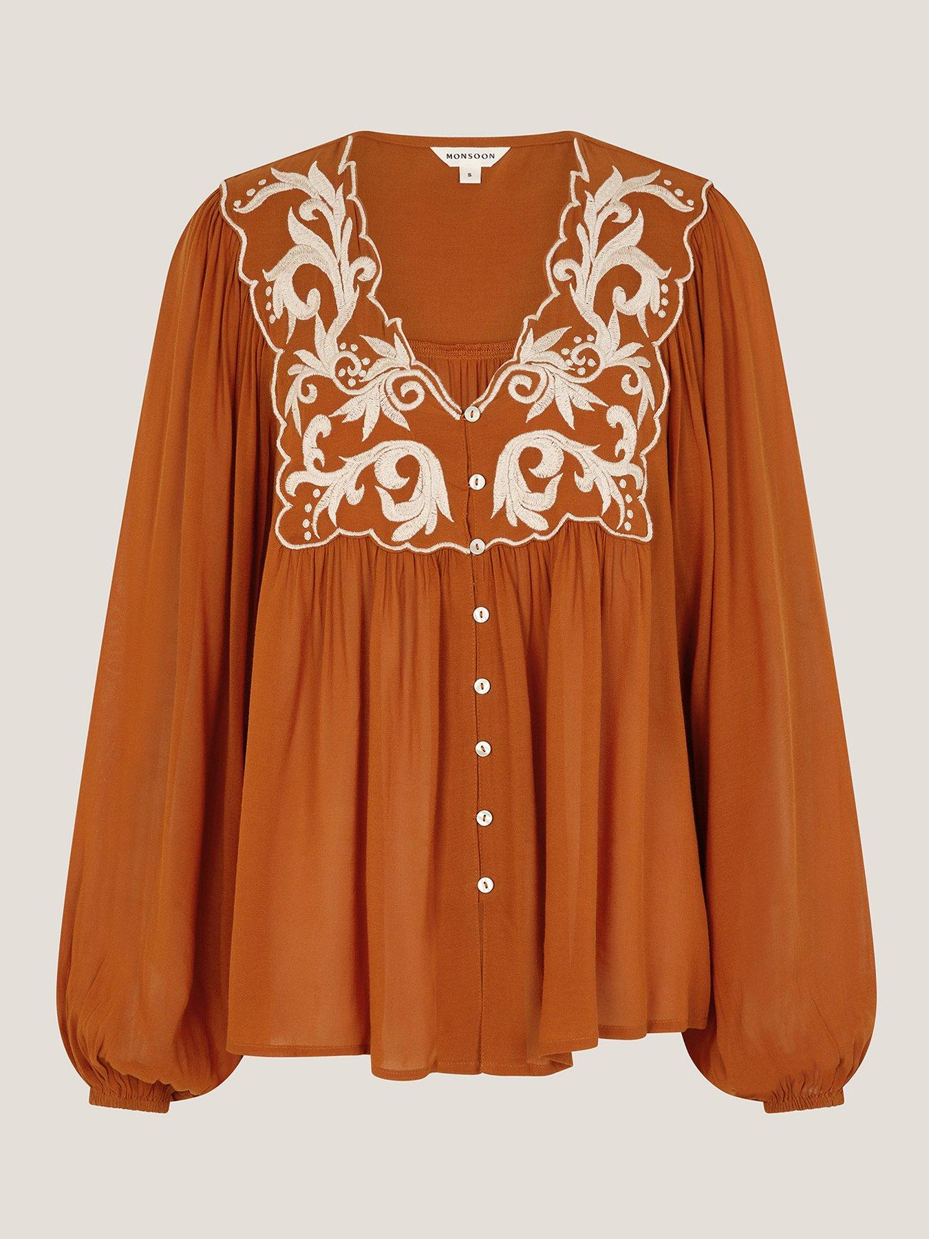 Monsoon Jenna Emb TopA little something up our sleeve. Featuring an embroidered panel and floaty form, this blouse allows for relaxed dressing, no matter how busy your morning is. Finished with a line of mini buttons.