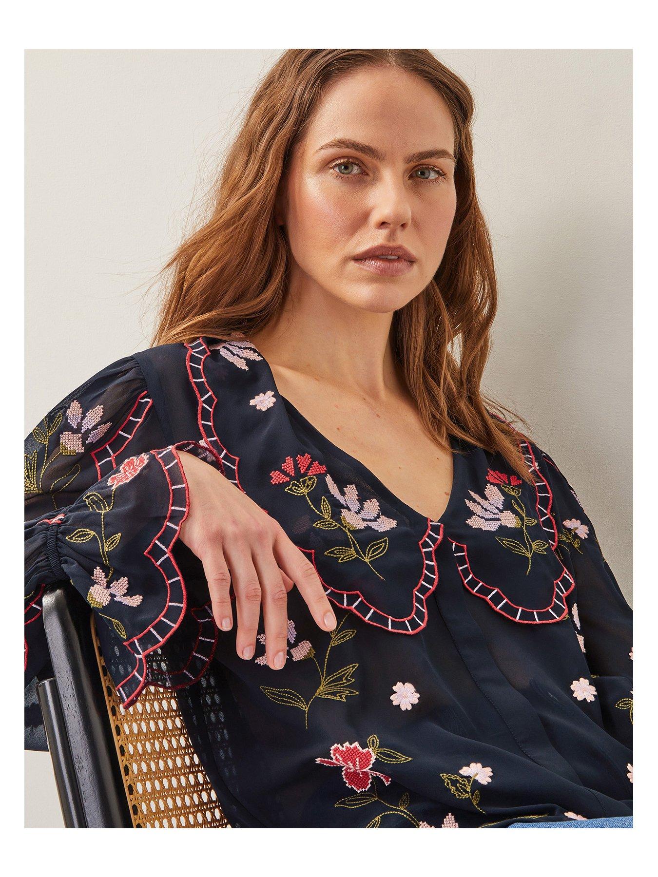 Monsoon Laila Embellished TopA sheer delight. Playful and feminine, this blouse is designed with a statement collar and tapestry-style florals stitched throughout. Finished with front button fastenings.About the brand: Monsoon combines artisanal craftsmanship, beautiful prints and rich colour to create its distinctive look. Drawing inspiration from global influences, the brand designs pieces that feel unique yet timeless. Each collection carries a sense of bohemian spirit and effortless elegance. |