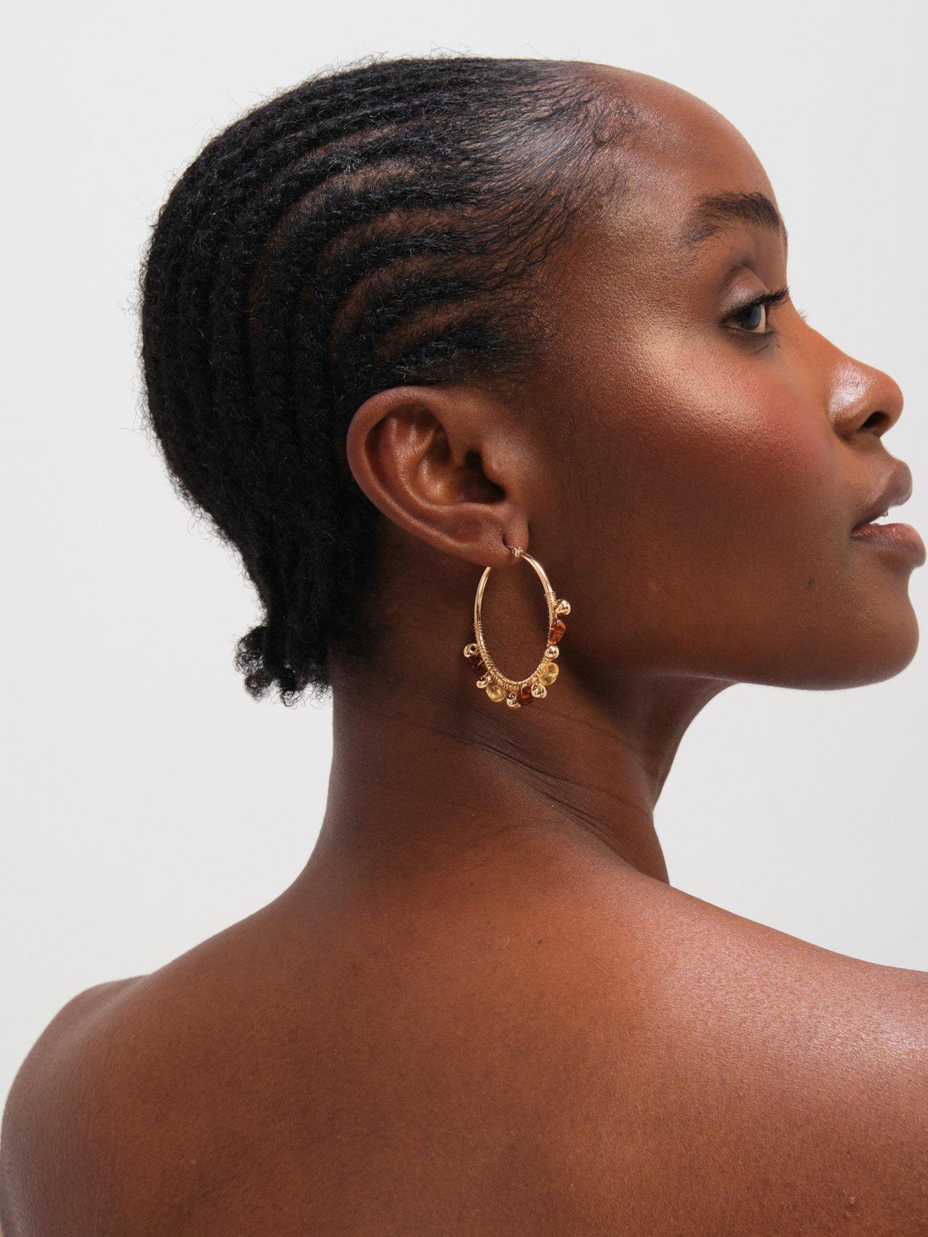 Mood Mood Gold Polished and Resin Hoop EarringsOur Mood Gold Polished and Resin Hoop Earrings are made to standout! Featuring a sleek combination of polished gold elements and smooth resin accents, these earrings offers a chic contrast that elevates any outfit. Fastening: Hoop. Width dimension: 48mm, length dimension: 45mm. Material: Gold plated base metal.