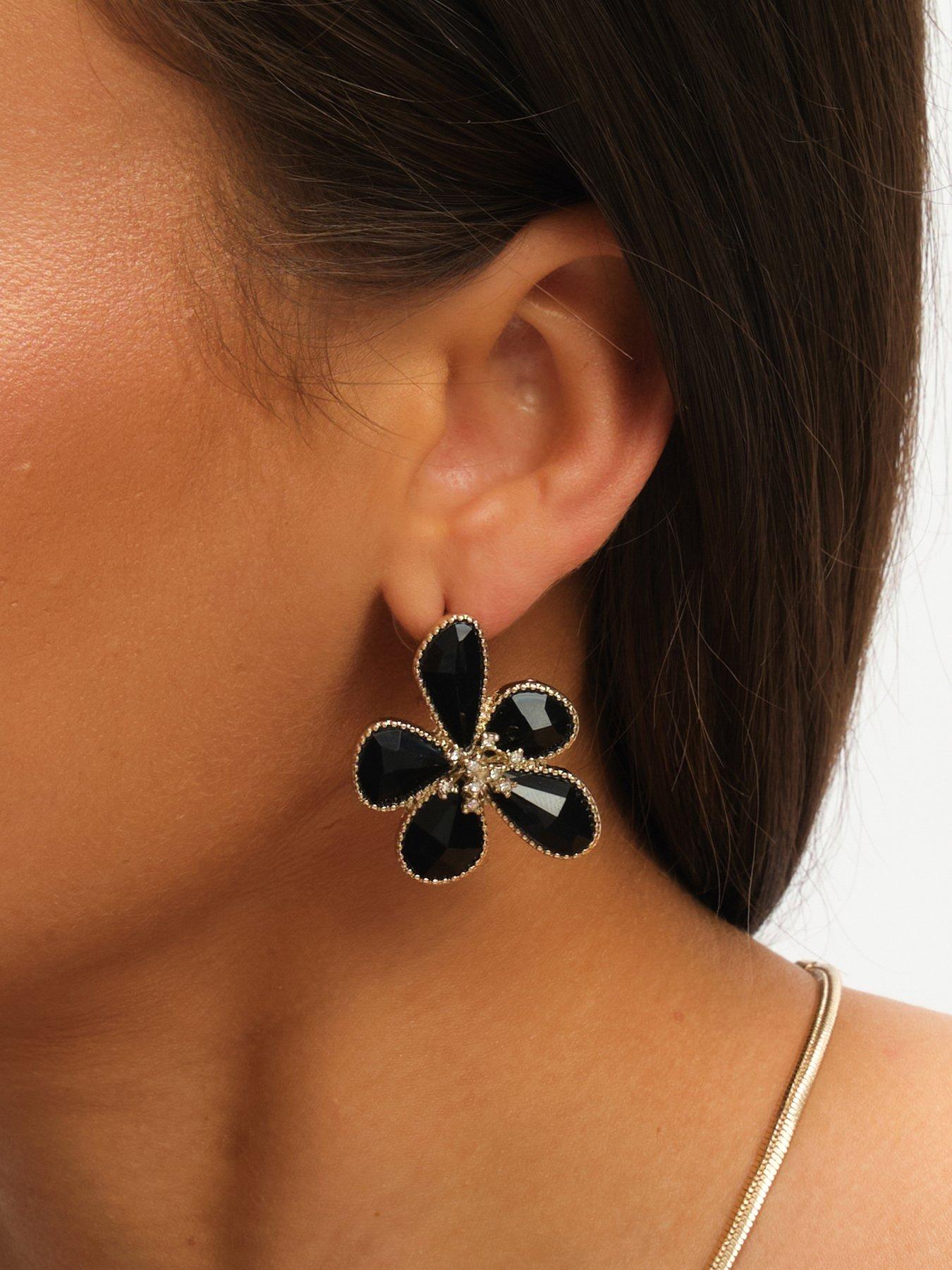 Mood Gold Jet Glass Facet Flower Stud EarringsOur Mood Gold Jet Glass Flower Stud Earrings are made to turn heads. Featuring sculpted florals in a rich jet hue, these studs bring a bold touch to any look. Eye catching and full of personality, perfect for day-to-night styling. Wear them solo to let them shine or pair with other MOOD pieces for a curated statement.