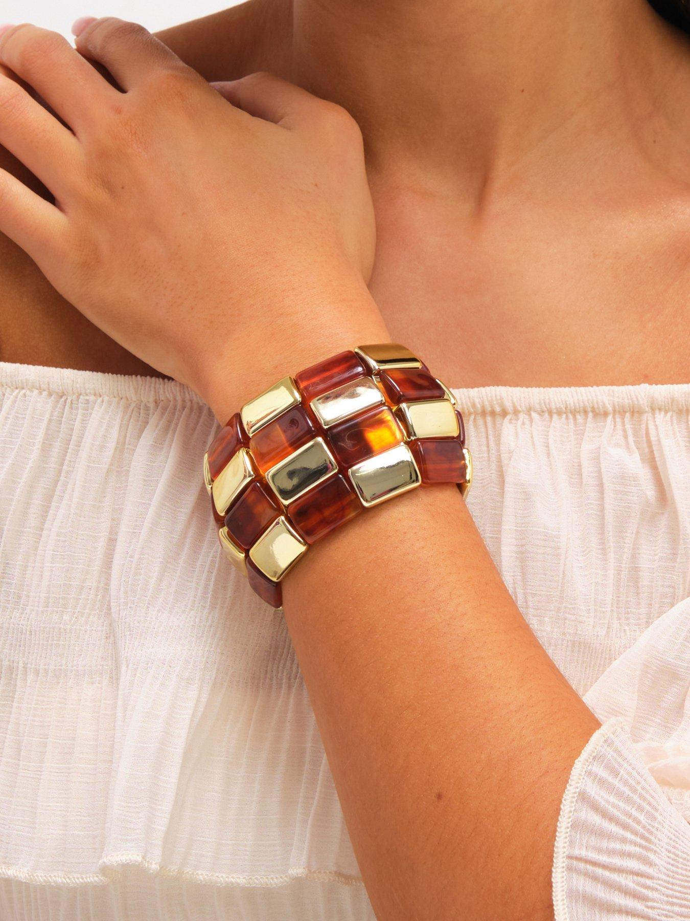 Mood Mood Gold Plated and Resin Statement Stretch BraceletOur Mood Gold Plated and Resin Statement Stretch Bracelet is designed to elevate your wardrobe, Featuring a striking combination of polished gold-plated elements and sleek resin accents, this bracelet offers a contemporary, eye-catching design. Fastening: Stretch. Width dimension: 43mm, length dimension: 35mm. Material: Gold plated base metal.