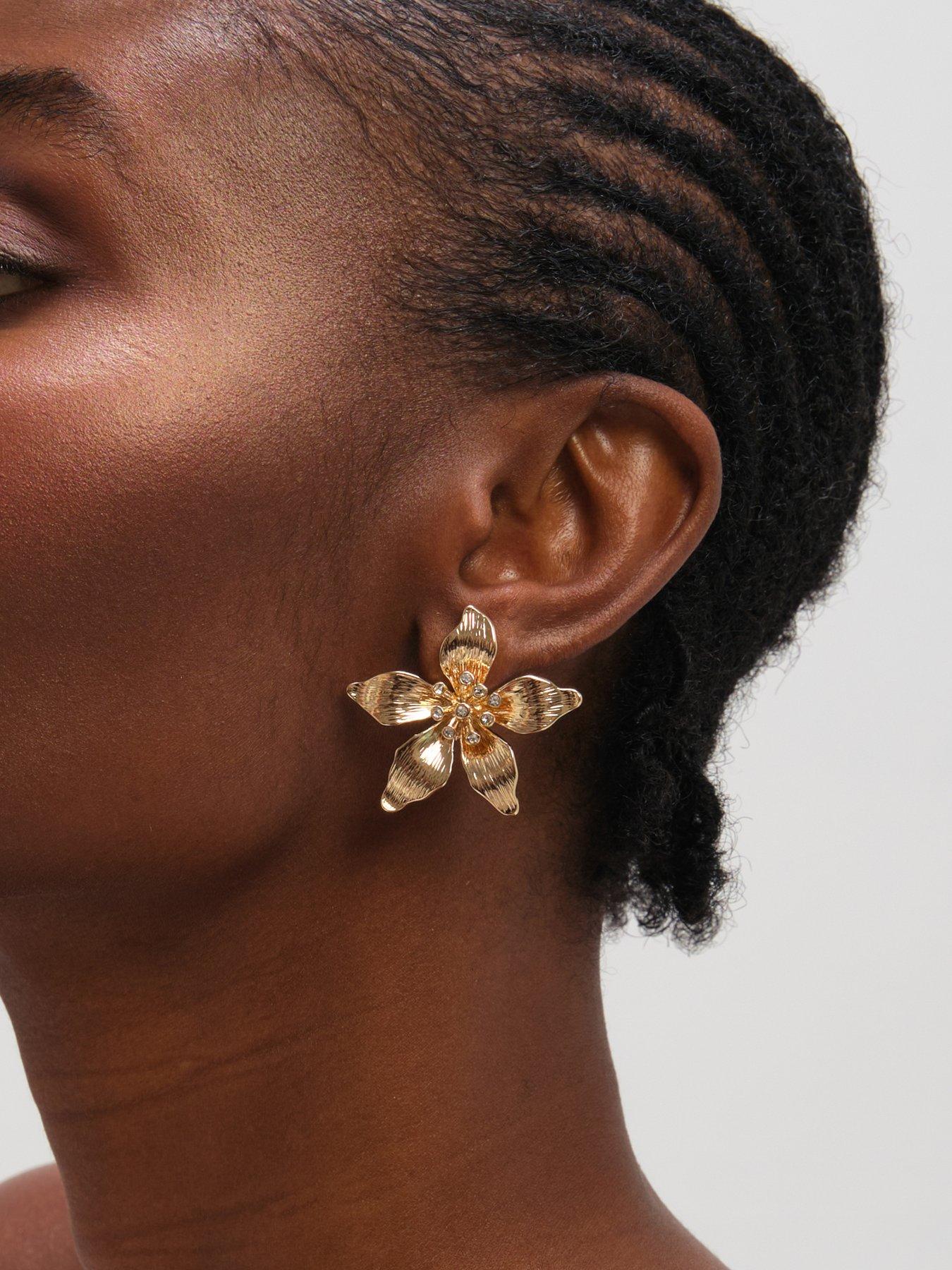 Mood Mood Gold Polished Statement Floral EarringsOur Mood Gold Polished Statement Floral Earrings are designed to stand out. With bold blossoms and a gleaming polish, they will adds elegance to any outfit, perfect for special occasions or elevating everyday style. Fastening: Post and bullet back. Width dimension: 38mm, length dimension: 35mm. Material: Gold plated base metal.