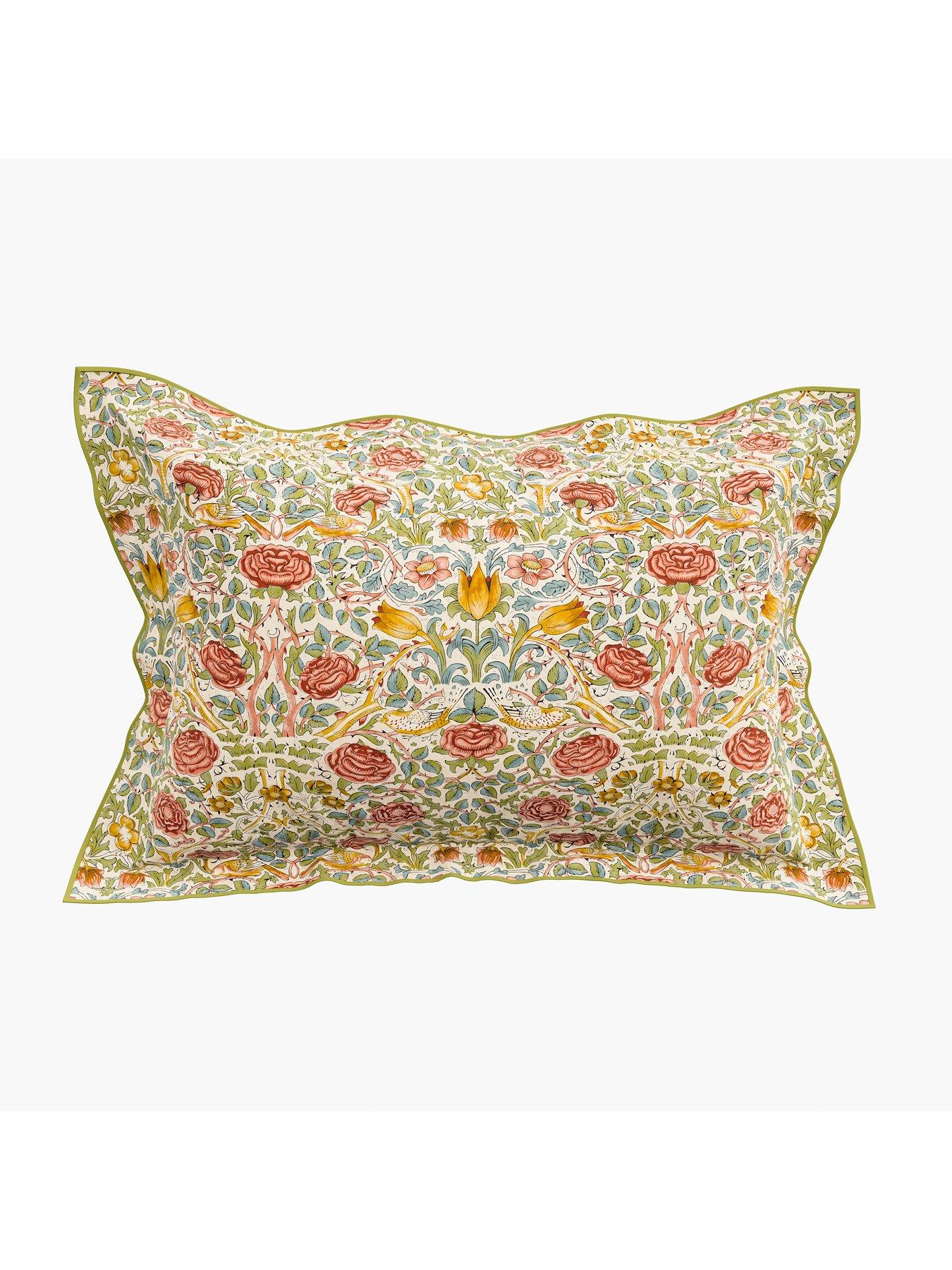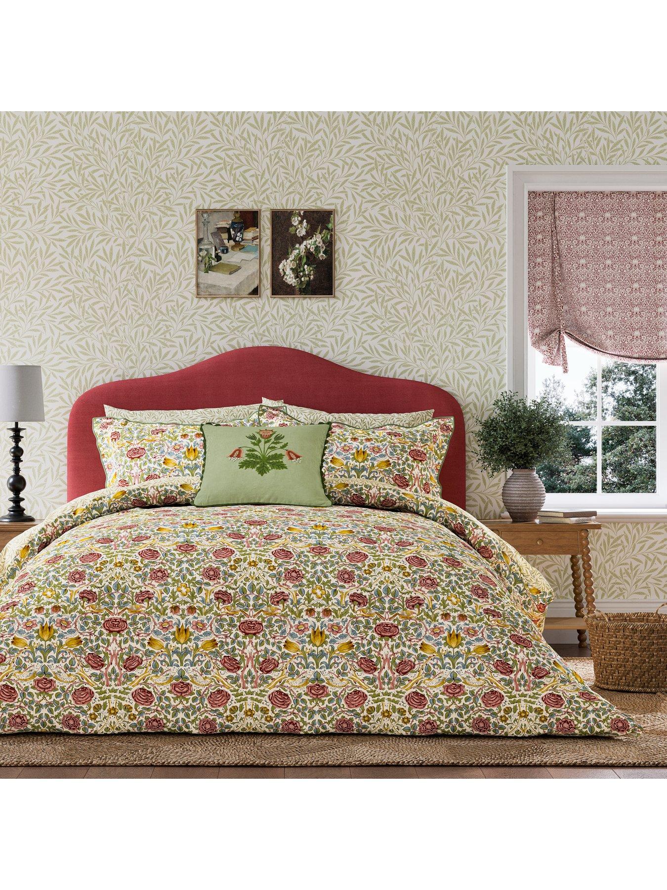 Rose Cover Set 100% Cotton Boughs Green/RoseRearing tulip heads alongside vibrant roses with dramatic thorned stems populate this intricate design, originally from 1883. William Morriss careful observation of nature underwrites the themes of this beautiful design, translated onto duvet sets with 100% cotton percale and a luxurious 220 thread count. In Boughs Green, this duvet makes a delightful addition to any nature-lover or Arts & Crafts fans bedroom scheme.