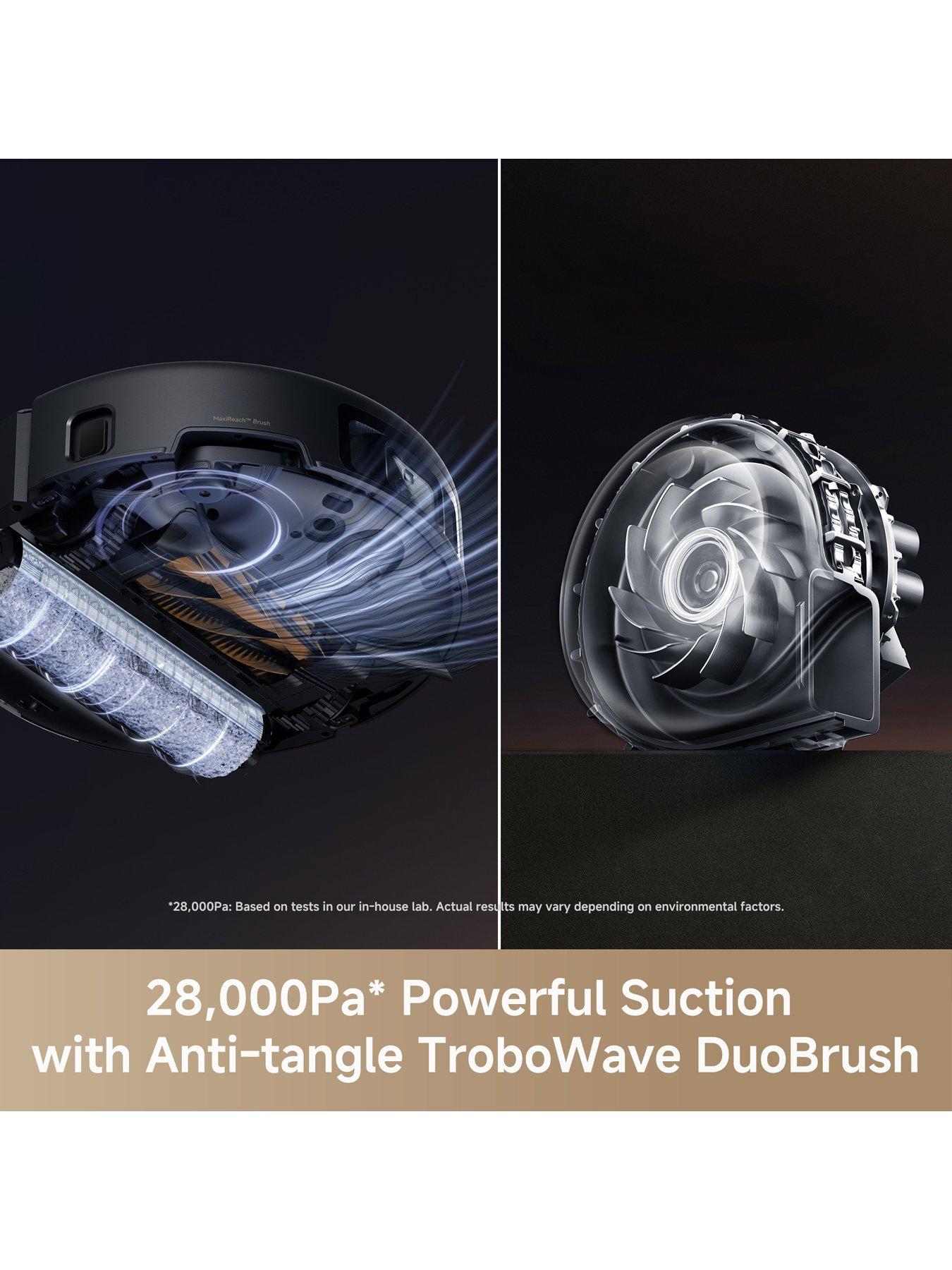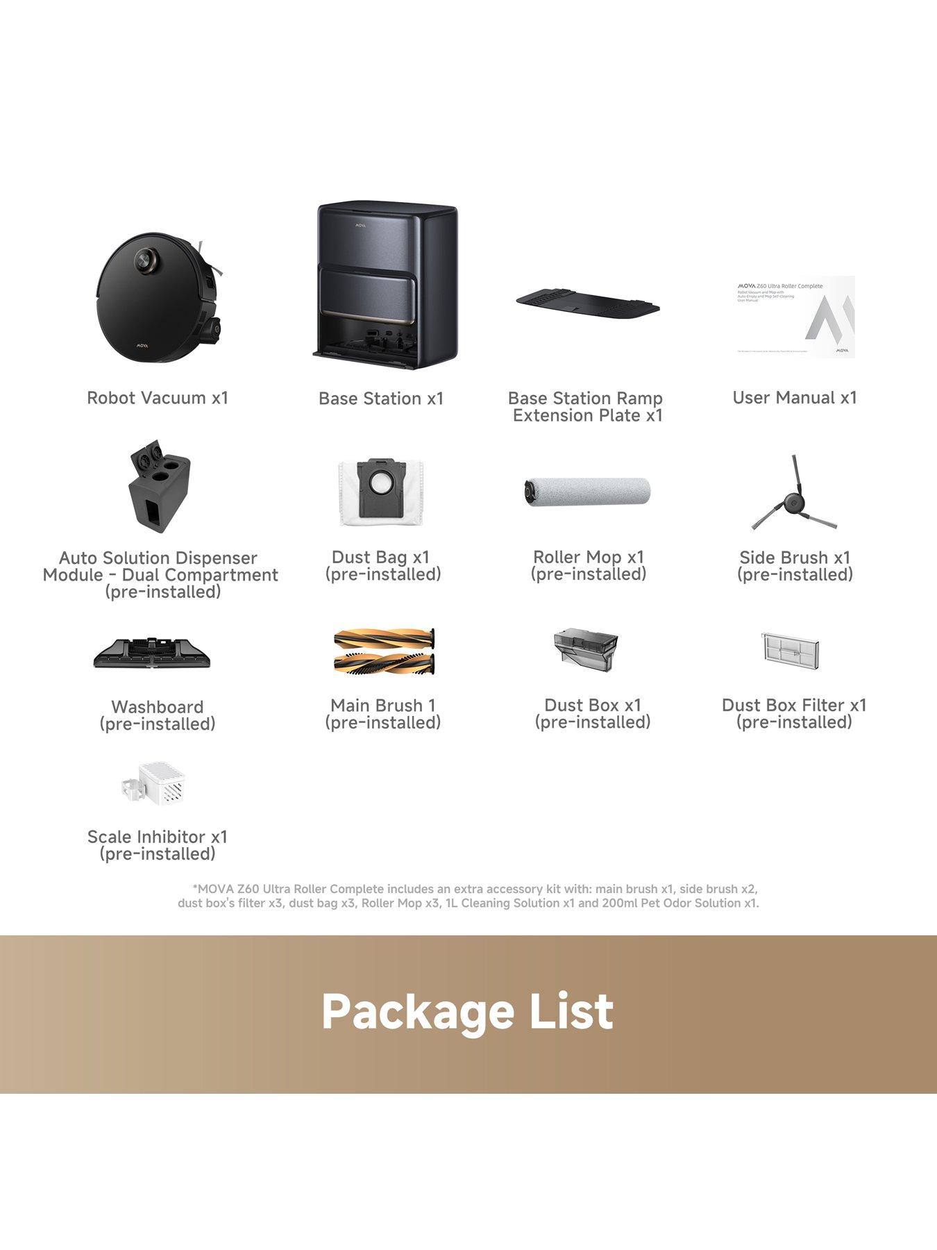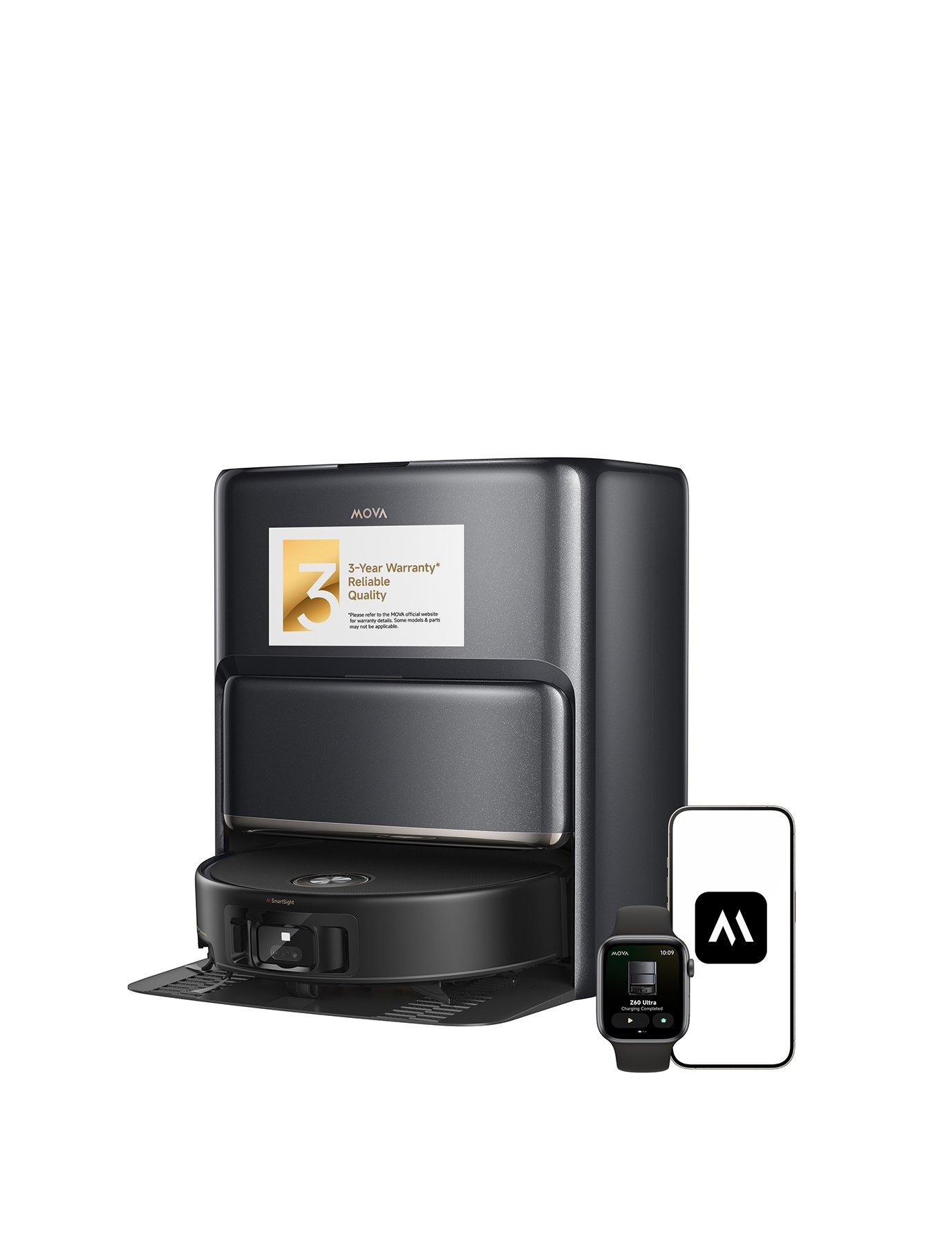 Mova MOVA Z60 Ultra Roller Complete Robot BlackPowered by TurboForce 9 high-speed motor, MOVA's Z60 Ultra Roller Complete features 28,000Pa powerful suction that easily captures hair, dust, and up to 99% of large debris. Anti-tangle TroboWave DuoBrush combines a pure rubber brush and a rubber-bristle brush to tackle hard floors and soft carpets respectively, with cantilevered spiral roller design for powerful pick up with minimal tangles. HydroForce Mopping powers real-time clean water spray, rinsing the mop while removing dirty water to minimize cross contamination.AutoShield Technology instantly detects carpets, retracts the mop, and deploys shields to block the roller to ensure dry and clean carpets in a single pass. The MaxiReach Brush dynamically extends to sweep up dust, hair, and debris, achieving 99.99%* edge coverage whilst the MaxiReach Mop can extend by a further 4.1cm, working with edge-laser navigation and HydroForce Mopping to clean tight corners and along walls with power and precision. StepMaster 2.0 allows the Z60 Ultra to easily cross over steps, thresholds, and small obstacles works alongside the AI-Powered LiftPro Chassis Lift to avoid it getting stuck on low obstacles such as shaggy rugs or dragging debris. FlexScope Navigation provides 360° mapping & smart spot cleaning to plan better paths, and target messes with pinpoint accuracy. Its low profile and Dual-Laser 3D Structured Light with Side-Edge Laser allows to spot messes which go unseen, fitting into tight spaces and cleaning with ease. CleanGenius Auto Recommendations detect carpets, boost suction, and target edges like curtains and corners. Built-in AI Voice Assistant allows you to start your cleaning session and set your ideal settings with ease.