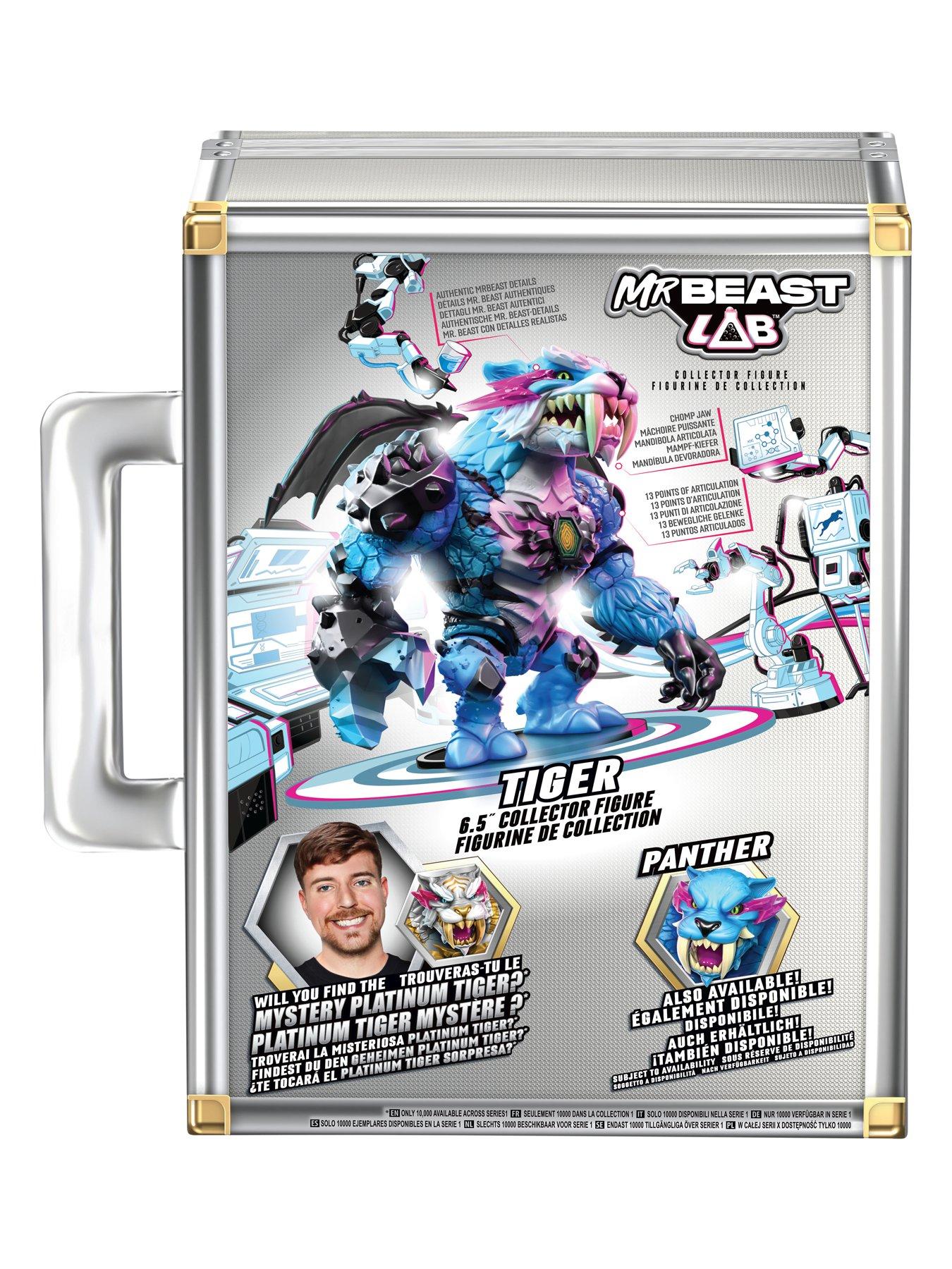 MrBeast Labs MrBeast Lab Apex Beast Collector Figure. Apex Beast Tiger.Take your display to the next level with the ULTIMATE MrBeast Lab Tiger Collector Figure. Prepare to be amazed as you reveal your Collector Figure Tiger by lifting off the iconic MrBeast briefcase sleeve. This Tiger apex predator embodies the perfect balance of strength and untamed agility, crafted to be the most EPIC beast of all time. Standing tall at 6.25' (15.8cm), the MrBeast Lab Tiger Collector Figure features extreme detailing, premium packaging, and 13 points of articulation. But wait, there's more. Control its chomp jaw for an EPIC attack. Plus, hidden within the collection are 10,000 Platinum Tigers, will you discover one of them? Be the envy of collectors by showcasing your MrBeast Lab Collector Tiger in your collection. Get yours today and elevate your display.