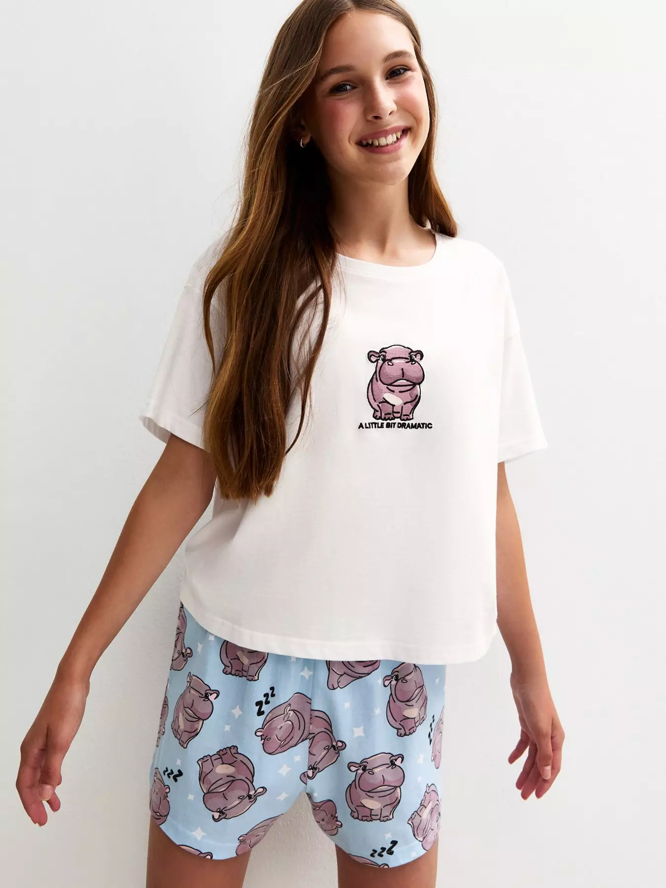 - Girls Hippo Print Pyjama Shorts Set by New Look 915
