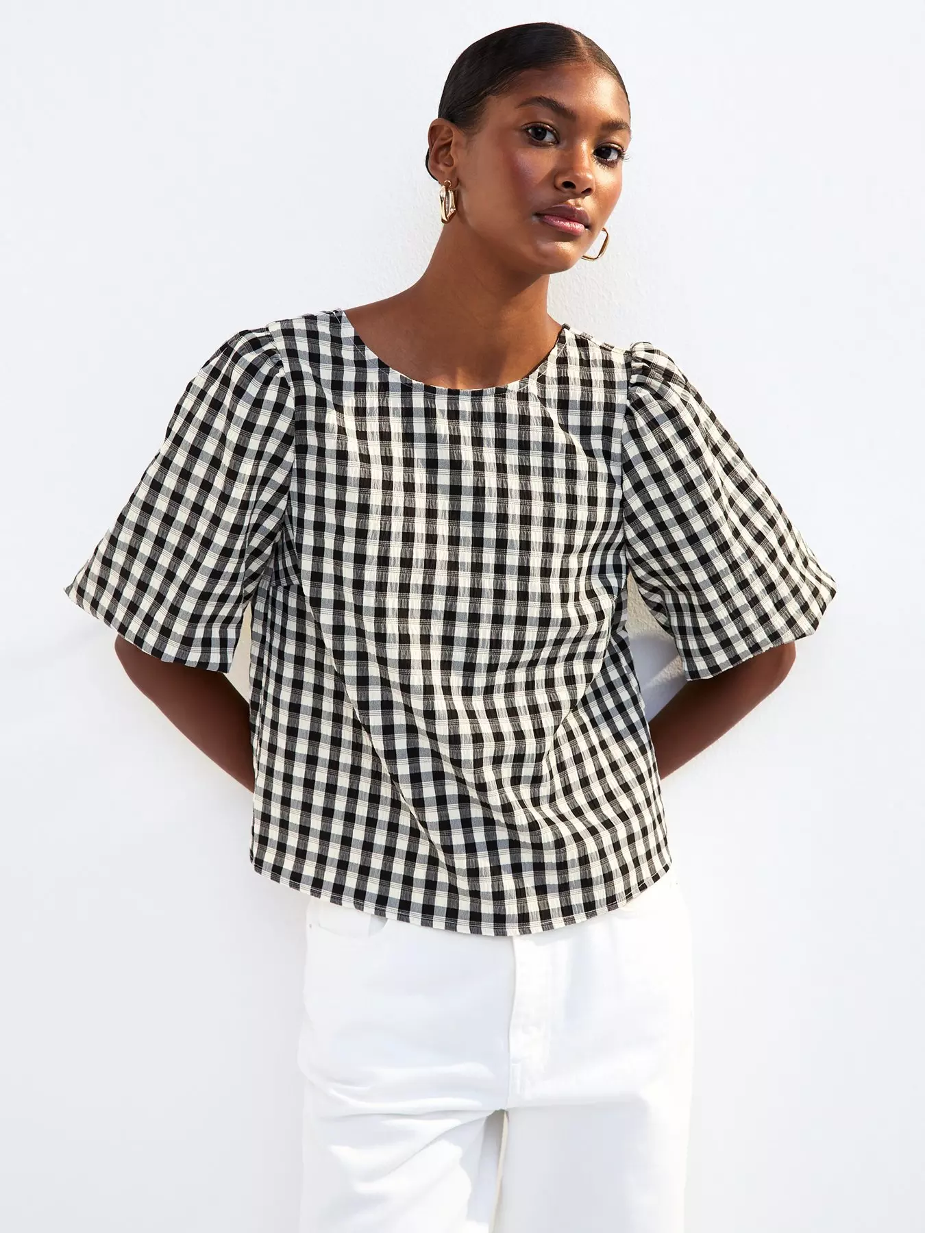 New LookBlack Check Pattern Bow Back Puff Sleeve Top