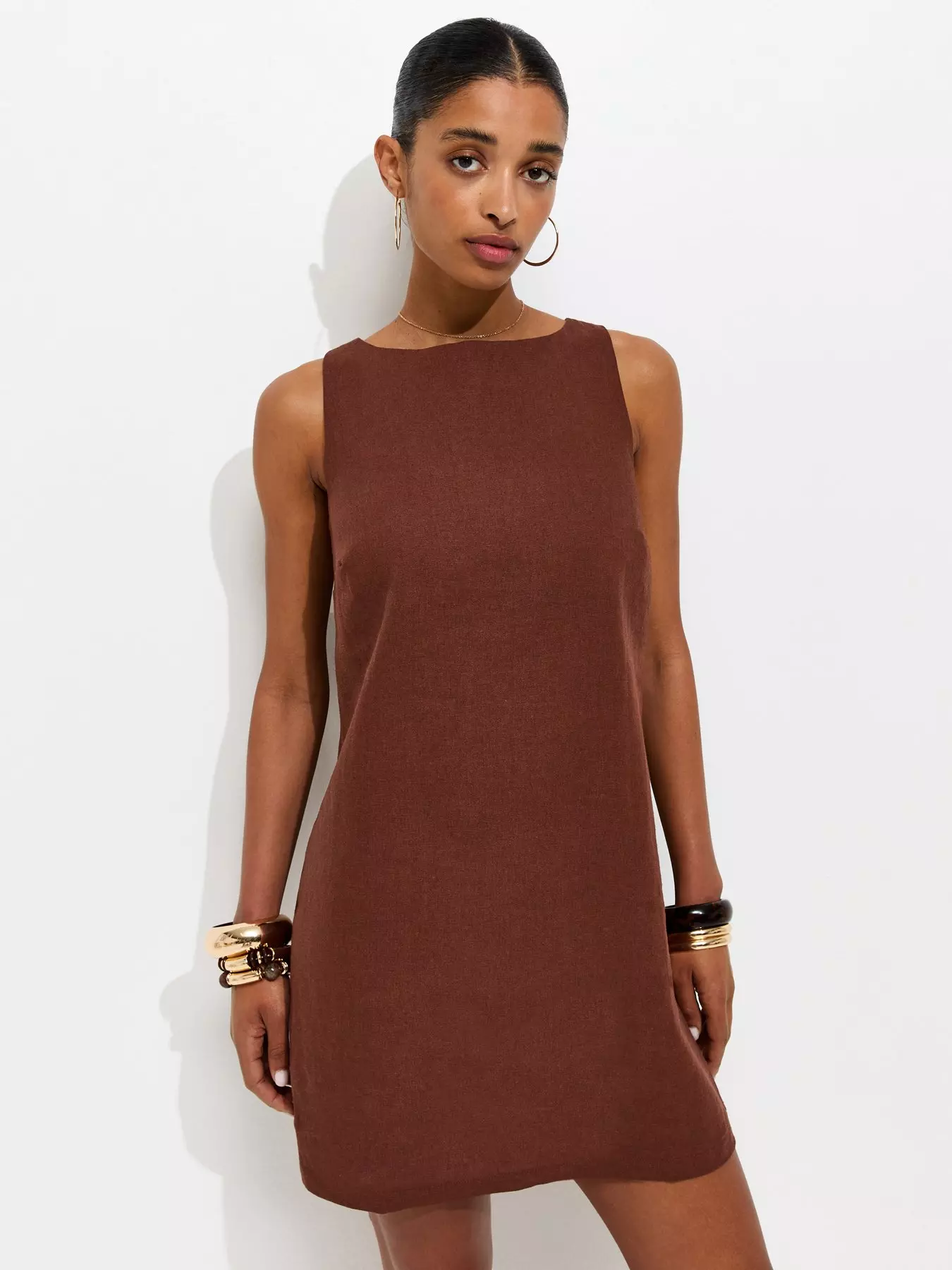 New LookDark Brown Linen Blend Tie Back Mini Dress