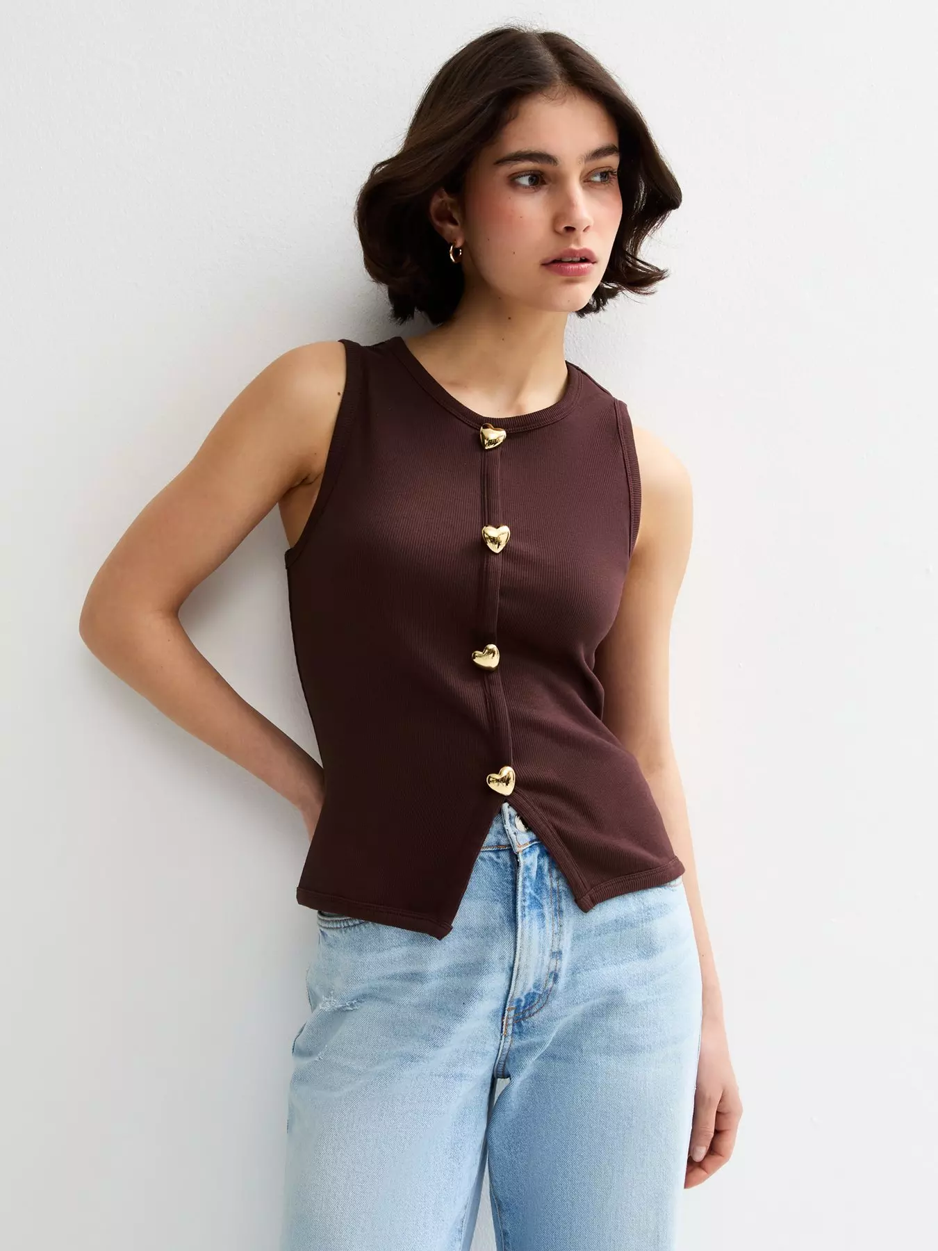 - Heart Button Ribbed Vest Top - Dark Brown by New Look