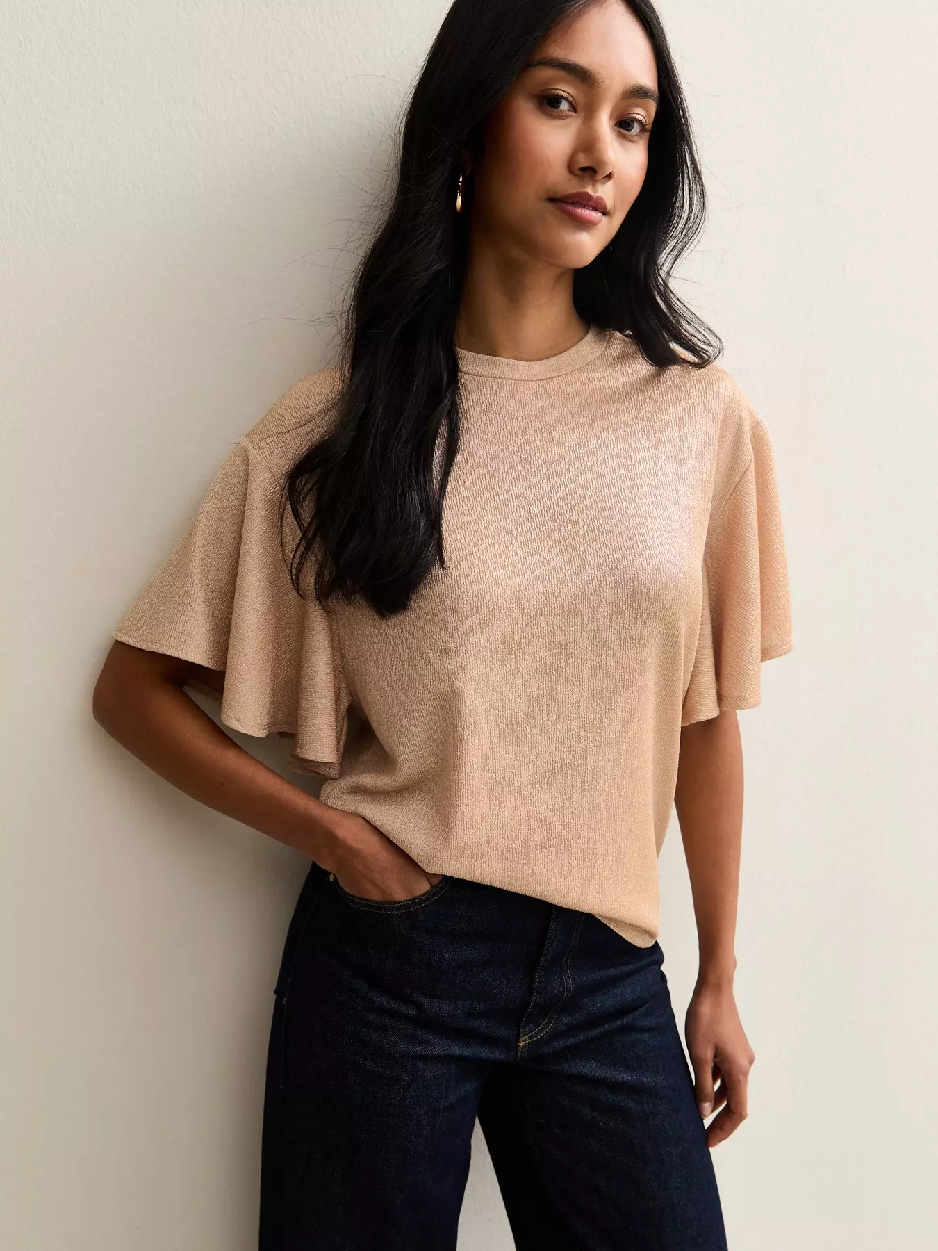 New LookRose Gold Metallic Jersey Flutter Sleeve Top
