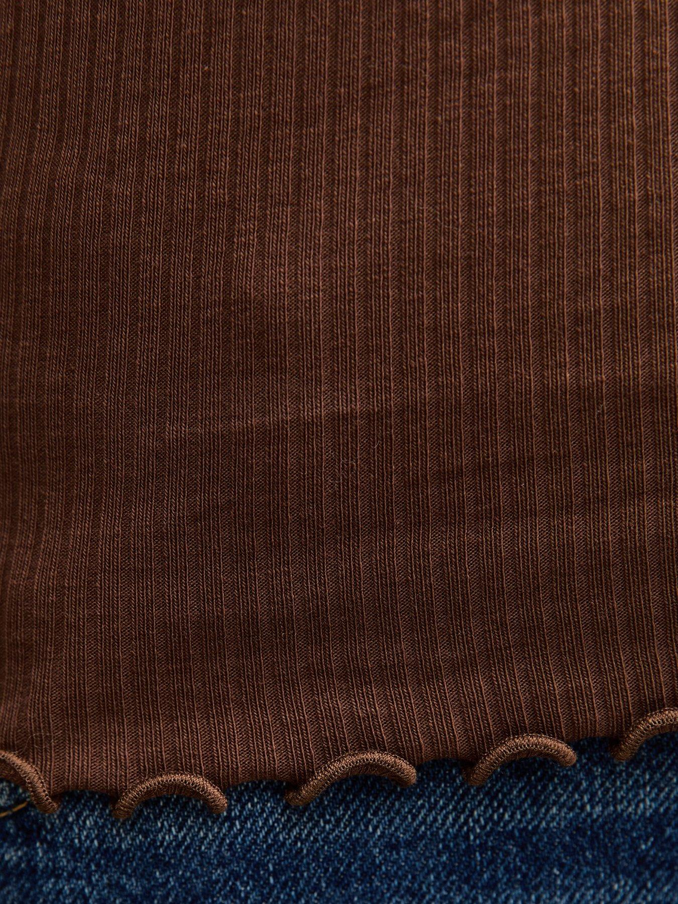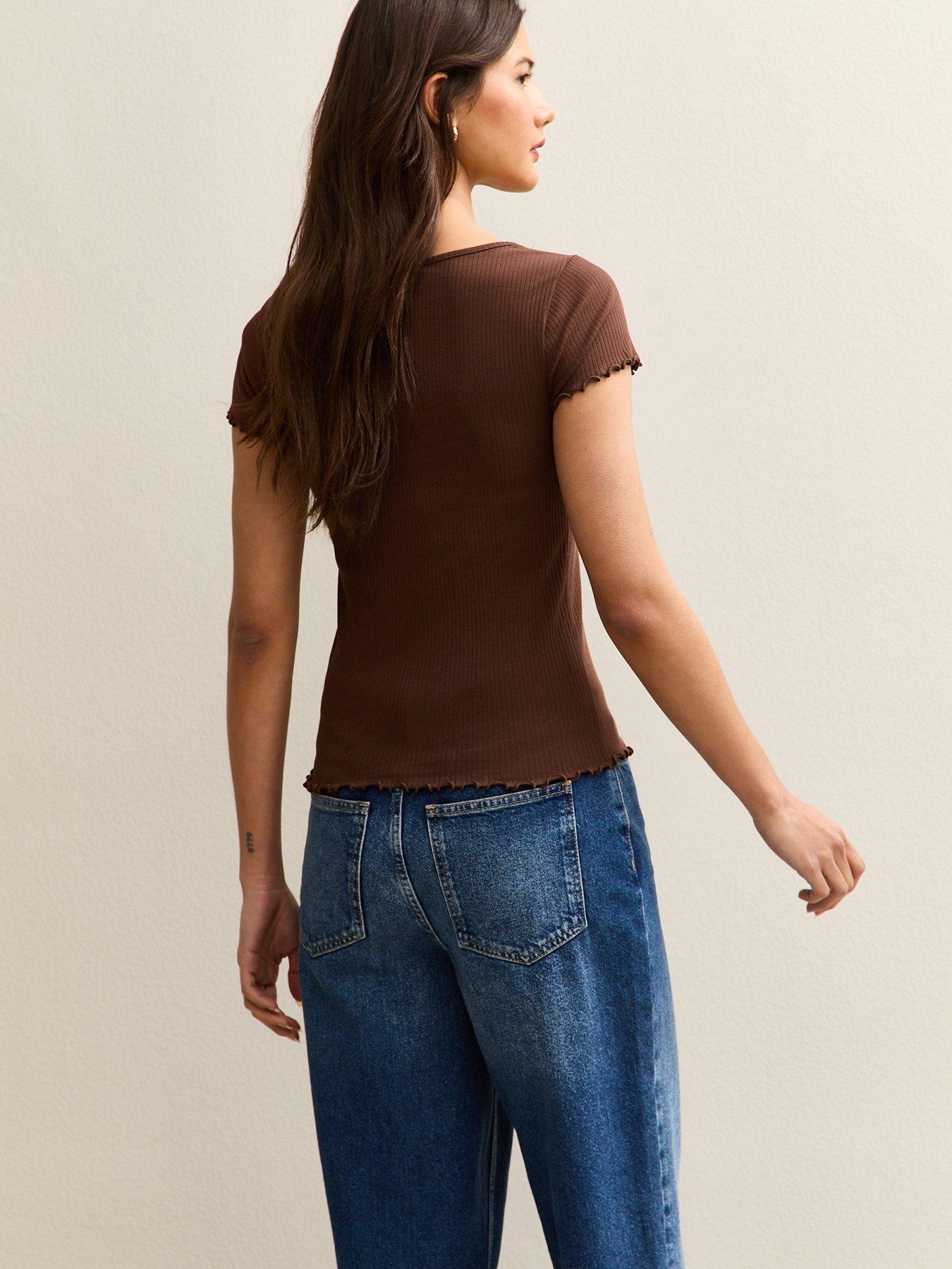• Short Sleeve Frilly Trimmed Top - Dark Brown by New Look