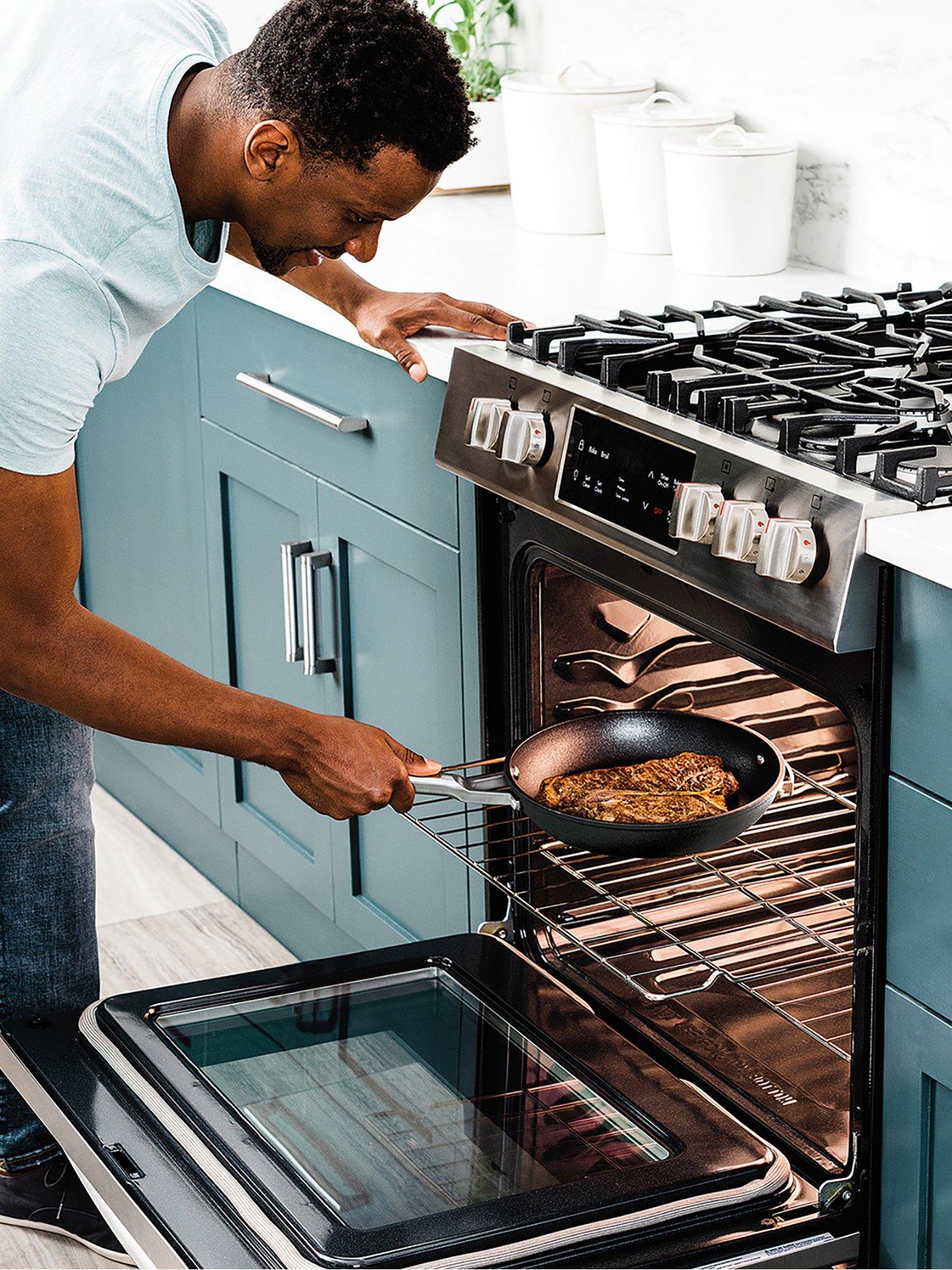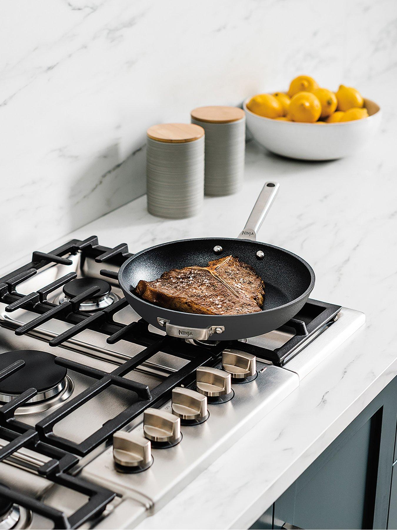 Ninja Zerostick Stackable 2-piece Frying Pan Set (24cm/28cm) - C52200ukSave space in cupboards with this stackable pan set.Zero stick, chip or flake Whereas other pans can rapidly lose their non-stick performance, Ninja ZEROSTICK is up to 20x tougher than traditional non-stick*. Durable, long-lasting, and covered by Ninja's 10 Year Replacement Guarantee, including the ZEROSTICK coating**. Stackable collection The design securely nests together to protect the pans' cooking surfaces. They're made from forged aluminium with a hard-anodised exterior. Complete with comfortable cast stainless steel handles. The difference is in the degrees ZEROSTICK is precision engineered at 17,000°C, fusing plasma ceramic particles to the surface of the pan to create a robust textured surface that interlocks with Ninja's exclusive coating. The textured cooking surface is metal-utensil safe, scratch-resistant and dishwasher safe. PFOA, lead and cadmium free. Cook using little to no oil Exclusive to Ninja, ZEROSTICK stops food from sticking. Use little to no oil for a healthier way to cook. Perfectly cooked results Designed to withstand high-heat cooking, even heating and no hot spots deliver consistent results. Perfect for cooking crispy bacon, sizzling steaks, golden pancakes and scrambled or fried eggs. Induction compatible Suitable for all hob types including induction, gas, electric and ceramic. - 24cm Frying Pan - suitable for 16cm induction ring - 28cm Frying Pan - suitable for 18.75cm induction ring Oven safe to 260°C Start your creation on the hob, finish to perfection in the oven. The stackable oven-safe tempered glass lids feature a clever handle design that lets you organise and stack the lids in any order, plus a steam vent and stainless steel trims.
