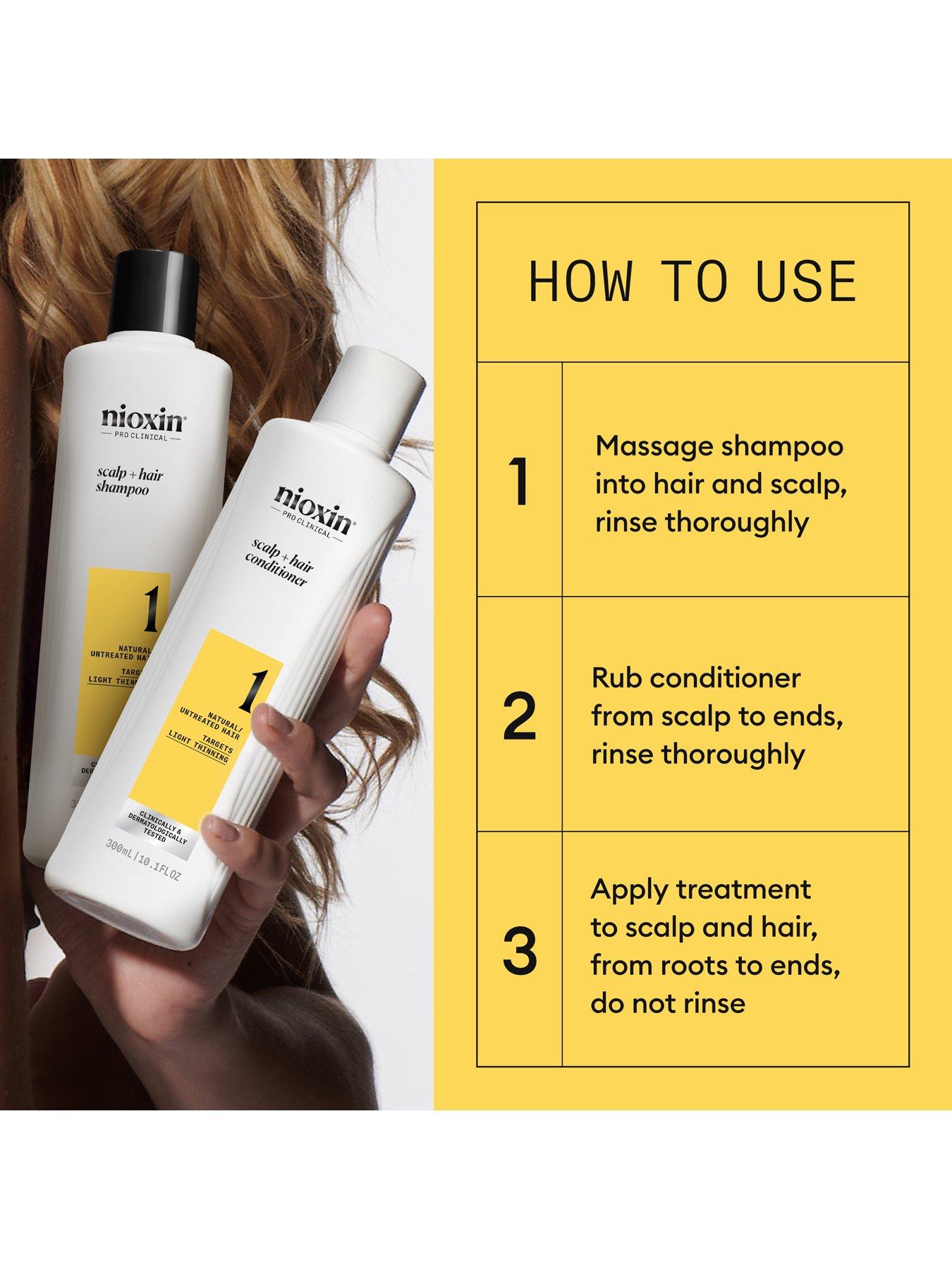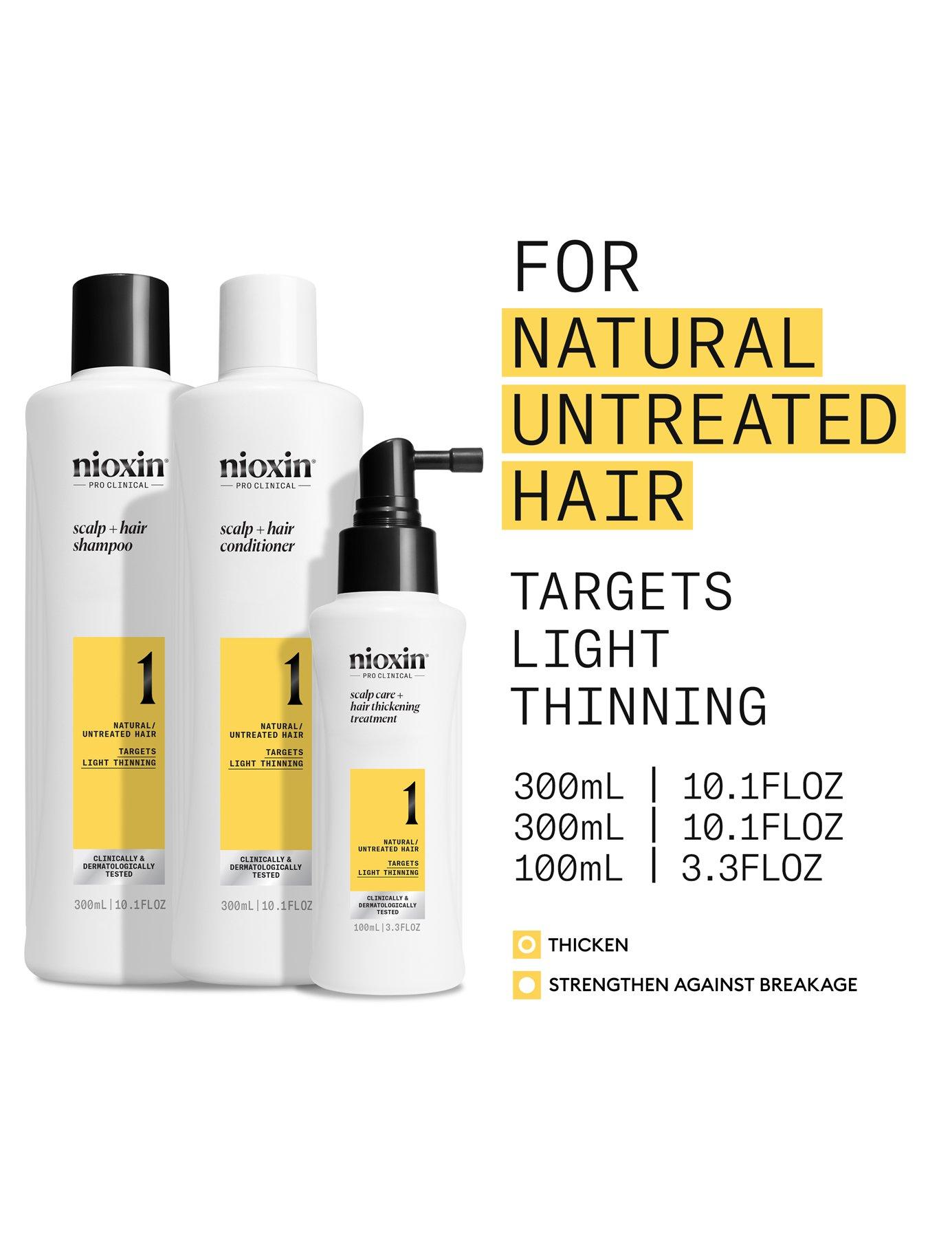 Nioxin Scalp + Hair Thickening System 1 for Natural Hair with Light Thinning, Loyalty KitNioxin Hair Care System 1 Loyalty Kit for Natural Hair with Light Thinning features a three part regime designed to amplifiy hair structure and protect against hair breakage. Powered by a blend of niacinamide and biotin, each formula helps to thicken the appearance of thinning, fragile hair.Use the complete system at least 3 times a week for visible results. Set Contents: System 1 Scalp and Hair Shampoo for Natural Hair with Light Thinning 300ml The detoxifying shampoo intensely cleanses the scalp to remove impurities and excess oil, while working to visibly strengthen the strands. Hair is left feeling clean and refreshed, complete with a fuller-looking finish. System 1 Scalp Scalp and Hair Conditioner for Natural Hair with Light Thinning 300ml Infused with a blend of botanicals and humectants, the formula features Activ-Renewal technology to nourish the hair from root to tip, while locking in lasting moisture. Ideal for fine hair types, the lightweight formula leaves hair with added volume and shine. System 1 Scalp and Hair Thickening Treatment for Natural Hair with Light Thinning 100ml As the final step in the routine, the leave-in formula helps to increase visible thickness and volume for fuller-looking hair. The multi-tasking formula leaves the scalp feeling refreshed with a minty infusion. Clinically and dermatologically tested.