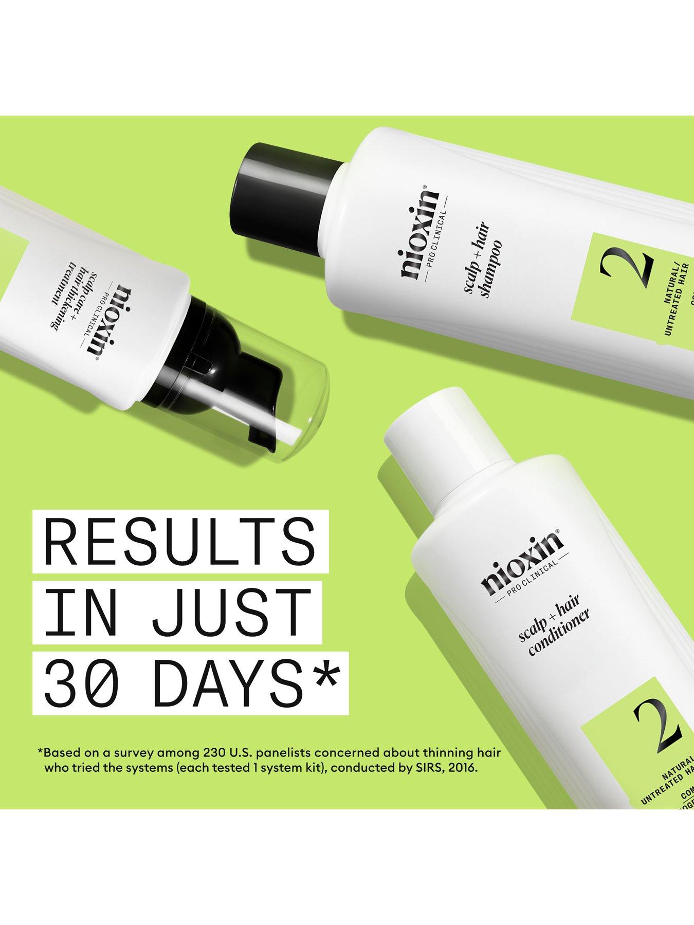 Nioxin Nioxin Scalp + Hair Thickening System 2 for Natural Hair with Progressed Thinning, Trial KitNioxin Hair Care System 2 Trial Kit for Natural Hair with Progressed Thinning adds visible fullness to hair in 30 days. With niacinamide and biotin at the core of each formula, the three part regime amplifies hair structure and protects against breakage.Use the complete system at least 3 times a week for visible results. Set Contents: System 2 Cleanser Shampoo for Natural Hair with Progressed Thinning 150ml The detoxifying shampoo intensely cleanses the scalp to remove impurities and excess oil from scalp to ends, while working to visibly strengthen the strands. Hair is left feeling clean and refreshed, complete with a thicker fuller-looking finish. System 2 Scalp Therapy Revitalizing Conditioner for Natural Hair with Progressed Thinning 150ml Infused with a blend of botanicals the professional conditioner delivers intense hydration which nourishes the hair from root to tip. Ideal for fine hair types, the lightweight formula leaves hair with added volume and shine. System 2 Scalp and Hair Treatment for Natural Hair with Progressed Thinning 50ml A volumising leave-on treatment foam which helps to increase visible thickness and volume of each strand for thicker fuller-looking hair. The multi-tasking formula amplifies hair texture while protecting against breakage. Clinically and dermatologically tested.
