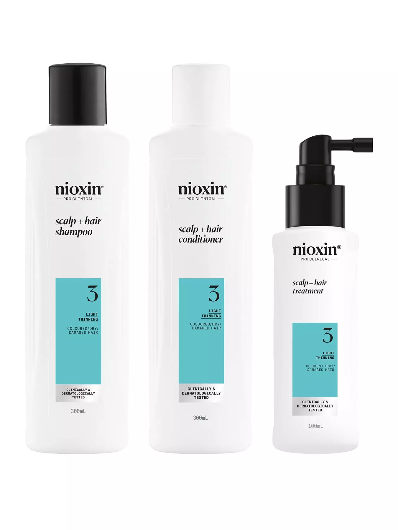 Nioxin Hair Care System 3 Loyalty Kit for Coloured, Dry and Damaged Hair with Light Thinning features a three step regime which is enriched with biotin and niacinamide, the set protects thinning hair from breakage to support stonger, thicker and fuller-looking hair over 30 days.Use the complete system at least 3 times a week for visible results.