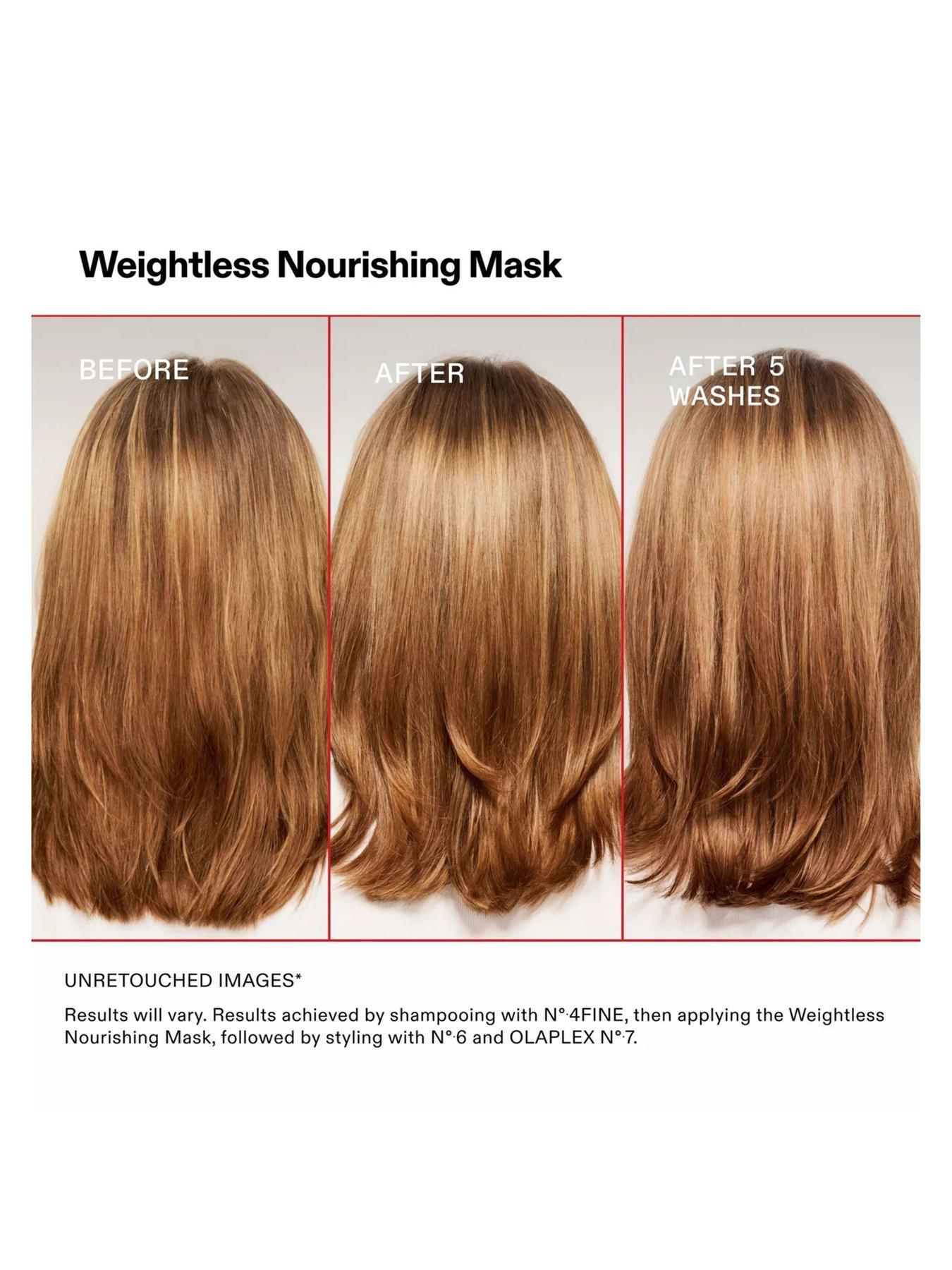 Olaplex Weightless Nourishing MaskThis instantly volumising hair mask for fine hair to medium hair is formulated with Biomimetic Cuticle Technology to lock in lightweight hydration and seal hair cuticles for 5 washes. It immediately boosts shine, reduces breakage, and helps prevent snapping wash after wash to support length retention over time. |