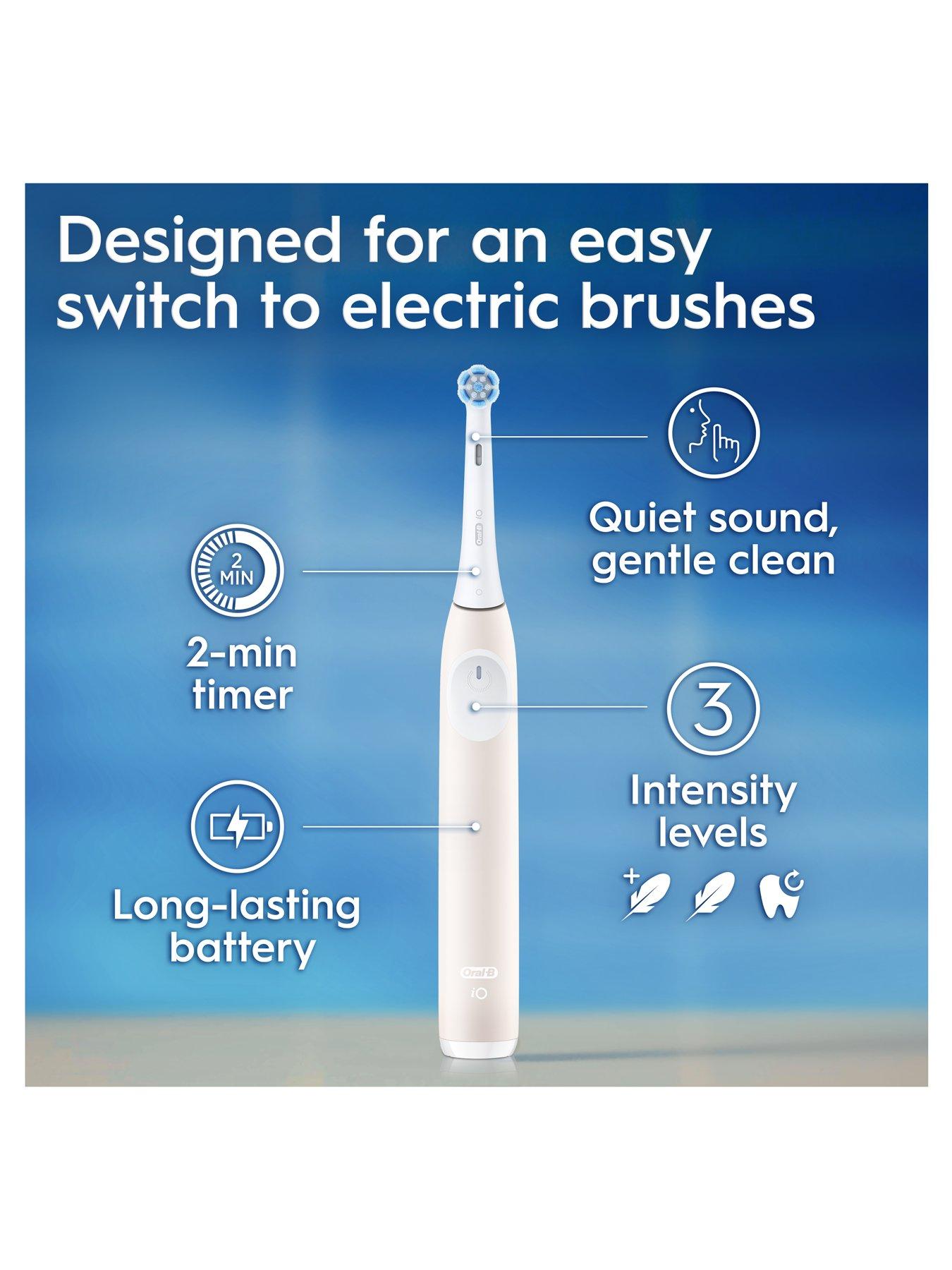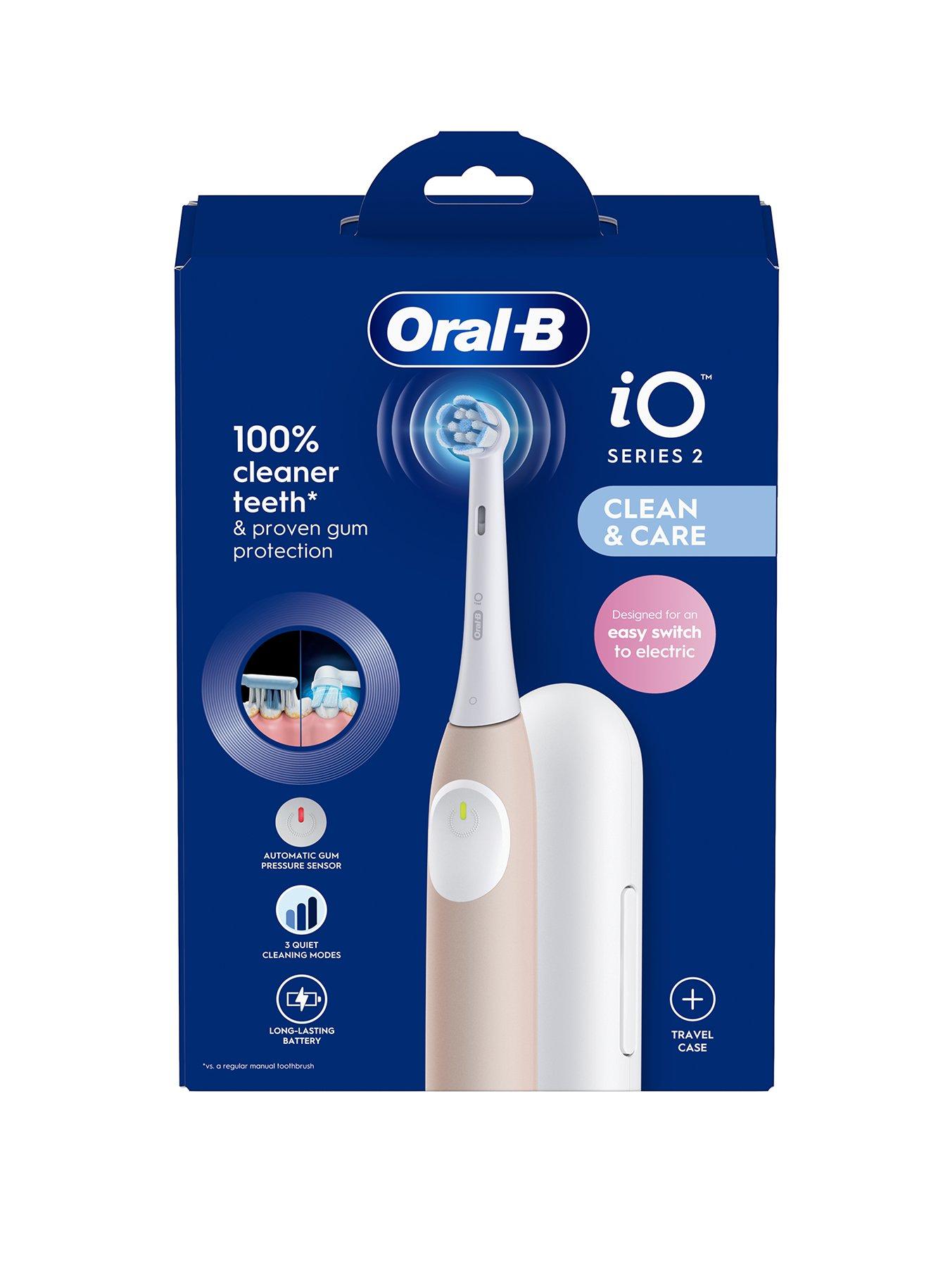 Oral-B iO2 Calm Pink Electric Toothbrush + Travel CaseThe iO2 electric toothbrush combines gentle micro-vibrations with a unique dentist-inspired round brush head for a purifying feel of a professional clean. Replace your Oral-B iO toothbrush head every 3 months for the best results.100% CLEANER TEETH than a regular manual toothbrush with Oral-Bs iO Technology: TOUGH ON PLAQUE, GENTLE ON GUMS DESIGNED FOR AN EASY SWITCH TO ELECTRIC BRUSHES with only 1 touch button, quiet sound, and long-lasting battery PROTECT YOUR GUMS with the AUTOMATIC GUM PRESSURE SENSOR that slows down speed and signals red when you brush too hard EASILY CHOOSE YOUR PERFECT CLEAN with 3 QUIET INTENSITY LEVELS: extra-gentle, gentle, daily clean BRUSH FOR DENTIST-RECOMMENDED TIME with 2-MIN BRUSH TIMER that alerts you every 30 seconds to change your brushing zone Benefit from a LONG-LASTING BATTERY with low-charge indicator ORAL-B ROUND brush heads REACH WHERE RECTANGULAR manual brushes DON'T. Experience a better clean from Oral-B the #1 brand most used by dentists worldwide SWITCH NOW TO ORAL-B iO for your PERFECT CLEAN