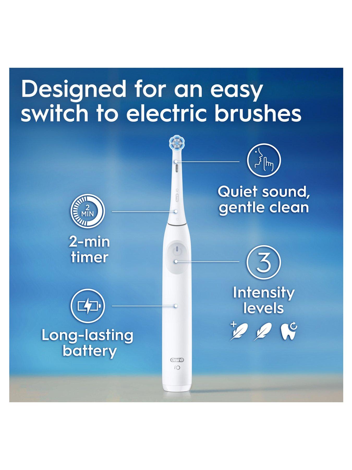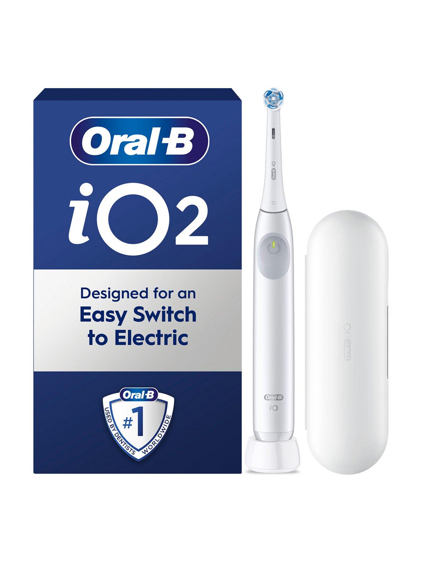 Oral-B iO2 Simple White Electric Toothbrush + Travel CaseThe iO2 electric toothbrush combines gentle micro-vibrations with a unique dentist-inspired round brush head for a purifying feel of a professional clean. Replace your Oral-B iO toothbrush head every 3 months for the best results.100% CLEANER TEETH than a regular manual toothbrush with Oral-Bs iO Technology: TOUGH ON PLAQUE, GENTLE ON GUMS DESIGNED FOR AN EASY SWITCH TO ELECTRIC BRUSHES with only 1 touch button, quiet sound, and long-lasting battery PROTECT YOUR GUMS with the AUTOMATIC GUM PRESSURE SENSOR that slows down speed and signals red when you brush too hard EASILY CHOOSE YOUR PERFECT CLEAN with 3 QUIET INTENSITY LEVELS: extra-gentle, gentle, daily clean BRUSH FOR DENTIST-RECOMMENDED TIME with 2-MIN BRUSH TIMER that alerts you every 30 seconds to change your brushing zone Benefit from a LONG-LASTING BATTERY with low-charge indicator ORAL-B ROUND brush heads REACH WHERE RECTANGULAR manual brushes DON'T. Experience a better clean from Oral-B the #1 brand most used by dentists worldwide SWITCH NOW TO ORAL-B iO for your PERFECT CLEAN