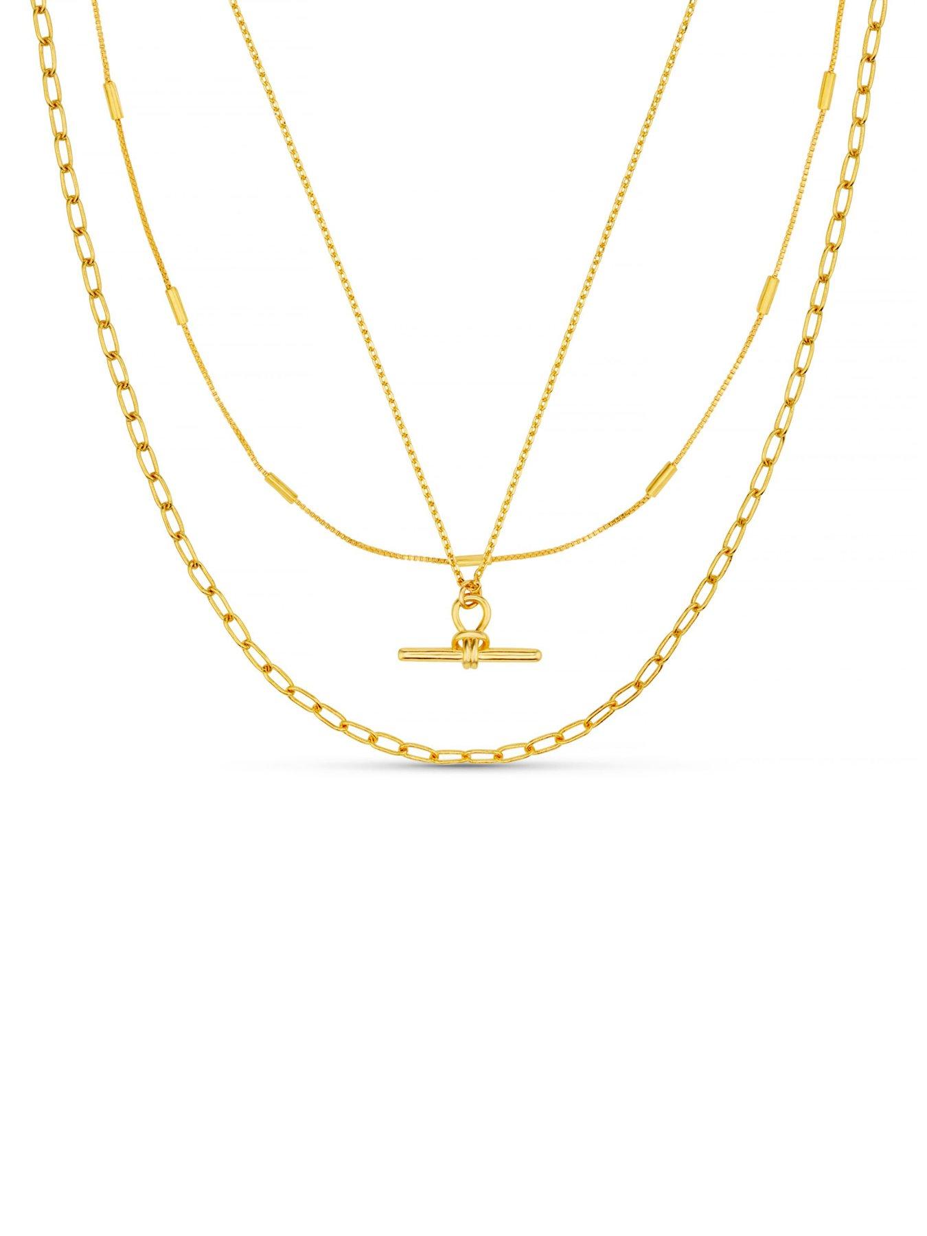 A dainty t-bar three row necklace from Orelia with three separate necklace chains which can be worn individually or styled together. This Jewelley is plated in 18k gold.