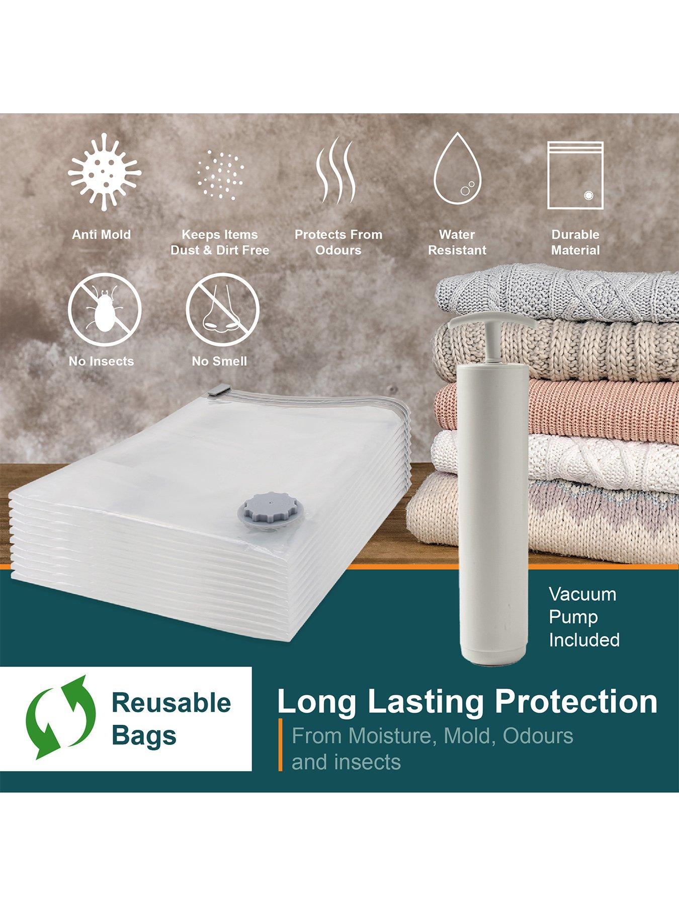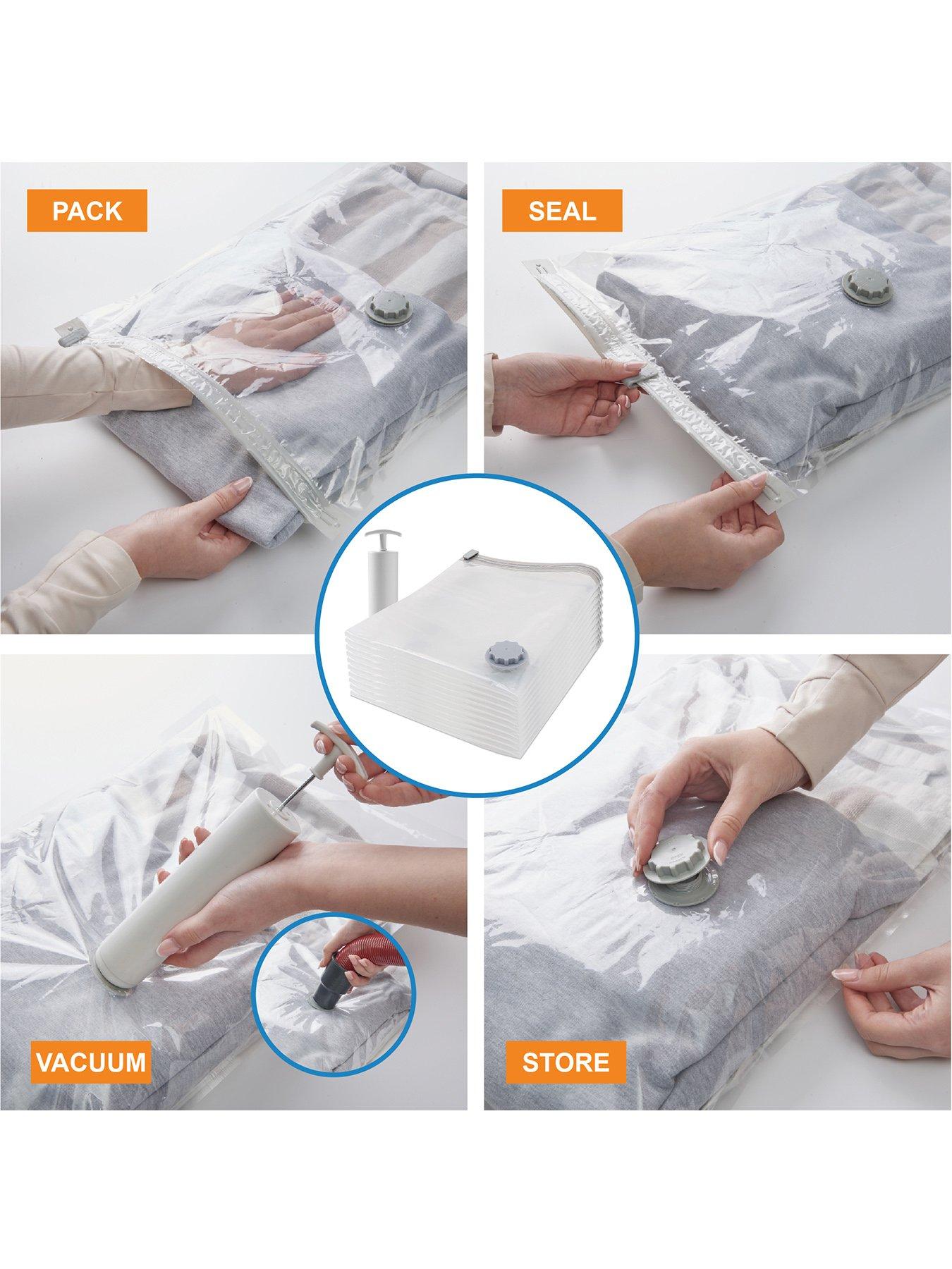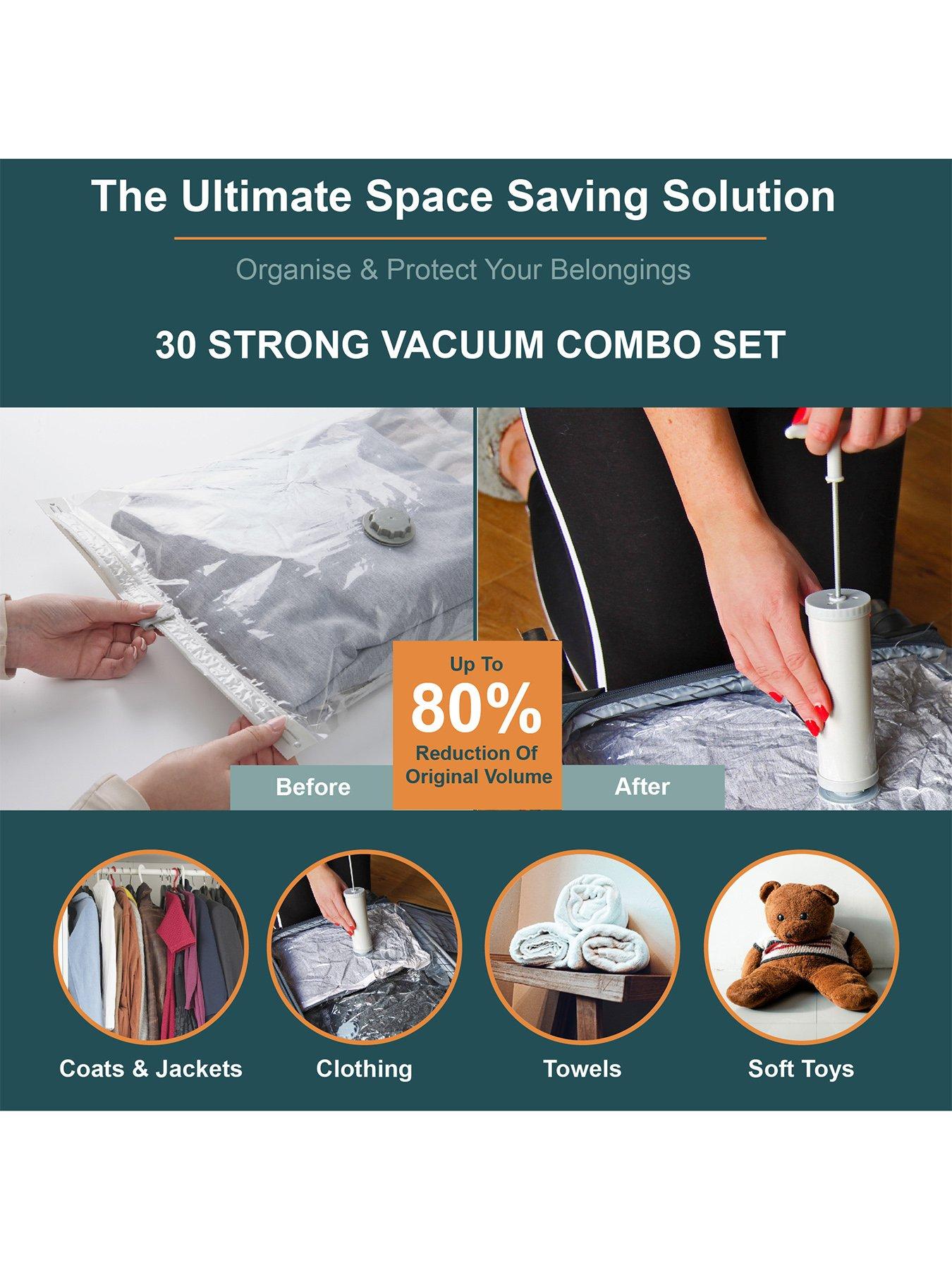 Our House Combo Vacuum Storage Bags With Vacuum Pump, 30 PackQuadruple the storage space around your home with the assistance of a multi-size selection of storage bags to cater for all your storage needs. Complete with an included vacuum pump, you can reduce the size of seasonal clothing, linens & fabric garments to a quarter of their normal size. During compression, the vacuum system withdraws all the excess air from each storage bag, making sure the contents inside are airtight once sealed to protect against moisture, moths, dust & unwanted odours from affecting your linens during storage. This 30-pack of storage bags contains a range of 6 assorted sizes, from small to sizeable - anything from scarves, up to bedding and pillows.TRANSFORM YOUR STORAGE SPACE Designed to compress and store clothing. Each bag can hold 6-8 sweaters or 2-3 sweaters and 1 jacket, making them ideal for seasonal wardrobe swaps, bedding storage, or travel. By removing air from around your items, these bags reduce volume by up to 75%, helping you reclaim valuable space in wardrobes, drawers, or suitcases LOCK OUT AIR, LOCK IN FRESHNESS Each vacuum bag features a secure zip-lock closure and a non-return valve that locks out air once sealed. This airtight design keeps your items fresh by protecting them from moisture, dust, mould, odours, and insects. Perfect for long-term storage or keeping holiday clothes in top condition during transit NO VACUUM? NO WORRIES! Comes with a compact, easy-to-use manual pump (22.5cm) for quick air removal when a vacuum cleaner isn't available. Also compatible with standard vacuum cleaners for even faster sealing at home THE ULTIMATE TRAVEL HACK Whether you're packing bulky clothes or lightweight holiday outfits, these bags make it easy. For small garments like t-shirts and shorts, just roll the bag to force out air-no tools needed