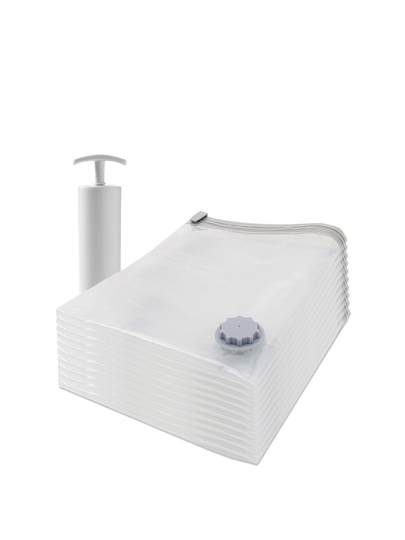 Our House Medium Vacuum Storage Bags With Vacuum Pump, 10 PackOur House Vacuum Storage Bags with Vacuum Pump, 10 PackQuadruple the storage space around your home with the assistance of 10 vacuum storage bags. Complete with an included vacuum pump, you can reduce the size of seasonal clothing, linens & fabric garments to a quarter of their normal size. During compression, the vacuum system withdraws all the excess air from each storage bag, making sure the contents inside are airtight once sealed to protect against moisture, moths, dust & unwanted odours from affecting your linens during storage. Suitable for storing seasonal clothing and linen and each measure - Medium 10-pack = 50x70cm - Large 10-pack = 60x80cm - Jumbo 10-pack = 80x100cm, TRANSFORM YOUR STORAGE SPACE Designed to compress and store clothing. Each bag can hold 6-8 sweaters or 2-3 sweaters & 1 jacket, making them ideal for seasonal wardrobe swaps, bedding storage, or travel. By removing air from around your items, these bags reduce volume by up to 75%, helping you reclaim valuable space in wardrobes, drawers, or suitcases LOCK OUT AIR, LOCK IN FRESHNESS Each vacuum bag features a secure zip-lock closure and a non-return valve that locks out air once sealed. This airtight design keeps your items fresh by protecting them from moisture, dust, mould, odours & insects. Perfect for long-term storage or keeping holiday clothes in top condition during transit NO VACUUM? NO WORRIES! Comes with a compact, easy-to-use manual pump (22.5cm) for quick air removal when a vacuum cleaner isn't available. Also compatible with standard vacuum cleaners for even faster sealing at home. Great for travel & everyday use THE ULTIMATE TRAVEL HACK Whether you're packing bulky clothes or lightweight holiday outfits, these bags make it easy. For small garments like t-shirts & shorts, just roll the bag to force out air-no tools needed. A game-changer for stress-free suitcase packing