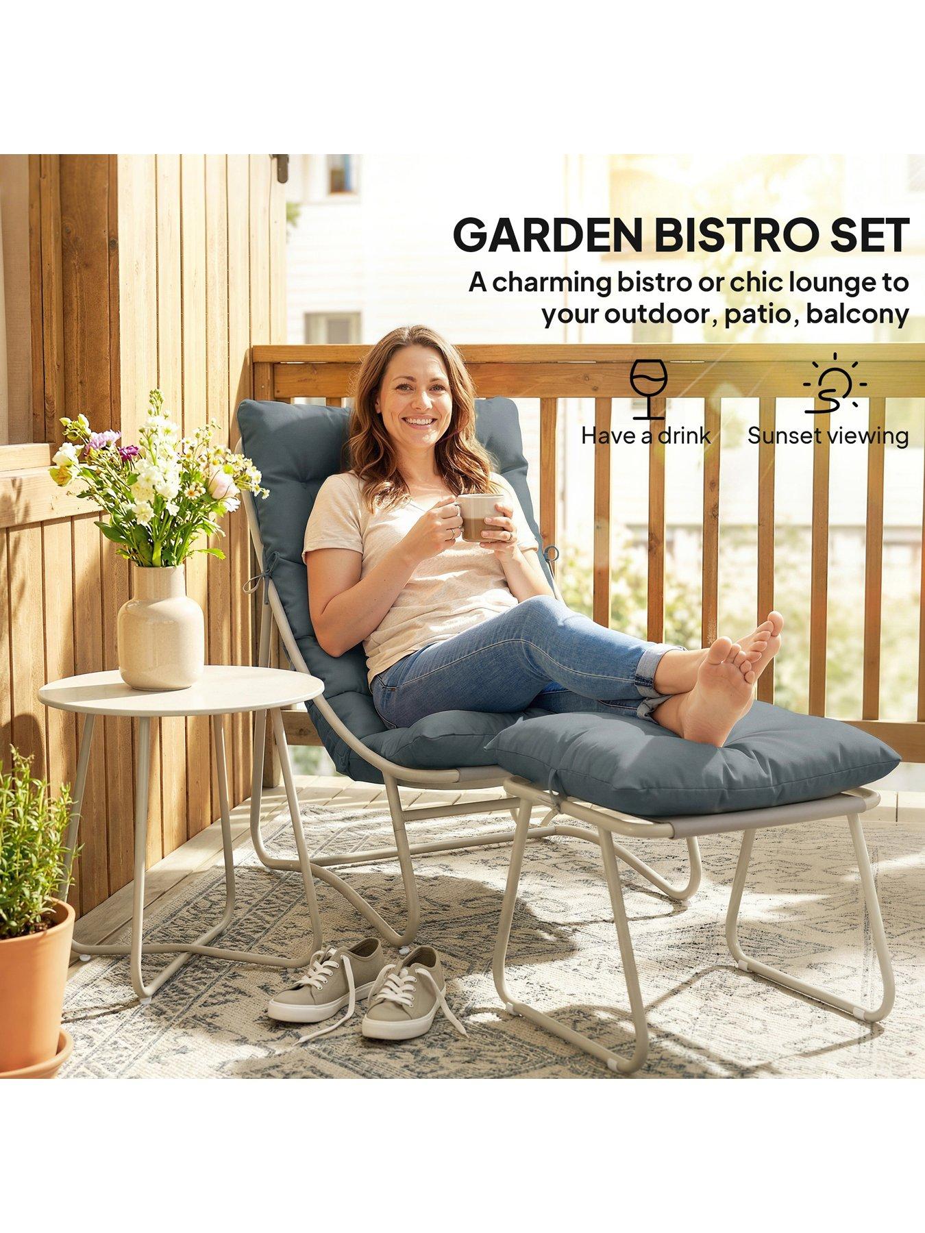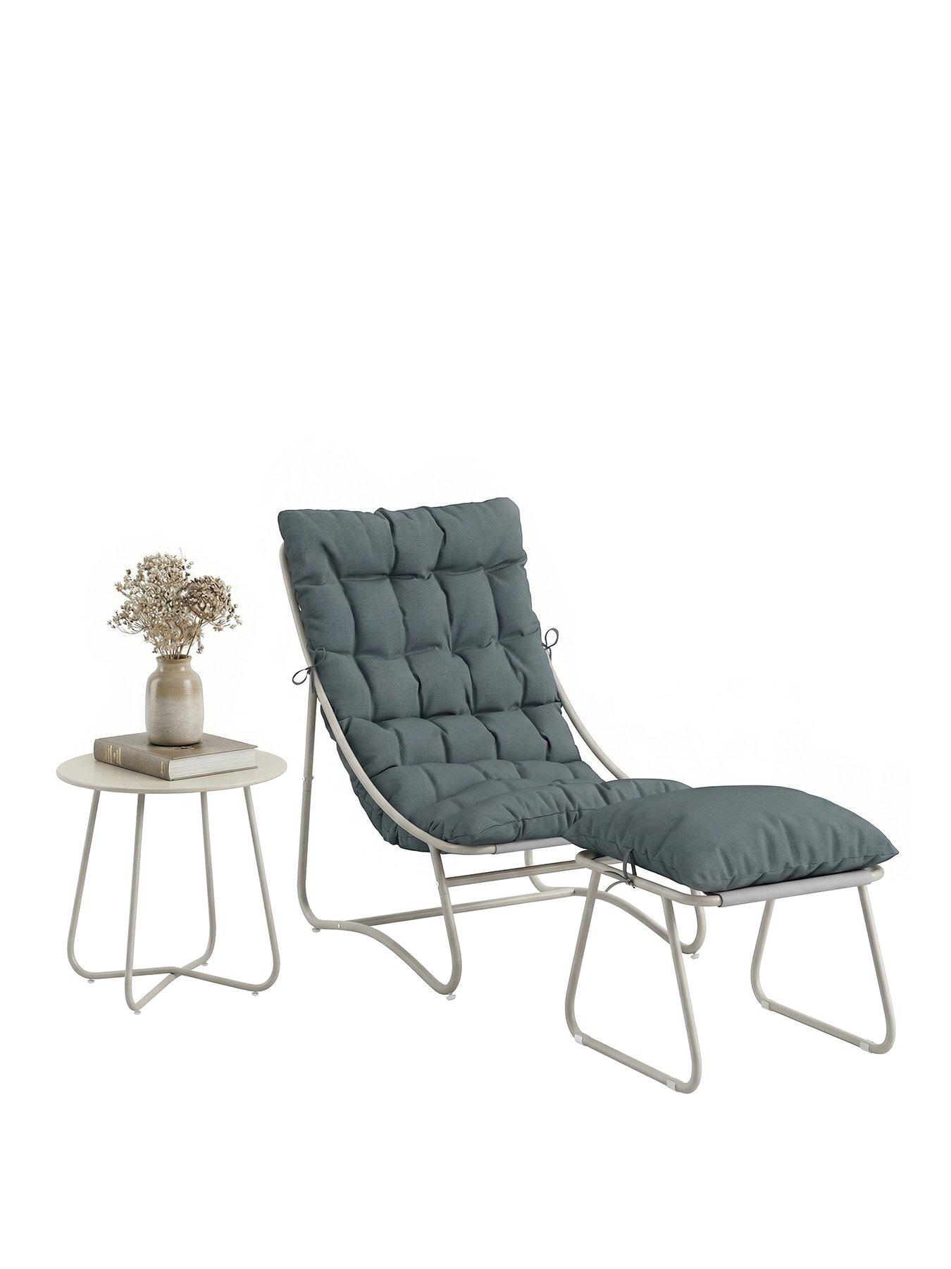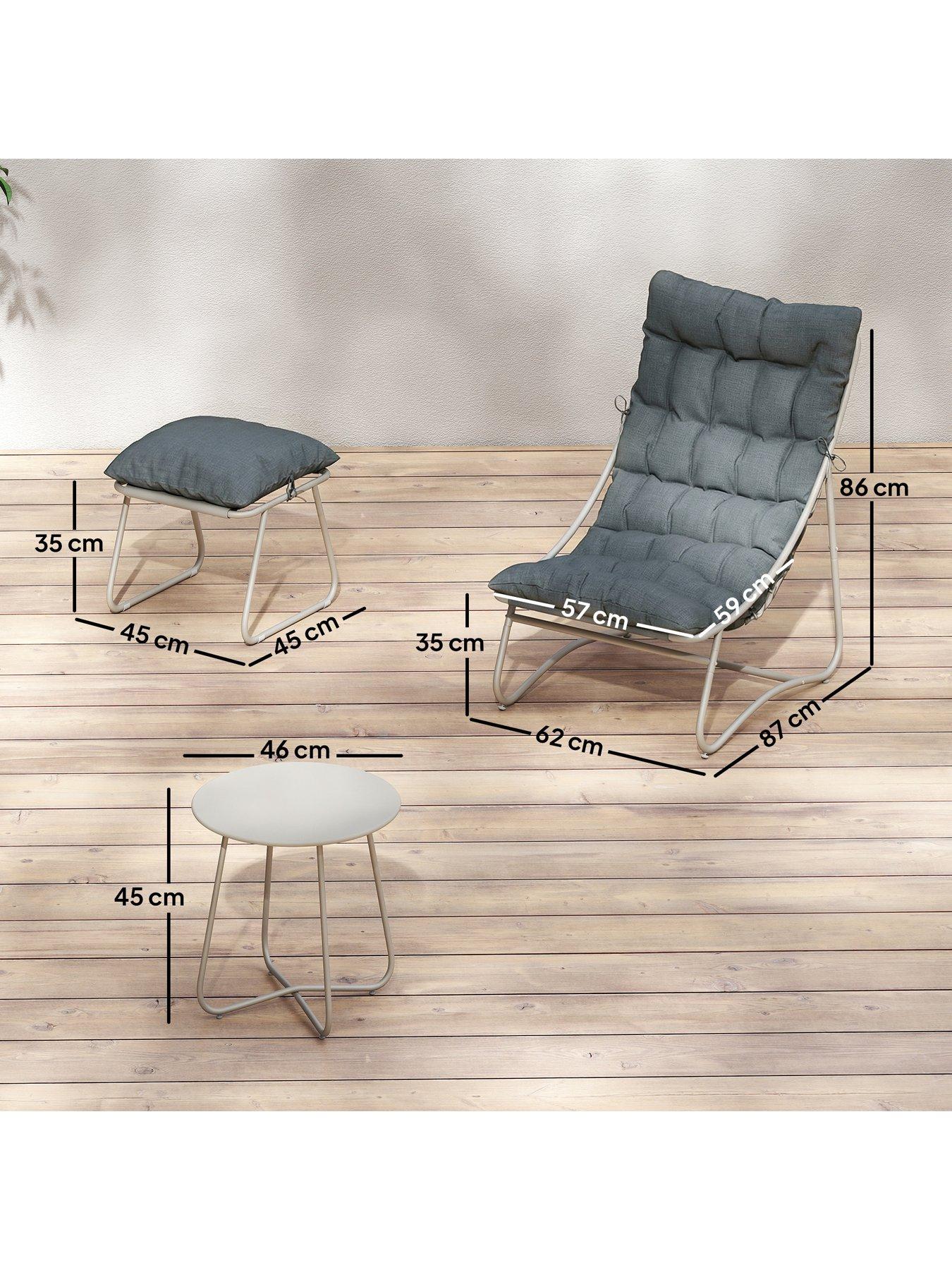 OutSunny Outdoor Chair With Footstool Cushions and TableMain function/feature: 1. Chair seat and back adopt Texilene mesh fabric structure; 2. Side table with iron plate tabletop; 2. Quantity: 3-piece set including 1 chair, 1 ottoman and 1 coffee table; 4. Dimensions - Chair: Overall dimensions: 62cmW x 87cmD x 86cmH; 5. Dimensions - Table: Overall dimensions: F46cm x 45cmH; 6. Dimensions - Ottoman: Overall dimensions: 45cmW x 45cmD x 35cmH; 7. Material: Frame material and surface treatment: Galvanized steel pipe with spray coating; Fabric material and surface treatment: Seat back panel with Texilene mesh fabric structure, cushion cloth is polyester cloth meeting British standard flame retardant requirement; Tabletop/chair panel strip material and specification: Side table tabletop 1mm thick; 1. Dimensions - Chair: Seat width (cm): 57, seat depth (cm): 59, seat height (cm): 35, backrest width (cm): 57, backrest length (cm): 60, backrest height (cm): 56, armrest width (cm): 2.2, armrest height from seat surface (cm): 25; 2. Load capacity - Chair: 120kg per chair; 3. Load capacity - Table: 30kg; 4. Load capacity - Ottoman: 50kg; 5. Specification: Frame specification: Main pipe specification: Chair leg pipe/back pipe F22mm x 0.9mmT, side table leg pipe F16mm x 0.8mmT; Fabric specification: Seat back panel 2Ãâ1 Texilene mesh fabric (500g/?), seat-back integrated cushion fabric 230g/? polyester cloth; 6. Function - Chair: Cushion: 1 seat-back integrated soft cushion (58cmW x 120cmD x 8cmH) without zipper, non-removable and non-washable, fixed with strap; 1 ottoman seat cushion (46cmW x 46cmD x 8cmH) without zipper, non-removable and non-washable, fixed with strap; 7. Function: Foot pad: Chair and side table equipped with adjustable foot pads (height adjustable range 5-10mm), ottoman equipped with C-shaped foot pads