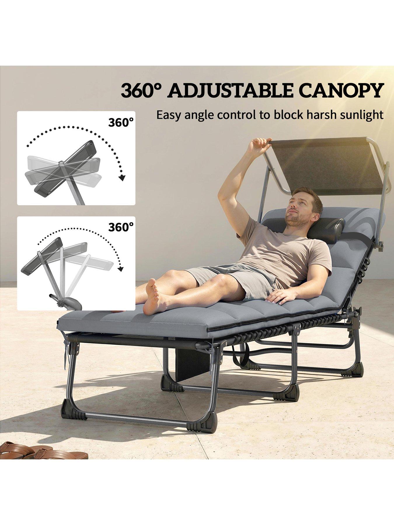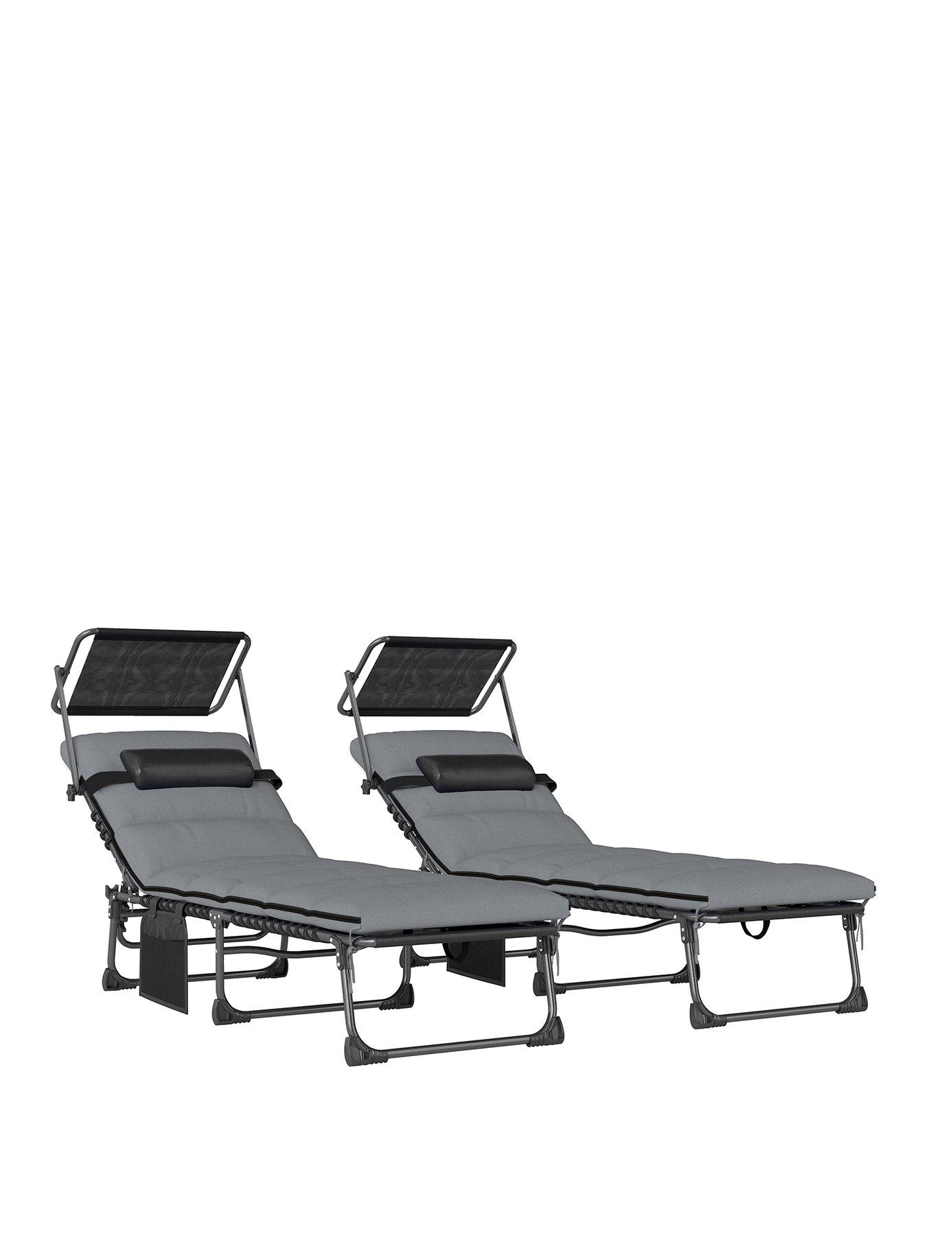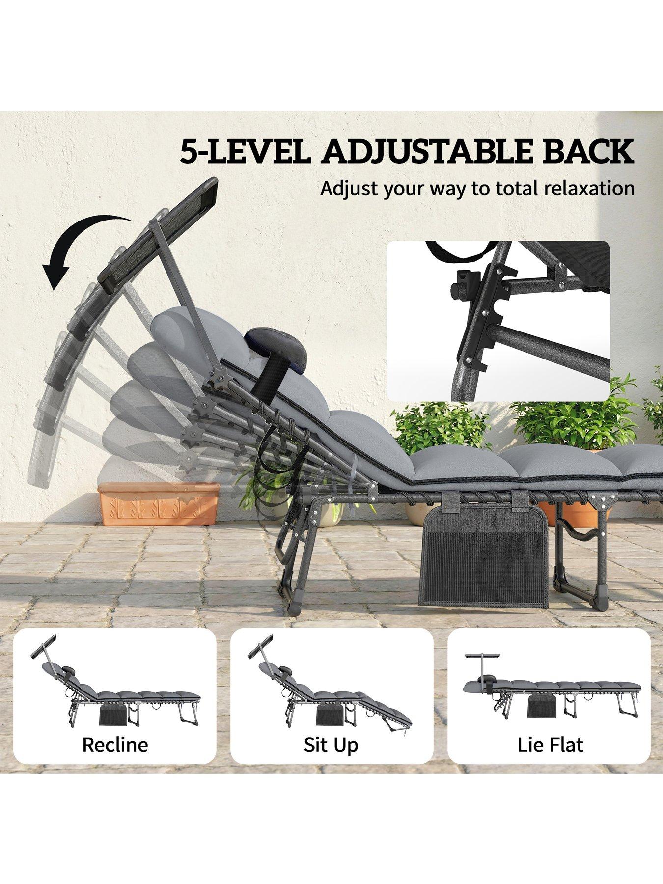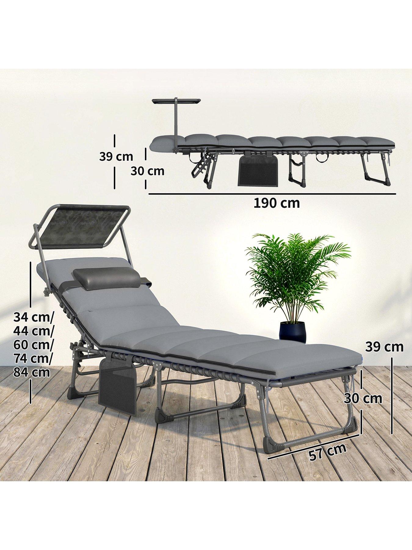 OutSunny Sun Lounger Set With Padded CushionsMain function/feature: Chair armrest with magazine pocket for storing magazines and mobile phones, cushion fabric with water repellent and British standard flame retardant functions; 2. Quantity: 9-piece set including 1 square table, 4 chairs and 4 ottomans; 3. Color: Chair: Black frame, dark gray cushion, gray Texilene mesh fabric; Table: Black frame, dark gray PSPC plastic tabletop; 4. Dimensions - Dining chair: Overall dimensions (cm): 52cmW x 52cmD x 67cmH; 5. Dimensions - Dining table: Overall dimensions (cm): 110cmL x 110cmW x 75cmH; 6. Material: Frame material and surface treatment: Steel pipe with spray coating; Tabletop/chair surface material and surface treatment: PSPC plastic tabletop, chair surface wrapped with polyester cloth and Texilene mesh fabric; Filler material and specification: Seat cushion filled with 22D sponge;Material specification: Frame specification: Chair and ottoman leg tube/seat tube 18cmL x 18cmW x 0.8mmT, table leg tube 30cmL x 15cmW x 0.8mmT; Tabletop/chair surface specification: 1Ãâ1 Texilene mesh fabric (450g/?), tabletop thickness 5mm; 4. Fabric specification: Polyester cloth 230g/?; 5. Load capacity - Dining chair: 120kg per chair; 6. Load capacity - Dining table: 50kg; 7. Function - Dining chair: Cushion: 4 cushions (49cmW x 50cmD x 5cmH) with zipper, removable and washable; ottoman cushion with strap; back cushion: 4 back cushions (42cmW x 42cmD x 14cmH) with zipper, removable and washable; seat plate front and rear elastic swing: No; 8. Function - Dining table: Stretchable: Split tabletop with two pieces; 9. Function: Storage function: Chair armrest with magazine pocket for storage; foot pad: Equipped with ordinary foot pads; 10. Others: Cushion fabric and filler must meet British standard flame retardant requirements