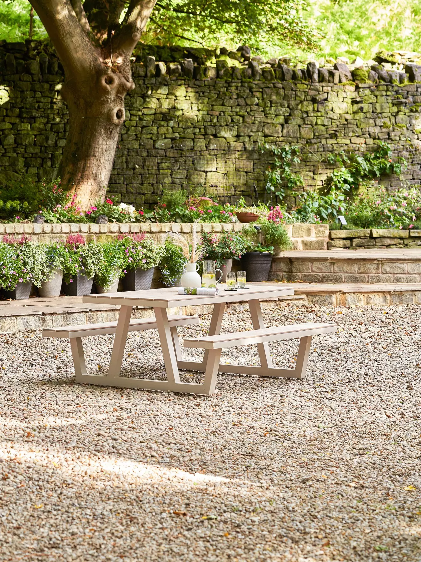 The Aruba offers a contemporary design, giving your garden a modern update. Made from quality materials a powder coated aluminium frame in a Latte finish, a polywood table top in a ash colour and ccomplimented with season -proof cushions in an olefin putty coloured fabric.- Depth: 170 CM