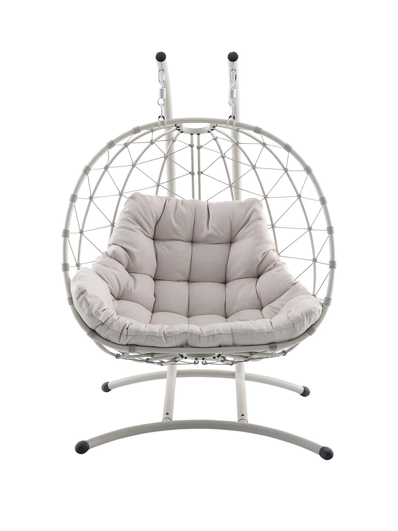 Pacific Lyon Putty Outdoor Double Hanging ChairTransform your outdoor area with the Lyon Putty Outdoor Double Hanging Chair, designed to blend comfort and contemporary style. Featuring a cross legged, powder coated steel frame in a putty-colour, this chair delivers a premium lounging experience. Its rope weave construction, also in a putty colour, creates a cohesive and elegant finish, while offering supportive comfort. The weather-resistant cushion in a matching putty hue ensures lasting comfort in any season.