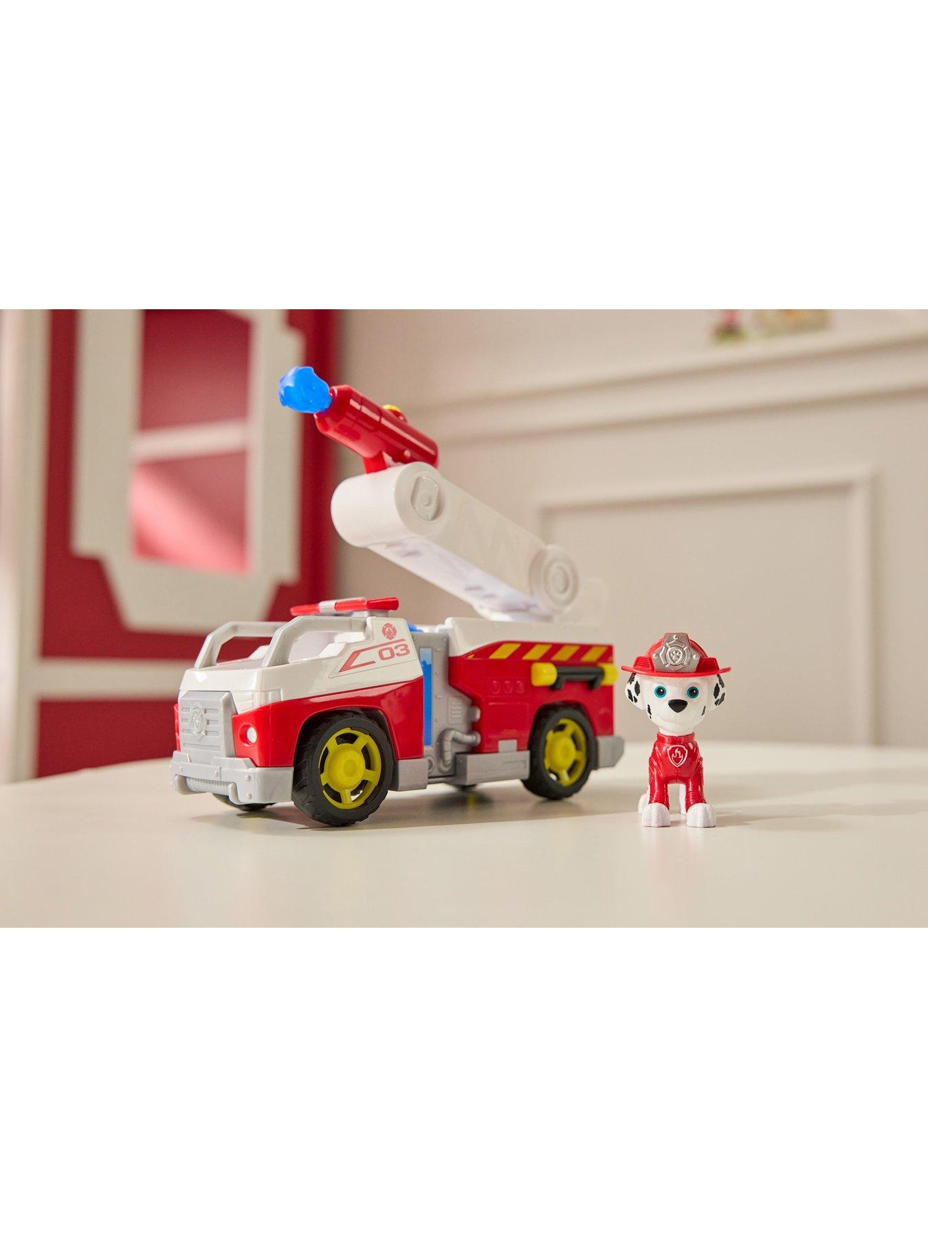 Paw Patrol FIRE RESCUE -PAW Marshall Themed VehicleJoin the PAW Patrol Fire Rescue team with Marshall and his action-packed Rescue Fire Engine. This PAW Patrol toy truck measures 20,3 cm long and 12,7 cm tall, ready to race to the rescue in any pretend play adventure. Marshall, standing over 5 cm tall in his fire rescue gear, is all set to save the day. Kids can tilt the ladder, launch water projectiles, and store them in the built-in ports for quick access. The trucks real working wheels and authentic PAW Patrol styling make it look just like in the show, allowing for endless creativity. These PAW Patrol learning toys are PAWsome for a birthday, Christmas, or any holiday. For even more fun, combine with the Fire Rescue Command Center, Rapid Reload Fire Truck and six different Fire Rescue figures and vehicles, so the excitement never ends. (each sold separately) Relive cherished moments from past PAW Patrol seasons, like the Mighty Pups and PAW Patrol Movie, or create new adventures with a PAW Patrol tower, individual PAW Patrol action figures and their PAW Patrol vehicles, for turbo-charged adventures.