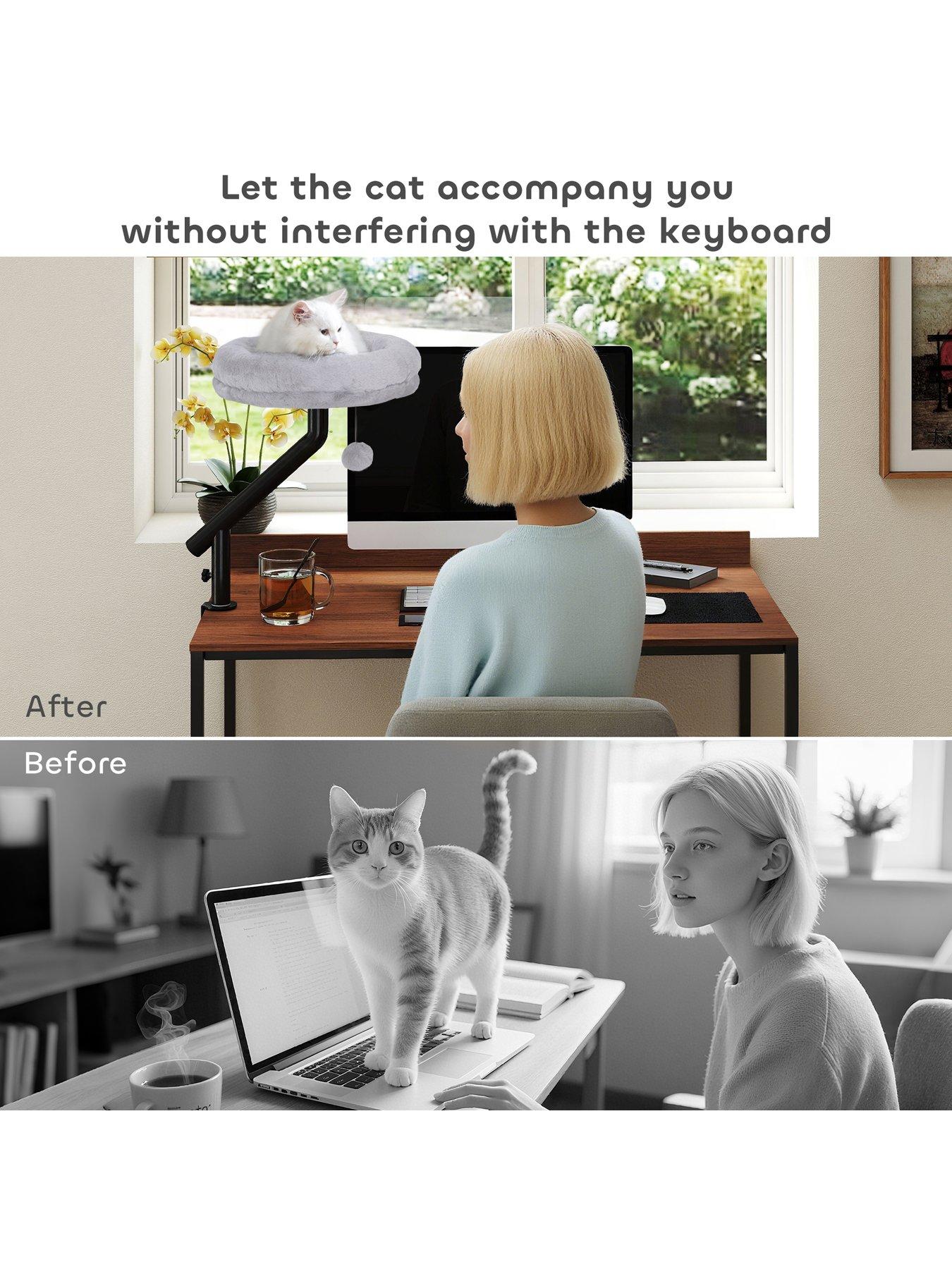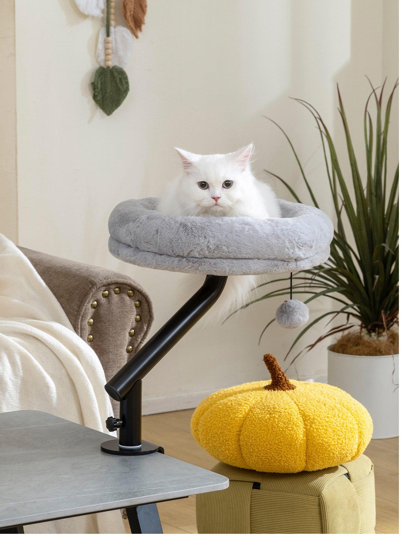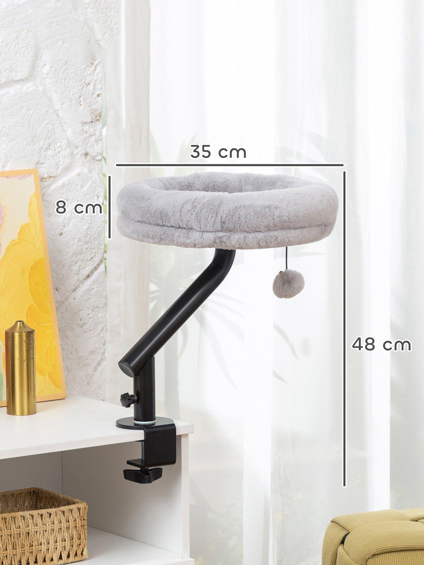 PawHut Cat Bed for Desk, 360° Rotatable Adjustable Cat Nest HammockDoes your cat constantly seek your attention while you work, making it hard to focus This can leave them feeling lonely and you feeling distracted. The PawHut cat desk bed offers a solution, creating a dedicated space right beside you. Its flexible 360° design and all-season fabric provide a cosy spot, enhancing your bond and bringing peaceful companionship to your workday. Clamps onto your desk to save space, keeping your cat close Rotates 360° with adjustable height, fitting perfectly on desks or windowsills Made with soft plush, offering your cat year-round comfort Robust metal frame supports up to 6 kg, installed easily without drilling The removable bed is machine washable, making cleaning effortless and convenient Includes a fun cat teaser ball to keep your furry friend entertained Colour: Grey, Black Material: Particle Board, Plush, PP Cotton, Steel Overall Dimension: 35W x 35D x 48H cm Cat Bed Size: F35 x 8H cm Clamp Adjustable Range: 1.5-4.5 cm Maximum Load: 6 kg
