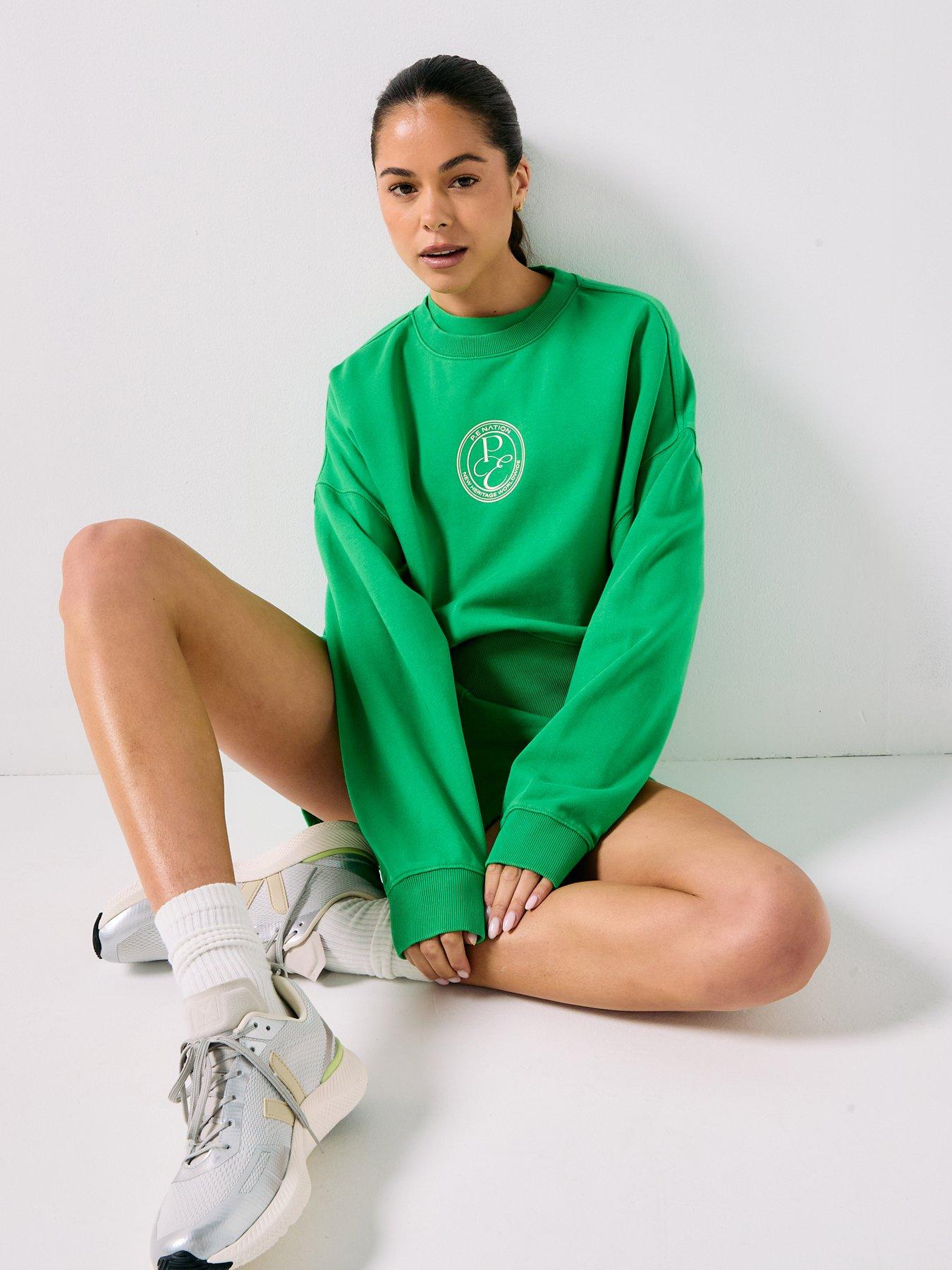 P.E Nation Womens Training Exposition Sweat - GreenRELAXED FIT, CROPPED SWEAT WITH RIBBED NECKLINE CUFFS AND HEM.IN A COTTON LOOP BACK FABRIC WITH SEASONAL P.E NATION GRAPHIC PRINTS. WORN AS A LAYERING PIECE.