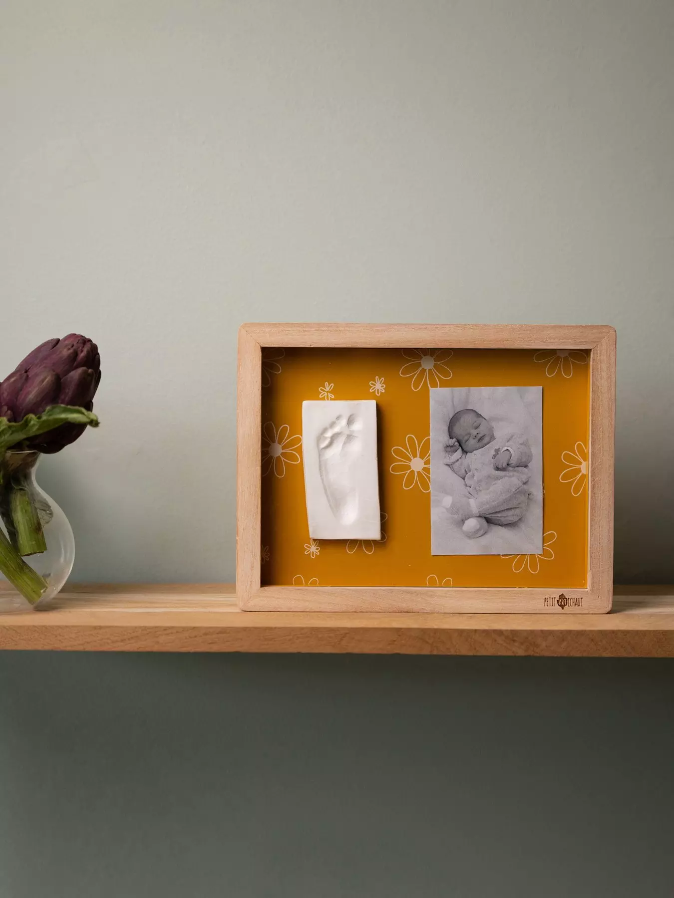 The Classic Frame - Daisy Ochre is designed to showcase both a photograph and a baby imprint. This traditional wall-hanging frame has a customizable reversible ochre background with or without floral pattern. Included in the kit are hypoallergenic clay, a roller, and instructions to easily create your print.- Depth: 25 CM