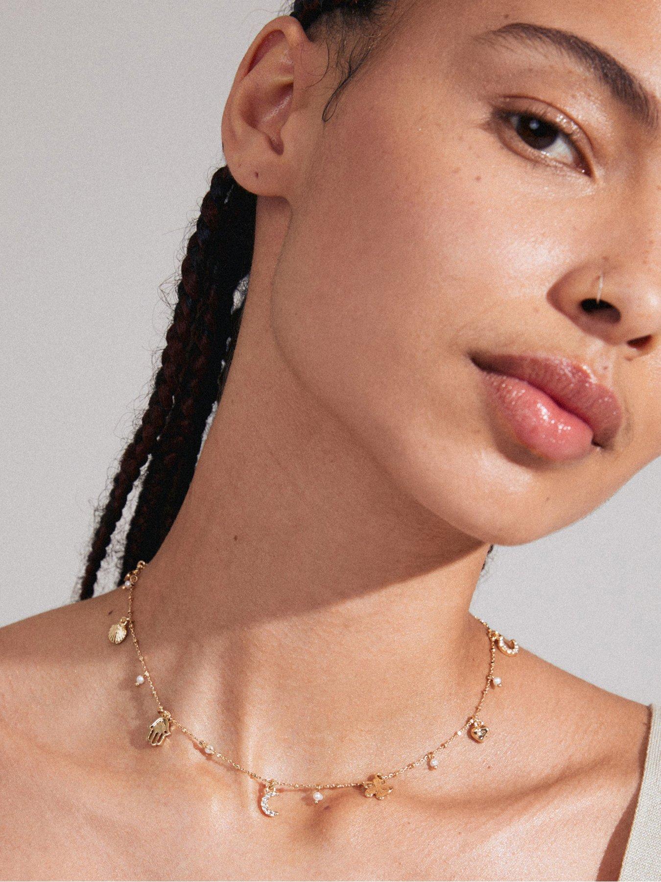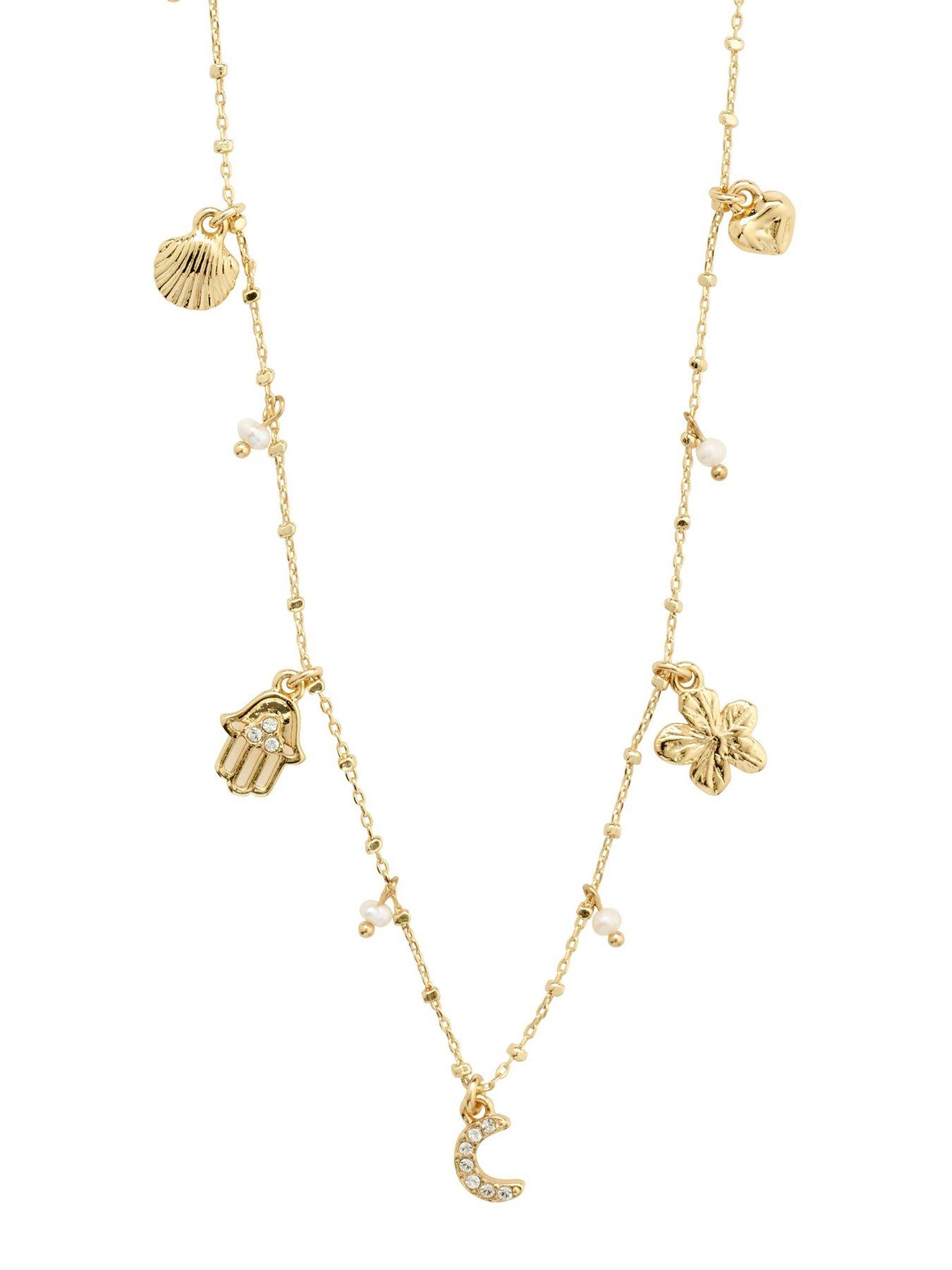 Pilgrim PRUCENCE necklace gold-platedMake today special with the PRUCENCE necklace from Pilgrim - a treasure trove of charming symbolism. The gold-plated chain is sprinkled with small charms, each telling a story. From the warmth of the heart and the beauty of flowers and the mystery of the moon to the horseshoe symbolising happiness. The Hamsa, seashell and all-seeing eye add a fairytale dimension to your look, while tiny freshwater pearl and sparkling Preciosa crystals add a touch of elegance. Wear a universe of symbolism around your neck and feel connected to the wonders of the world. Designed with a comfortable length of 38 cm plus a 9 cm extension chain. Made from min. 75% recycled material, the PRUCENCE necklace is not just a piece of jewelry - it's a celebration of life.