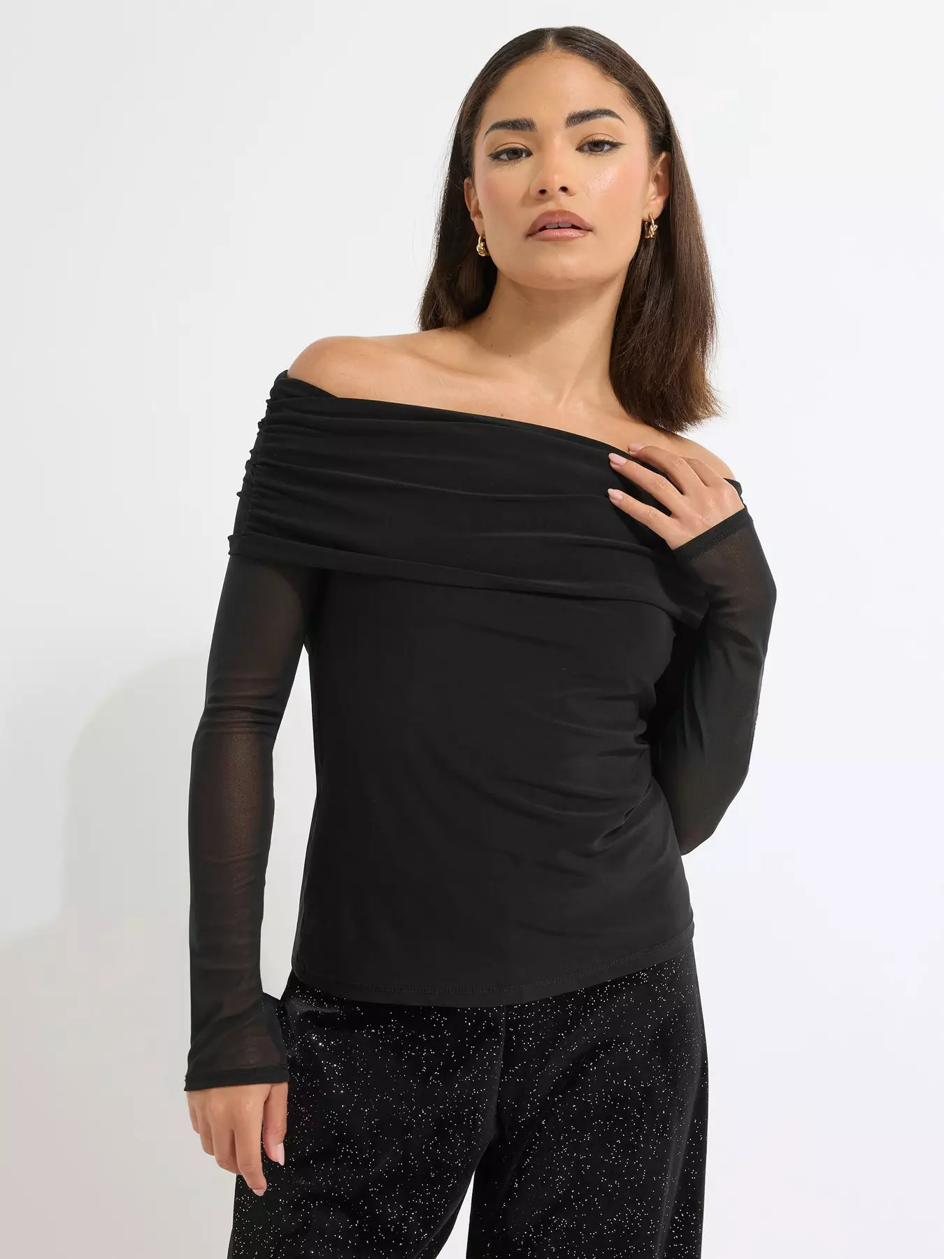 PixieGirlPetite Mesh Sleeve Bardot Top - Black