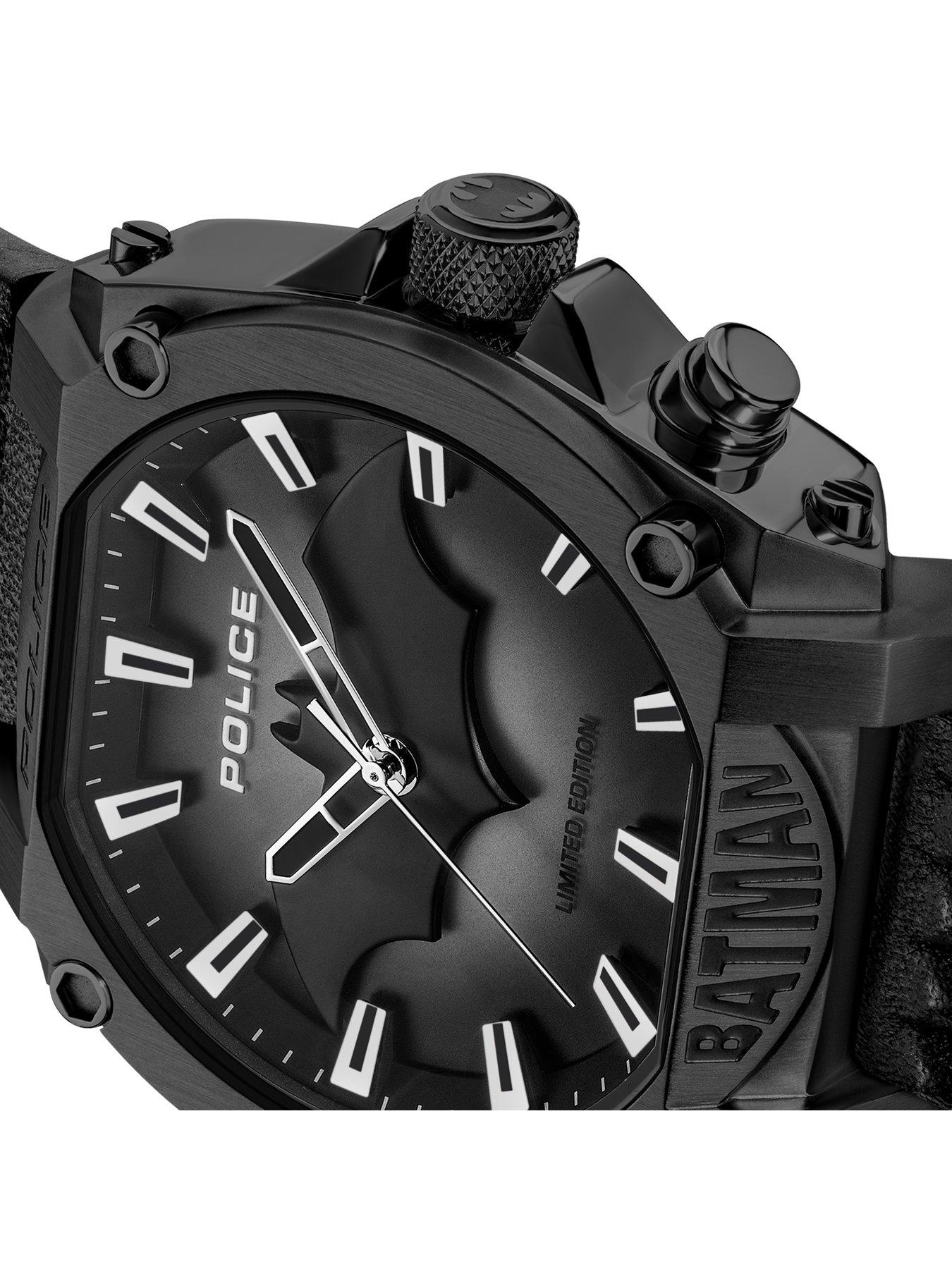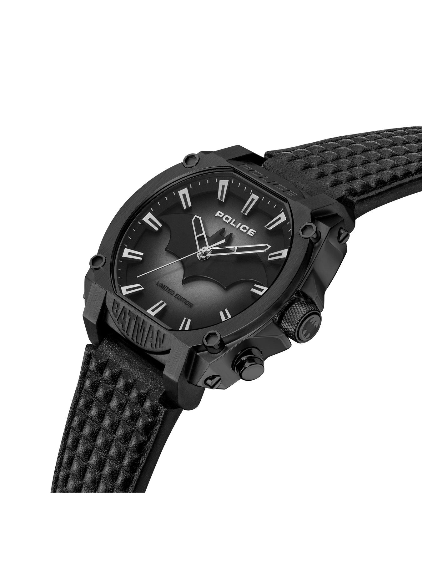 Police Black Forever Batman WatchThe Forever Batman watch features a sleek dark design with the iconic Bat symbol. Armed and ready for day and night missions, with a backlight for a tactical touch. The 45x51.5mm black IP case showcases both the Police and Batman emblems. Meanwhile, the black and semi-transparent charcoal dial conceals the watch's nocturnal capabilities, which come to life with the simple press of a button. The textured black leather strap adds style and functionality. Forever Batman - even in the darkest of times, the beacon of hope still shines. This limited edition Forever Batman watch comes complete with collectible box and card of authenticity.