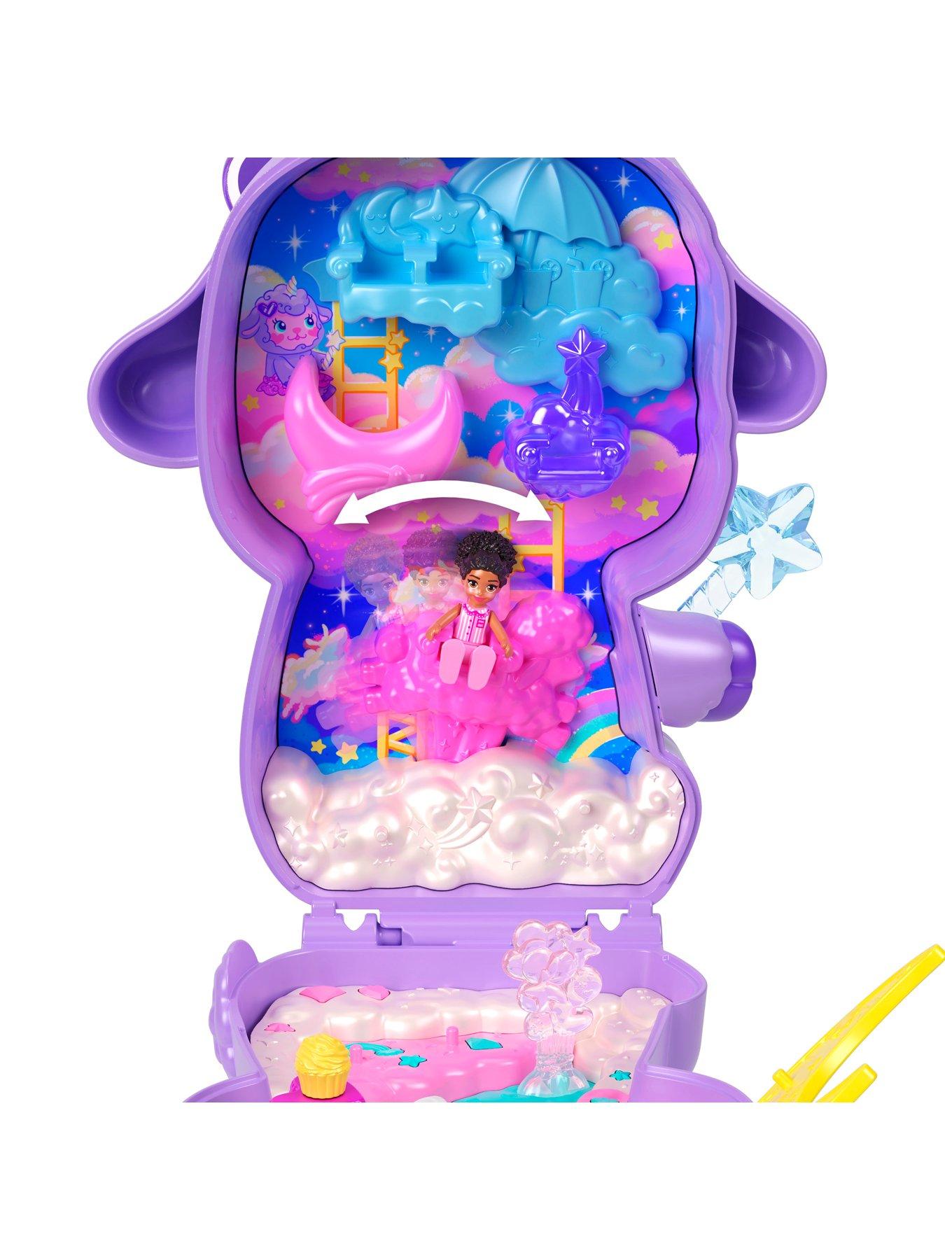 Polly Pocket Cozy Dreamland Lamb Compact Playset with 1 Micro Doll and Pet Unicorn, Travel Toy with Food & Styling AccessoriesThis adorable Polly Pocket Cozy Dreamland Compact is shaped like a lamb with a fun dress-able exterior perfect for kids who love to express their unique fashion sense! Open the playset to discover a fantasy world amongst the clouds with one micro doll and nine themed accessories, including one pet unicorn. Dolls love to sway back and forth on the cloud swing! Hangout in the lounge hidden behind the crescent moon or fly high in the hot air balloon. When it's time to run, pack it up for on-the-go fun! Ideal for ages four years old and up, especially those who love fantasy lands and animals. Subject to availability. Colors and decorations may vary.