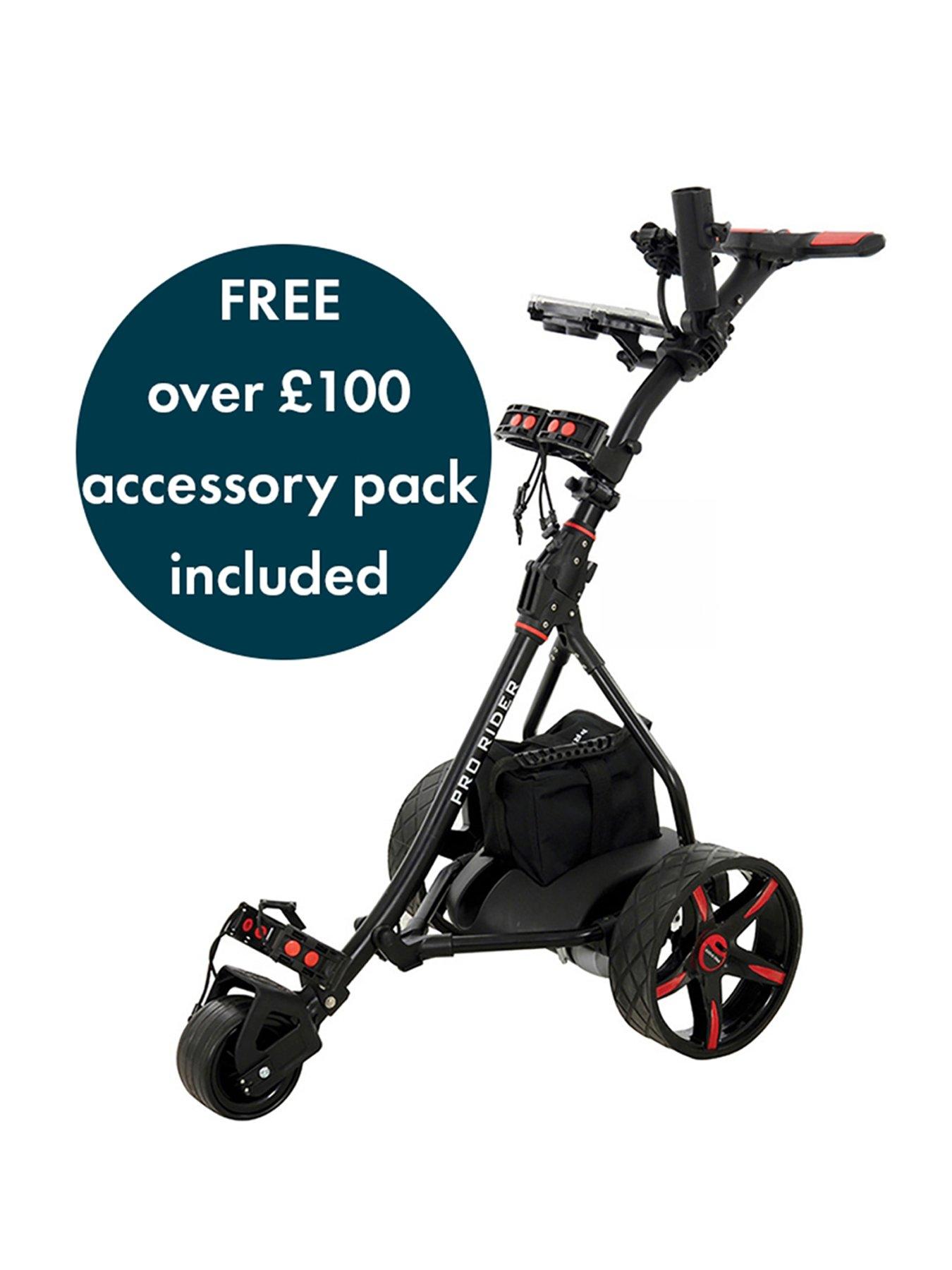 Pro Rider 36 Hole Electric Golf Trolley - give your golf game a lift!FAIRWAY TO HEAVENEvery golfer needs the best equipment to ensure they're top of their game! The Pro Rider 36 Hole Electric Golf Trolley certainly fits the bill - it's durable, lightweight and has been specially designed for compatibility with both left and right-handed users. READY TO LAST THE COURSE Transporting all your clubs, balls, and equipment around the course has never been easier. Steep fairways and awkward landscapes are no match for its powerful 200W motor and puncture-proof wheels, allowing you to handle the course with ease and confidence in all kinds of terrain and weather. What's more, its long-lasting 36aH battery can handle a 36-hole course before you need to re-charge. ADJUSTABLE SPEED Multiple distance functions and a memory function for setting your preferred speed really give you the opportunity to customise your golfing experience with this battery-operated golf trolley. There's even a built-in holder for your phone!