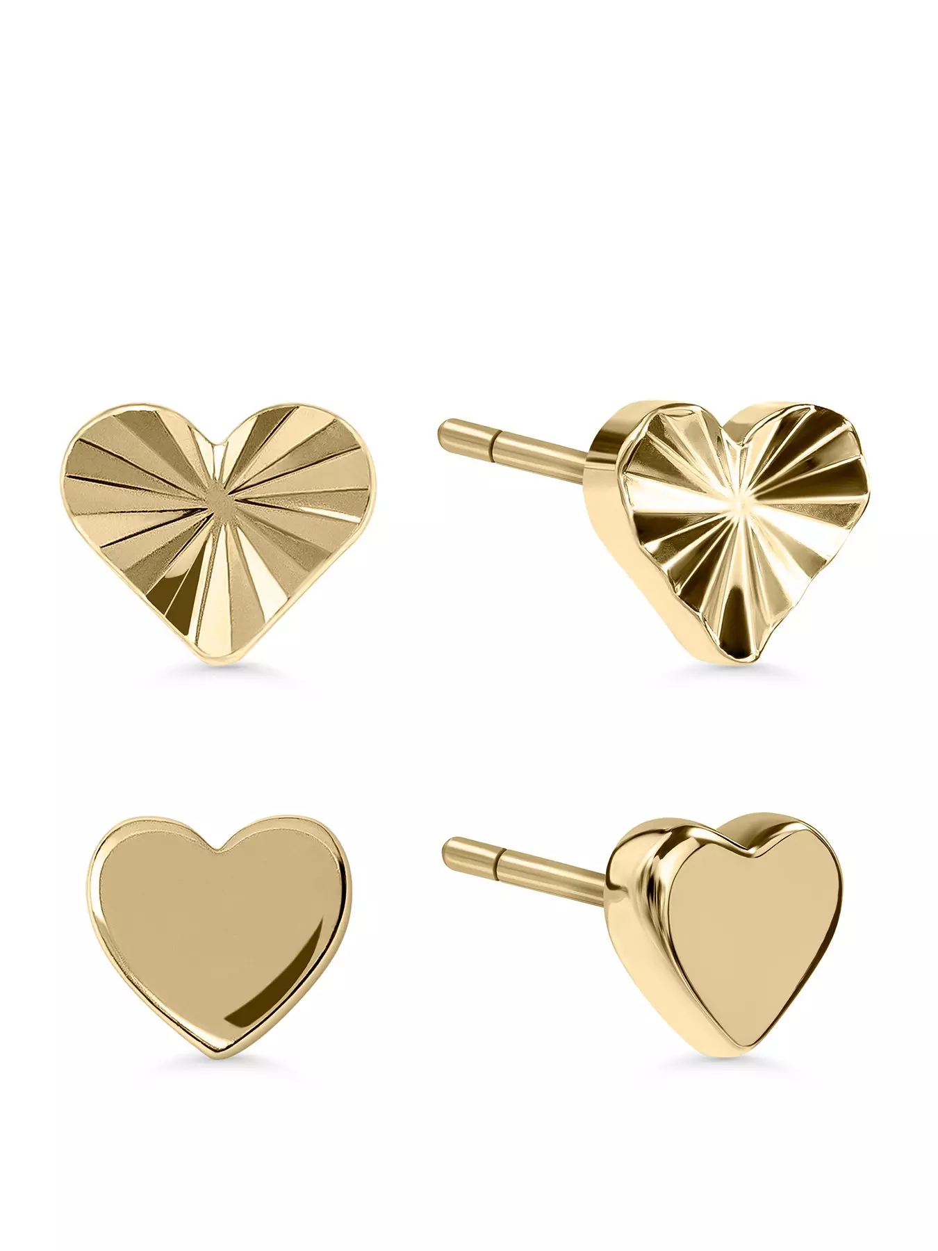 Radley 18ct Gold Plated Textured Heart Twinpack Earrings. This Radley twinpack features two pairs of heart-shaped stud earrings in beautifully polished 18ct gold plating. One pair showcases a sleek, smooth finish for everyday elegance, while the other features a subtle textured design that adds depth and detail. Perfect for mixing, matching, or layering across multiple piercings, they bring versatility and charm to your jewellery collection. Presented in a Radley London gift box, making them a thoughtful gift or a stylish treat for yourself.- Depth: 1.83 MM