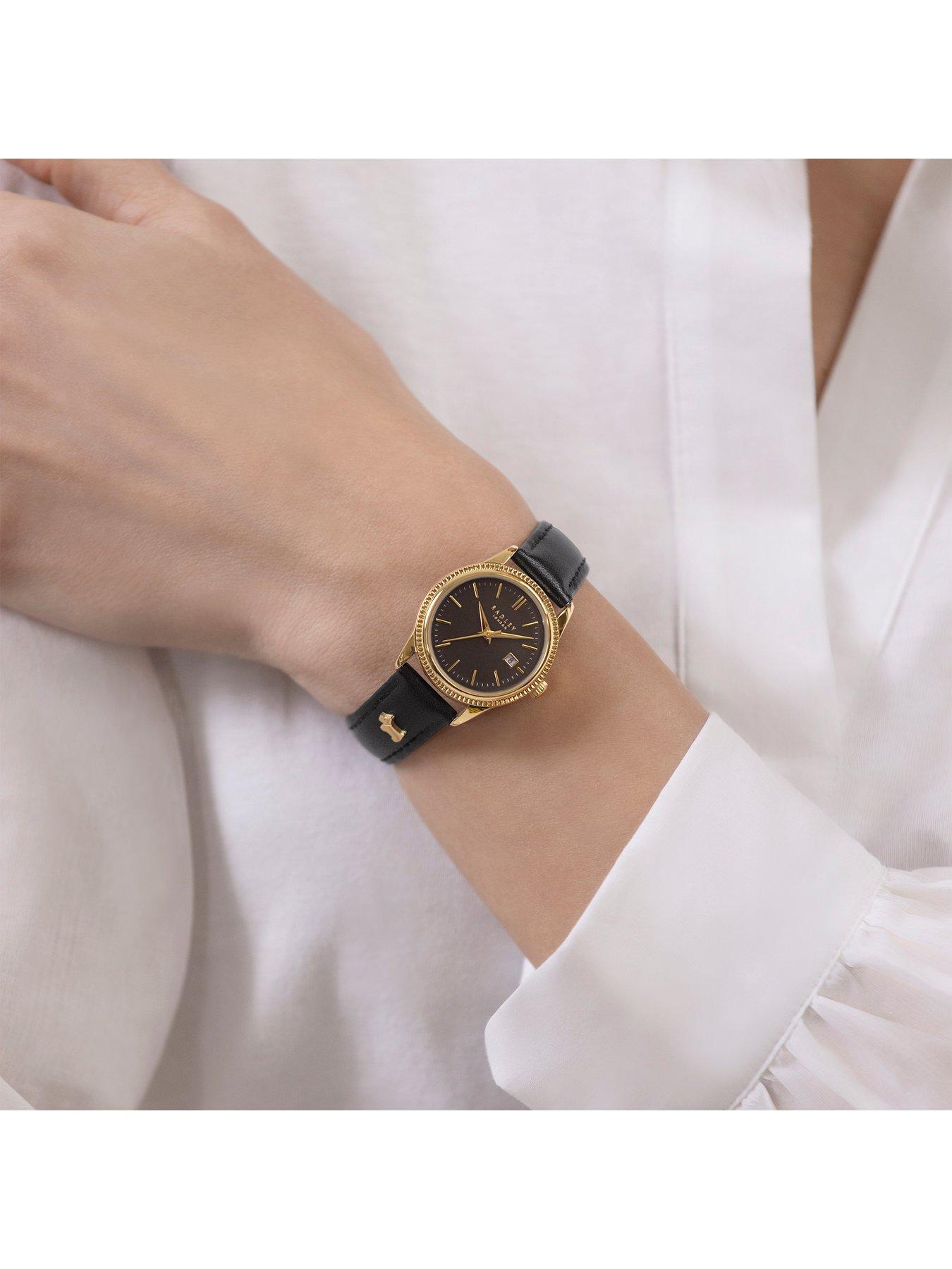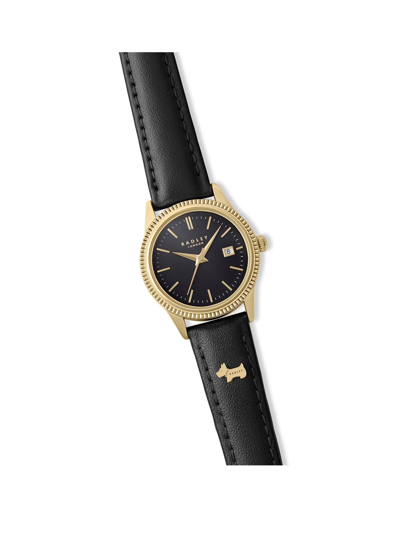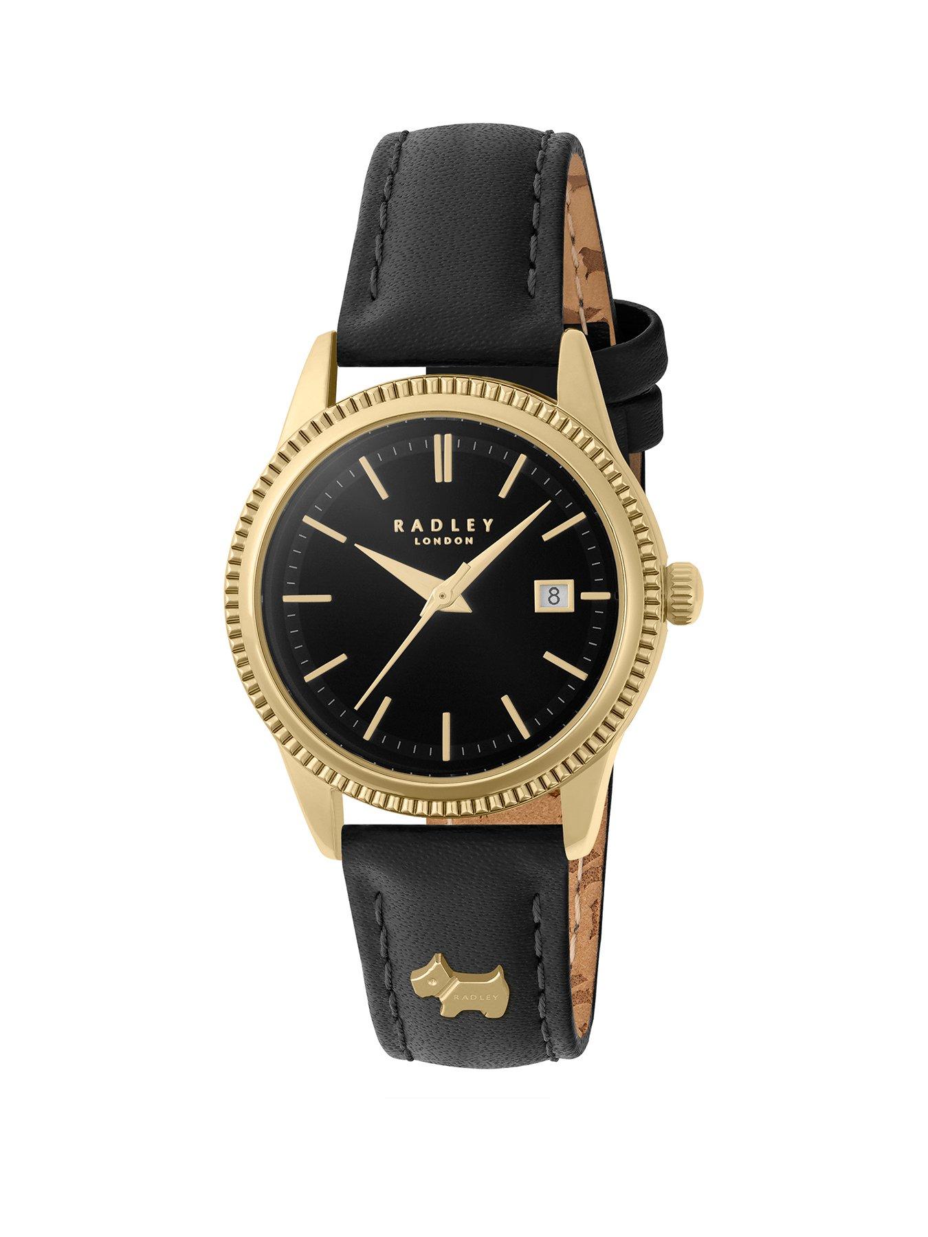 Radley Gold Plated Black Leather Strap WatchRadley Gold Plated Black Leather Strap Watch. This contemporary timepiece features a petite 28mm round pale gold plated case framed with a fine serrated bezel, black combination matte and satin dial finished with a matching black genuine leather strap and iconic Radley dog stud. Presented in a beautiful Radley London giftbox, with 2 year guarantee.