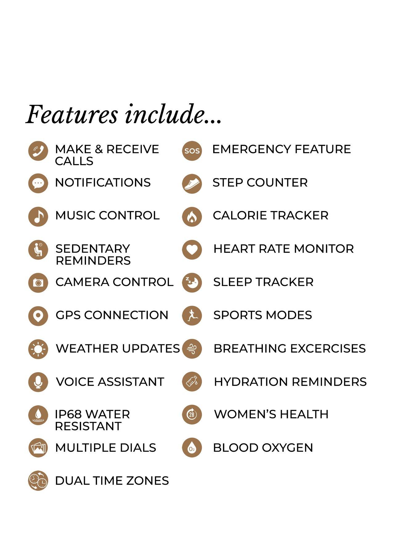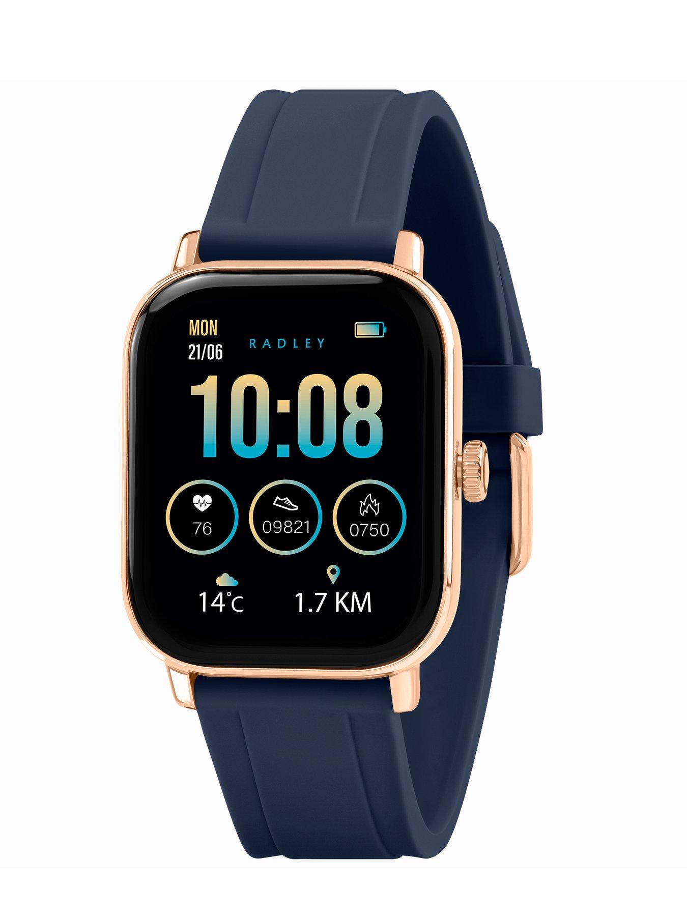 Radley Series 56 Ink Silicone Strap Smartwatch & Tws Set - TFT/CallingRadley Series 56 Smart watch allows you to stay connected with the convenience of hands-free calling, to make and receive calls directly from your watch anytime, anywhere. The Series 56 has a petite case and 1.75" full touch screen with a variety of interchange dials so you can personalise or customise by using your own photo. The Series 56 also offers an extensive range of lifestyle & wellness features, including step count, heart rate monitor, blood oxygen, cycle tracking, calories, sleep analysis, multiple sports tracking and more. Additionally, for your peace of mind, the watch includes an SOS feature that allows you to quickly sound an alarm and notify your emergency contact if you ever find yourself in need of help. Stay connected with call, message and social notifications, music control and GPS connection. The set also includes TWS Earbuds with Charging Case. The earbuds feature: Bluetooth Version 5.0, with over 15 hours of play time combined with case charge and 10m Wireless Range. iOS & Android Compatible. The Series 56 watch has a rose gold plated case with soft ink blue silicone strap. To explore the full range of Radley Series 56 features download the Radley app, compatible with Android 9.0+ and iOS 12.