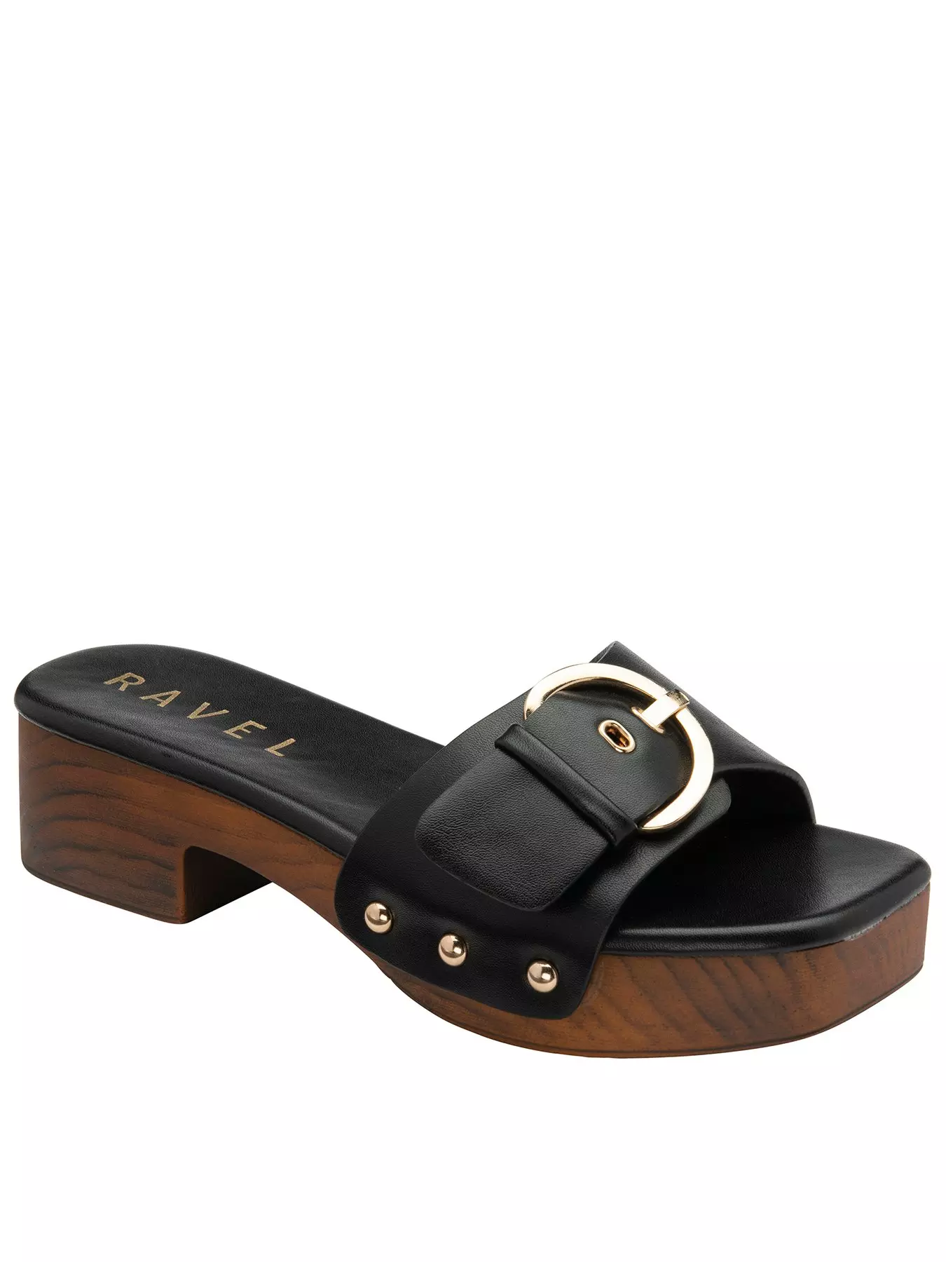 Stylish and easy to wear, the Risby heeled mule sandal by Ravel is a modern addition to any warm-weather wardrobe. Crafted in sleek black faux leather, this women's mule is defined by its statement oversized buckle, adding a contemporary edge to its clean, minimalist design. Set on a comfortable 4.5cm heel with a wood-effect finish, Ravel's Risby heeled mule offers subtle height while remaining wearable throughout the day. The slip-on silhouette makes it effortless to style, pairing seamlessly with tailored trousers, denim or flowing dresses. Versatile and fashion-forward, this black mule sandal delivers polished style with minimal effort.- Heel Height: up to 2.5 Inch