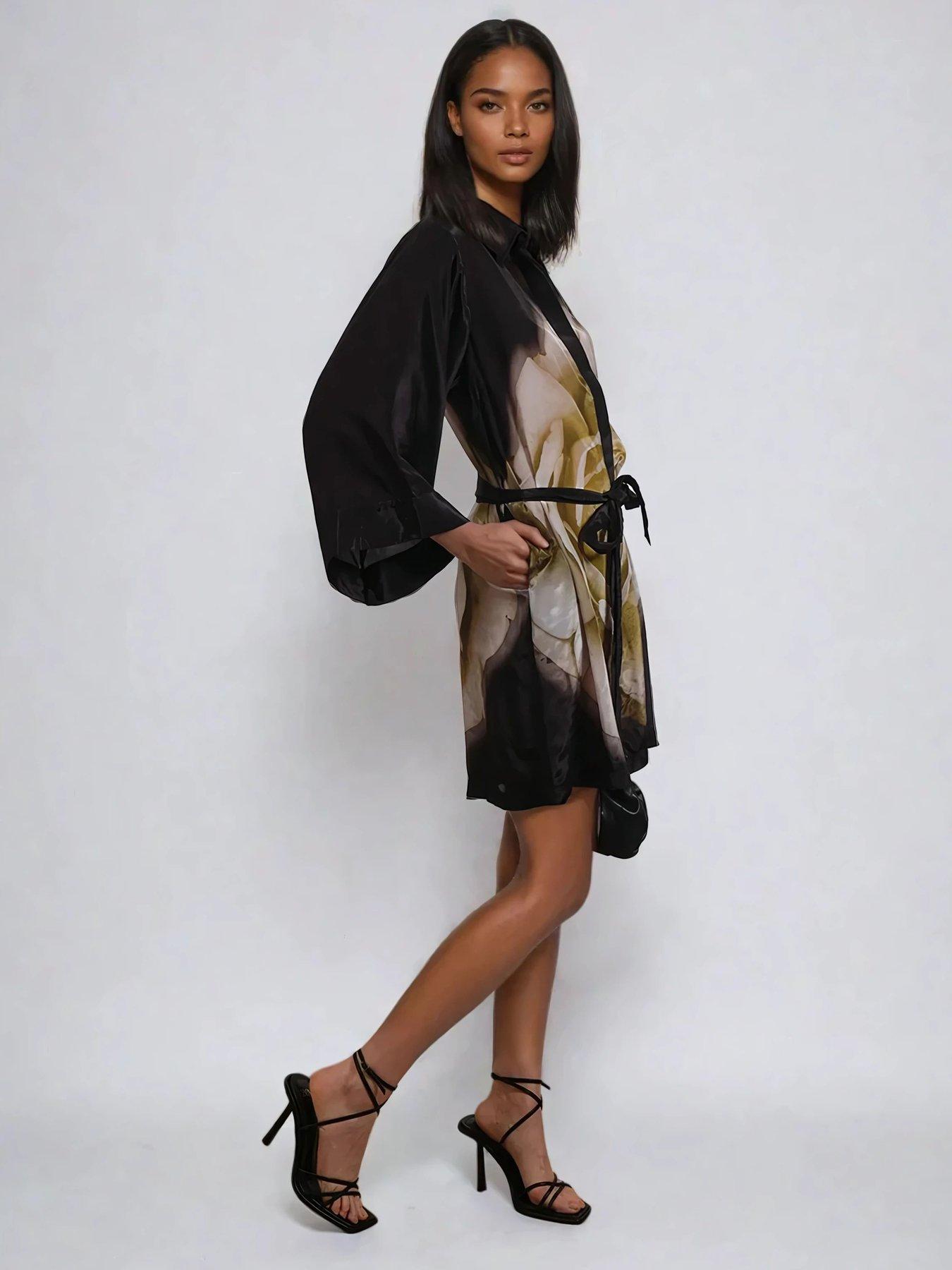 Religion Coco Tunic With Large Floral Placement - BlackThe Coco tunic is a statement piece with assured appeal in our large floral Glow print in green tones on a black base. Our best-selling shape, this style is made from a silk-like fabric and features a grandad collar, button through placket, short sleeves and pockets. Wear as a dress with or without the belt, or open layered over a top and jeans as a layering tunic style. This is an oversized style, please go down 1 size if you like it better less oversized. The model is wearing a size UK 10 Length from the top: 90 cm This style needs a gentle steam before trying it on as the shipping might have caused creasing.