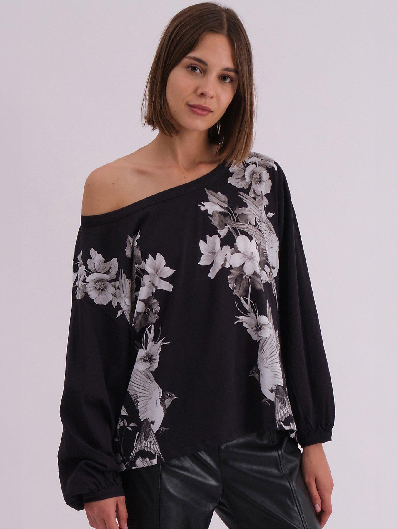 Religion Off The Shoulder Inversion Top With Swallow Placement PrintOpt for the Inversion Off the shoulder top, featuring a beautiful floral and swallow placement print. This oversized-fit top is made from soft cotton jersey and features a round neck that can be worn on or off the shoulder, as well as batwing sleeves.Wear it with skinny jeans or our Force leather flares for a relaxed fashionable look. Model wears size 1 Length: 62 cm