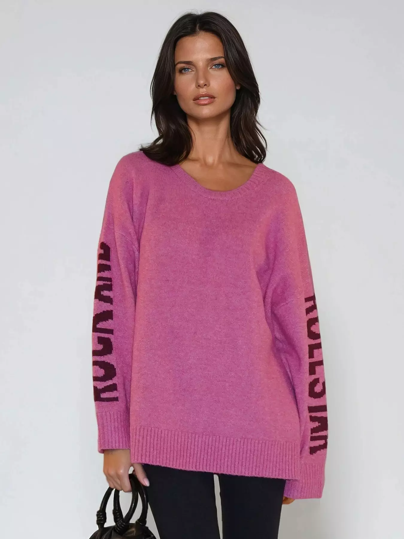 We reimagined our slogan knit this season with the Stardust jumper in a Pop of pink and port writing. Crafted from a thick wool mix yarn, this oversized jumper features a crew neck, long sleeves and is hip length. The Rock n Roll Star slogan on the sleeves gives it an edge. Wear with leggings or our Ida leather leggings for an easy day to night look.The model wears a size UK 10.