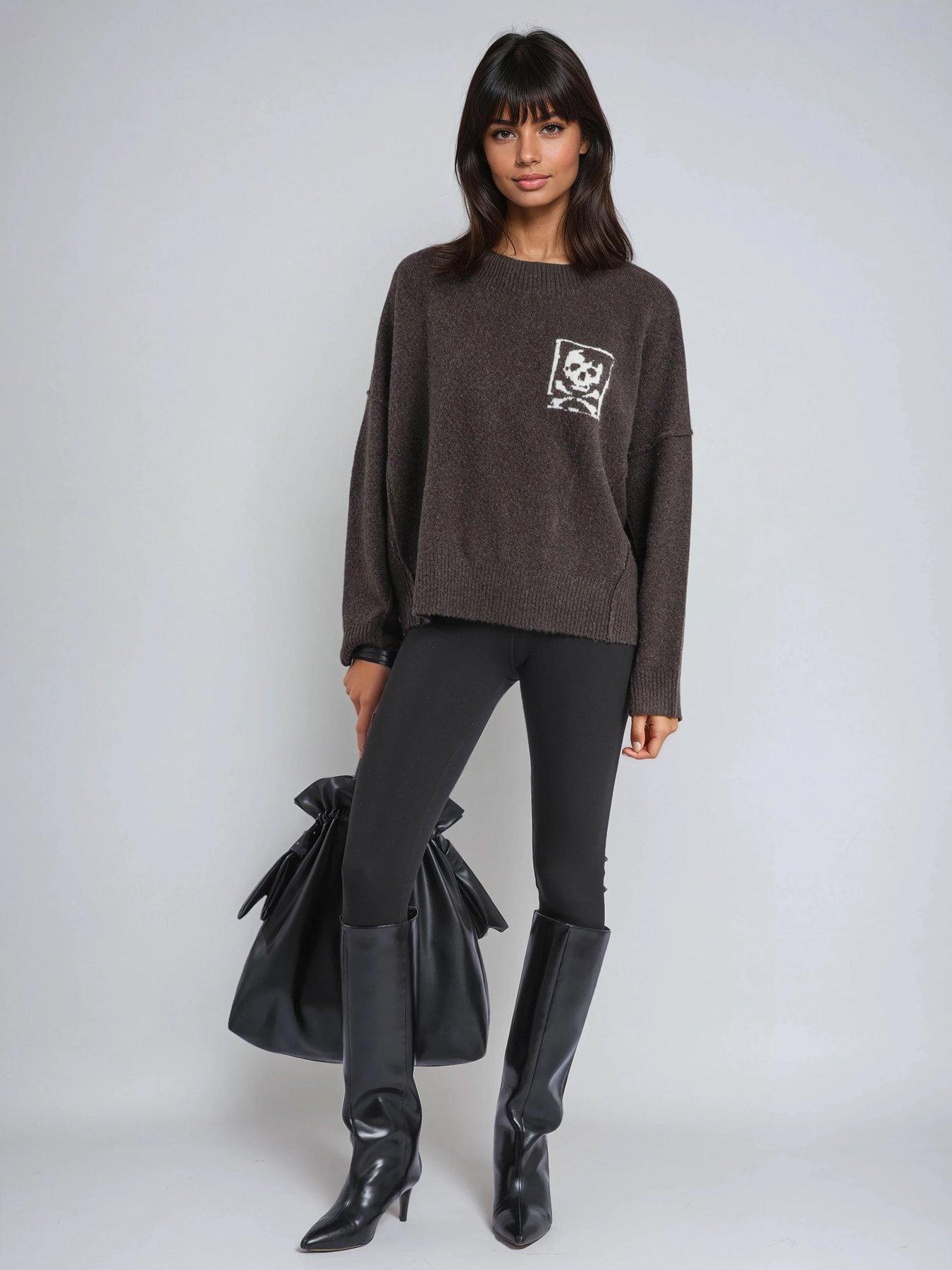 Religion Skull Jacquard Jumper - BrownOur stylish Luscious jumper is made from a soft wool mix yarn which ensures ultimate comfort and warmth. The skull and cross bones jacquard on the chest add a touch of cool, while the seam detailing adds a refined element to the design. This jumper boasts an oversized fit, mock neck, and hip-length cut with long sleeves. Perfect for a cosy quiet luxury look, pair it with the matching Luscious trousers to complete the ensemble or dress it up with a jacket for travel chic.The model wears a size 10. Length from the top: 58 cm