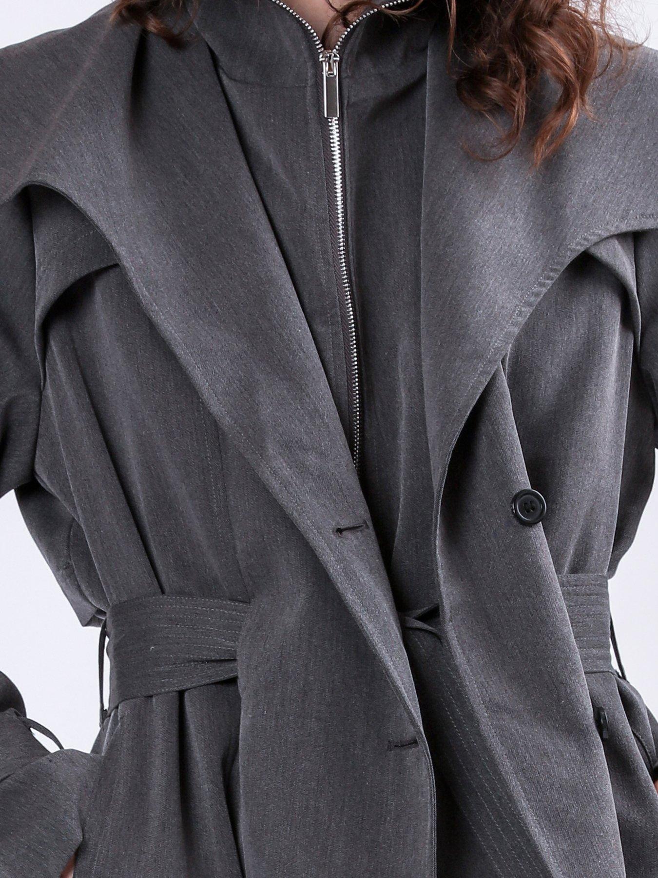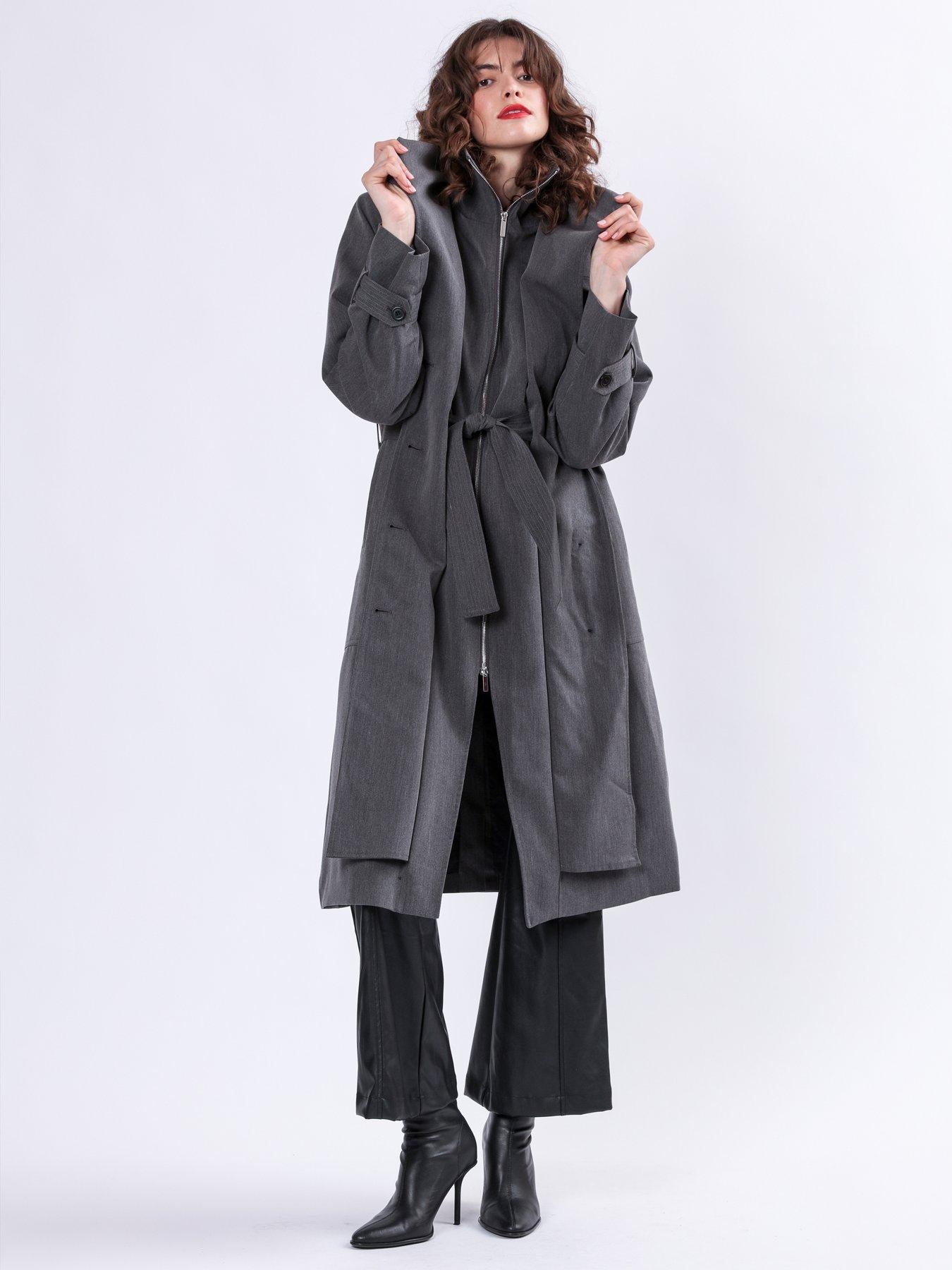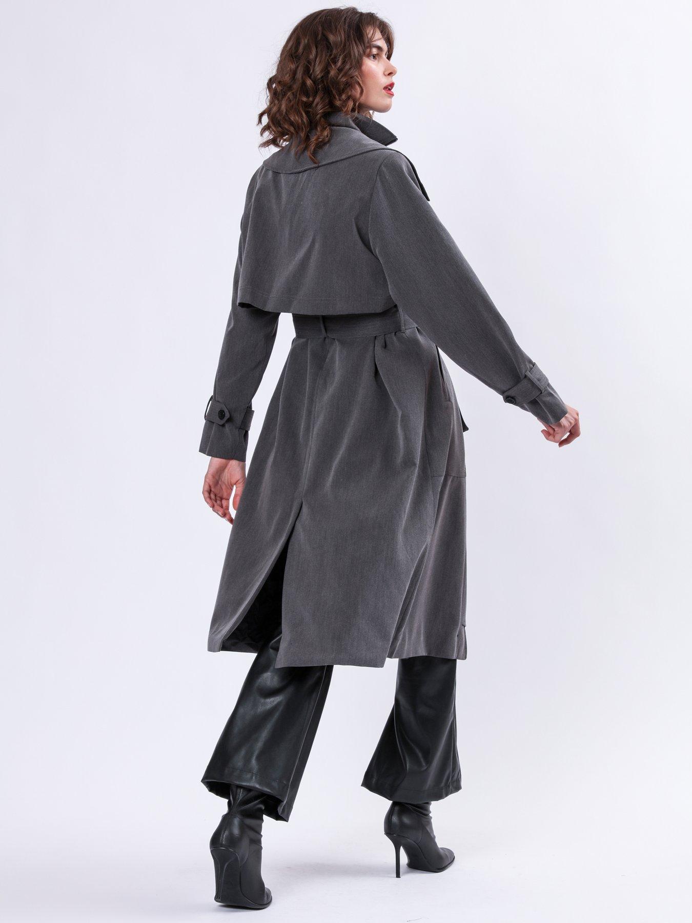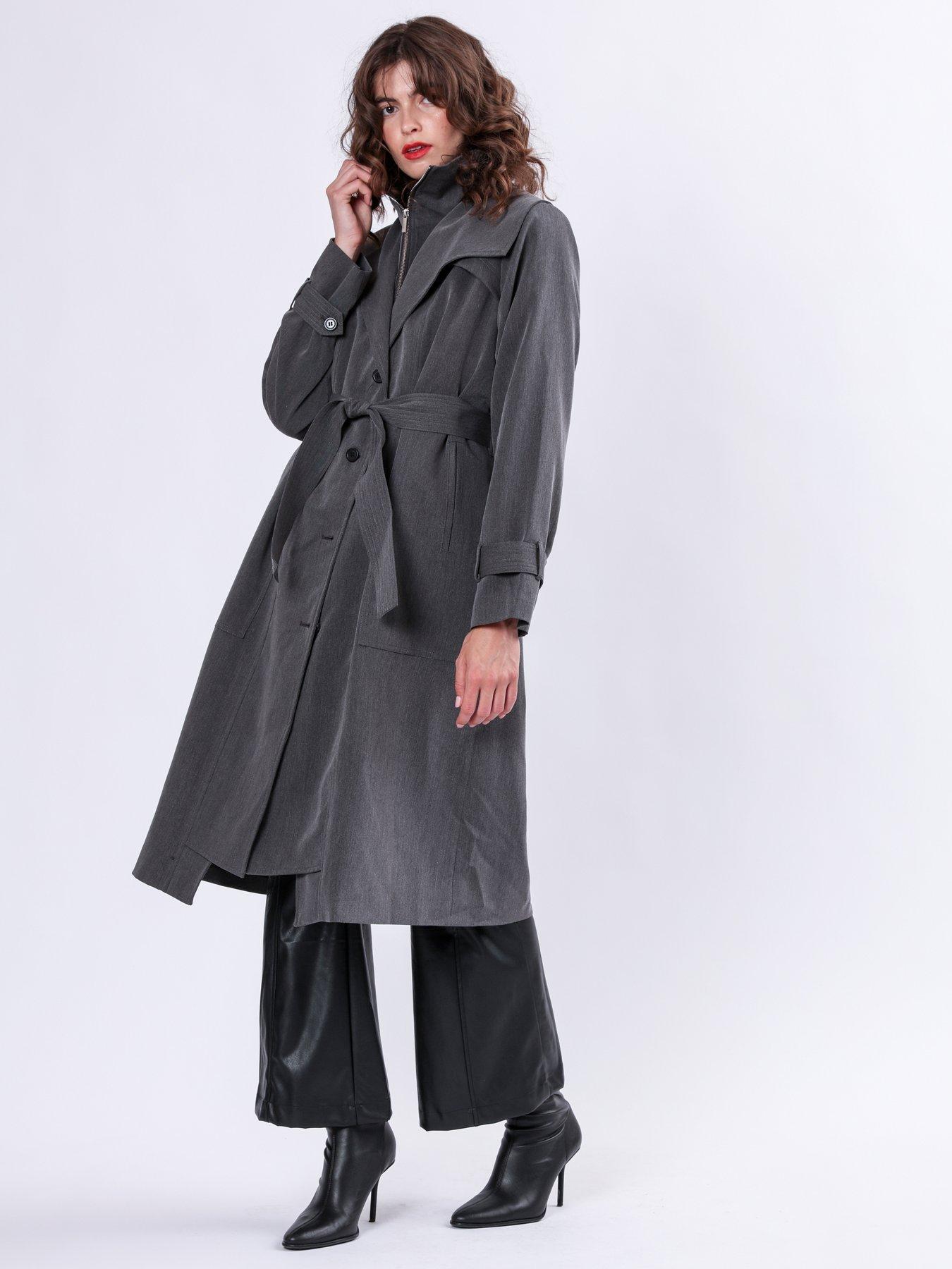 Religion Spirit Maxi Trench Coat With Draped Double Layer And BeltThe Spirit Mac is an outerwear investment that is sure to become a seasonal favourite, made in a soft but structured crepe fabric. This easy fit Trench Coat features a double fastening with a funnel zip and buttons, a belt in the waist that can be worn through the loops or over the front draped flaps, side pockets and adjustable sleeve ''belt'' details.The length of the coat is over the knee and it is fully lined. A stylish option for those transitional weather days and available in Charcoal grey and Taupe. The model wears a size 10 Length from the top: 114 cm