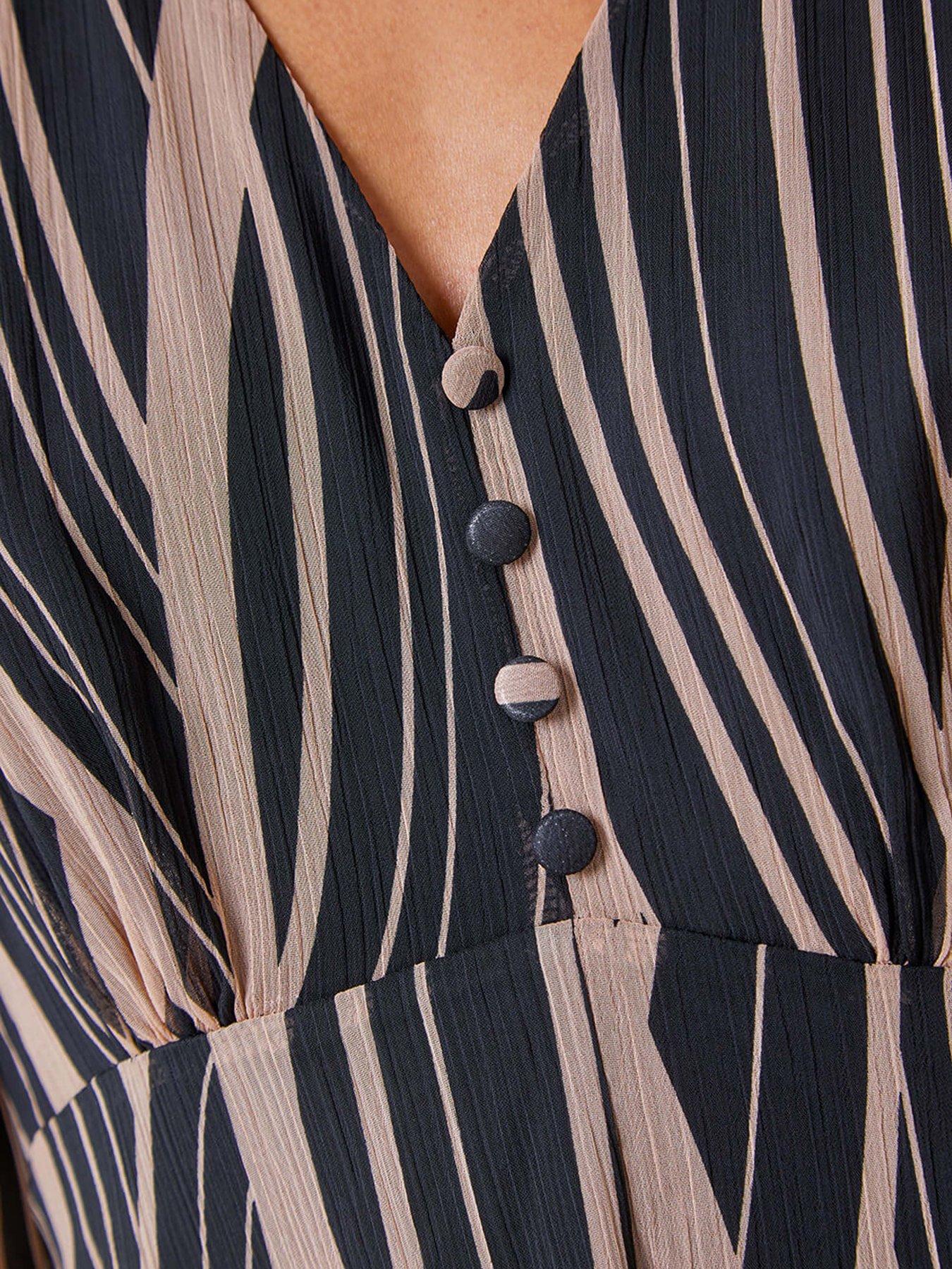 Roman Abstract Chiffon Wrap Asymmetric Midi Dress - BlackThis abstract print chiffon dress is bound to become a wardrobe staple this season. With its neutral colour palette, ¾ length sheer sleeves with ruched detail at the cuffs this dress has a feminine v neckline. A flattering hanky hem and delicate button detail at the bust finish it off beautifully. Add heels and a leather jacket for after work drinks!